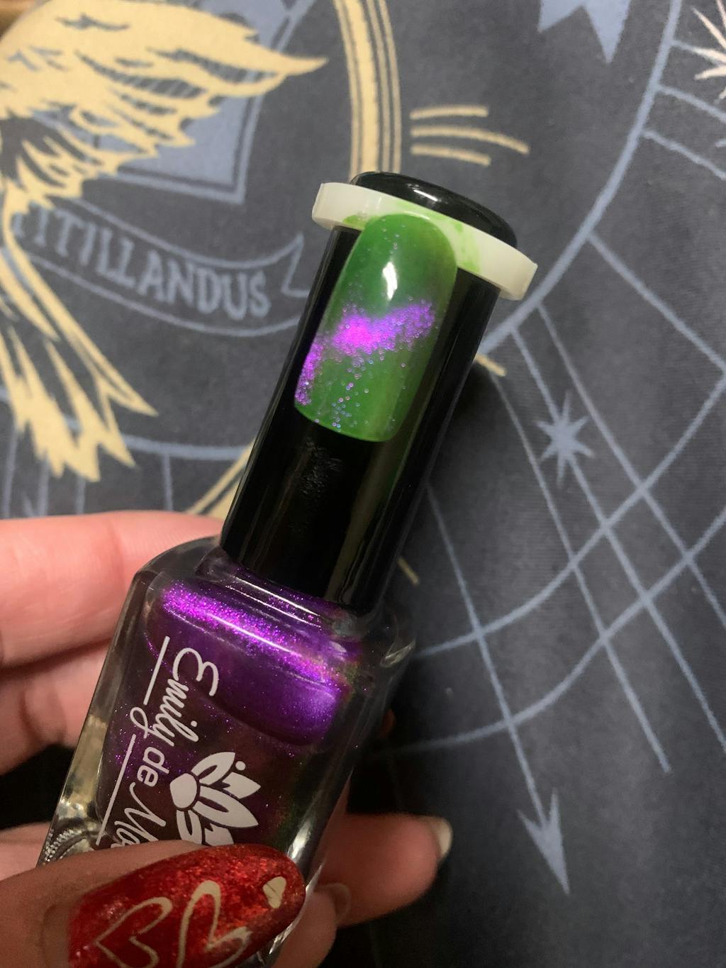 A clear nail polish with a purple / pink / gold / green shifting magnetic effect.