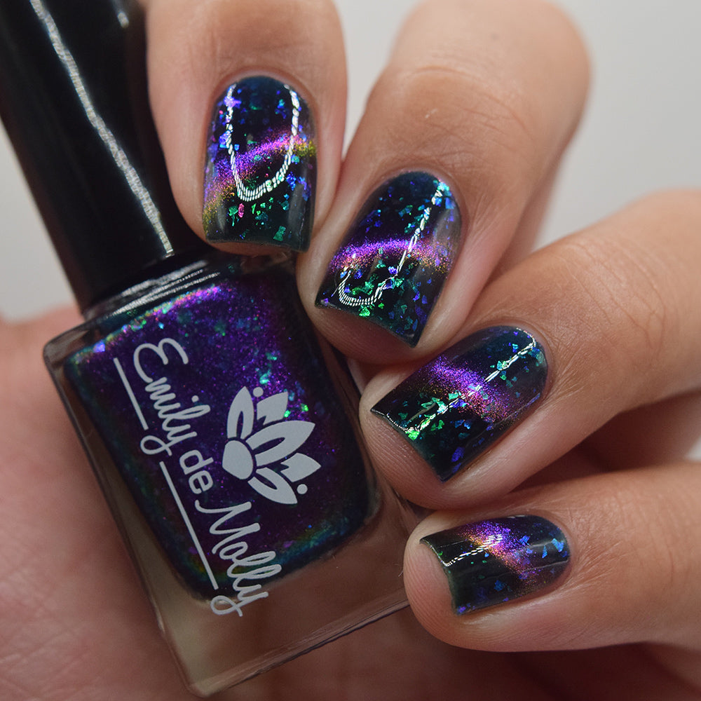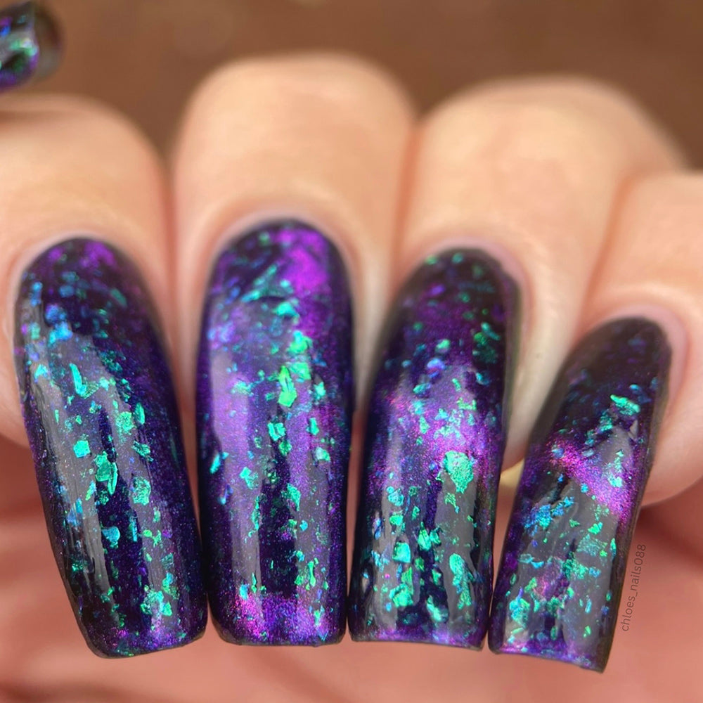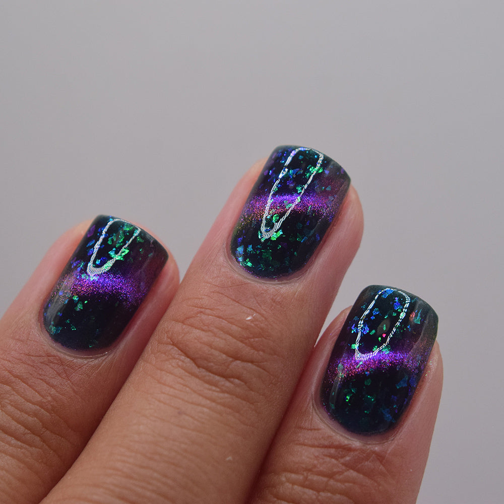 A dark navy nail polish with green / blue shifting iridescent flakes and a purple / pink / gold shifting magnetic effect.