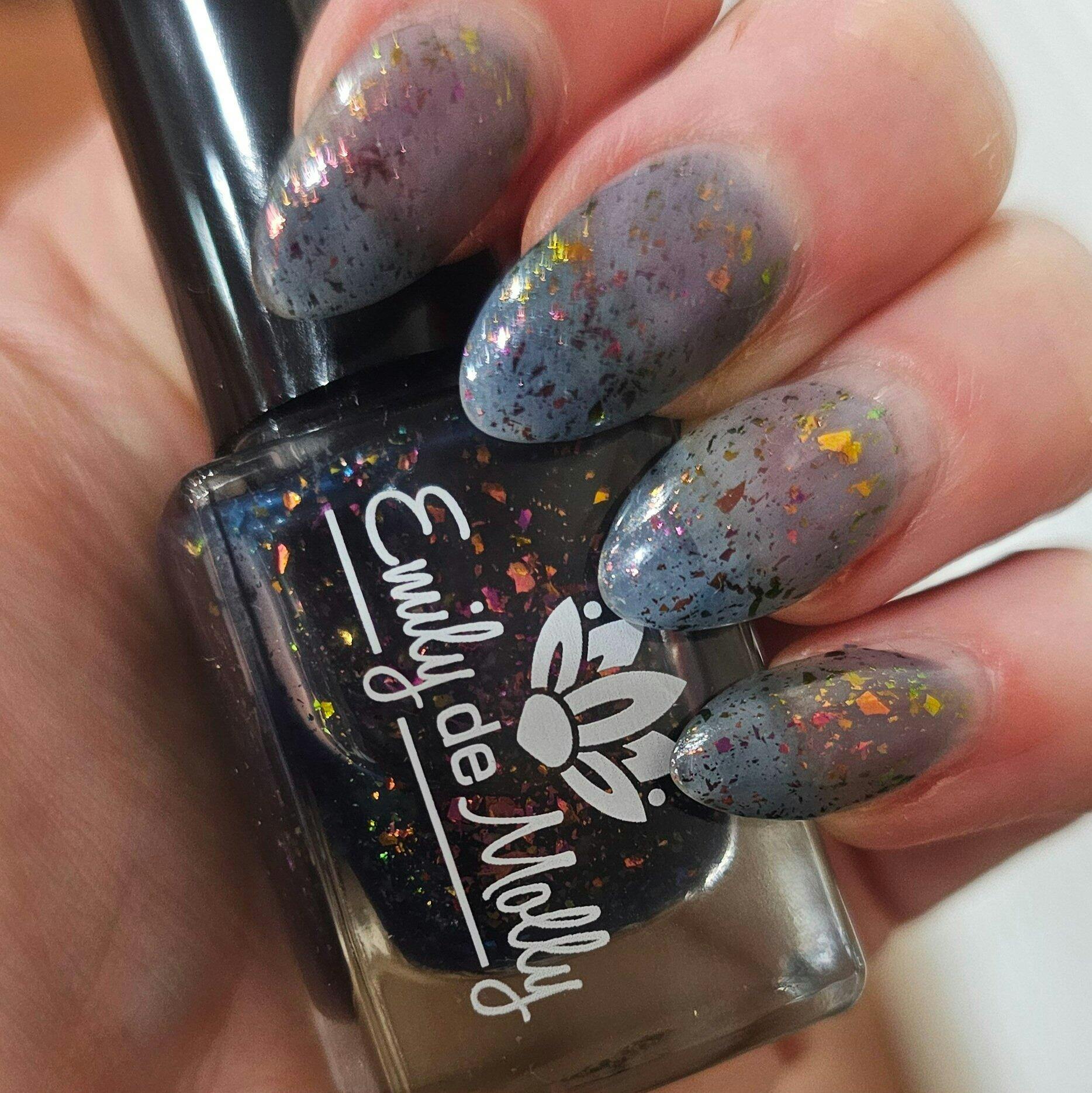 A sheer deep navy nail polish with pink / gold / green shifting multichrome flakes.It has a buildable formula but it is not designed to be fully opaque, top coat recommended for a glossy finish.