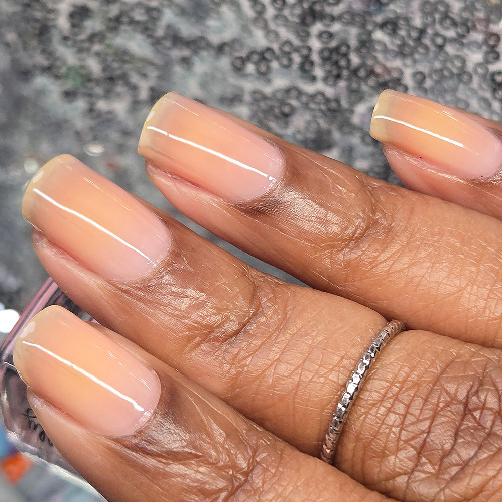 A light pink jelly nail polish.It has a buildable formula but it is not designed to be fully opaque, topcoat recommended for a glossy finish.
