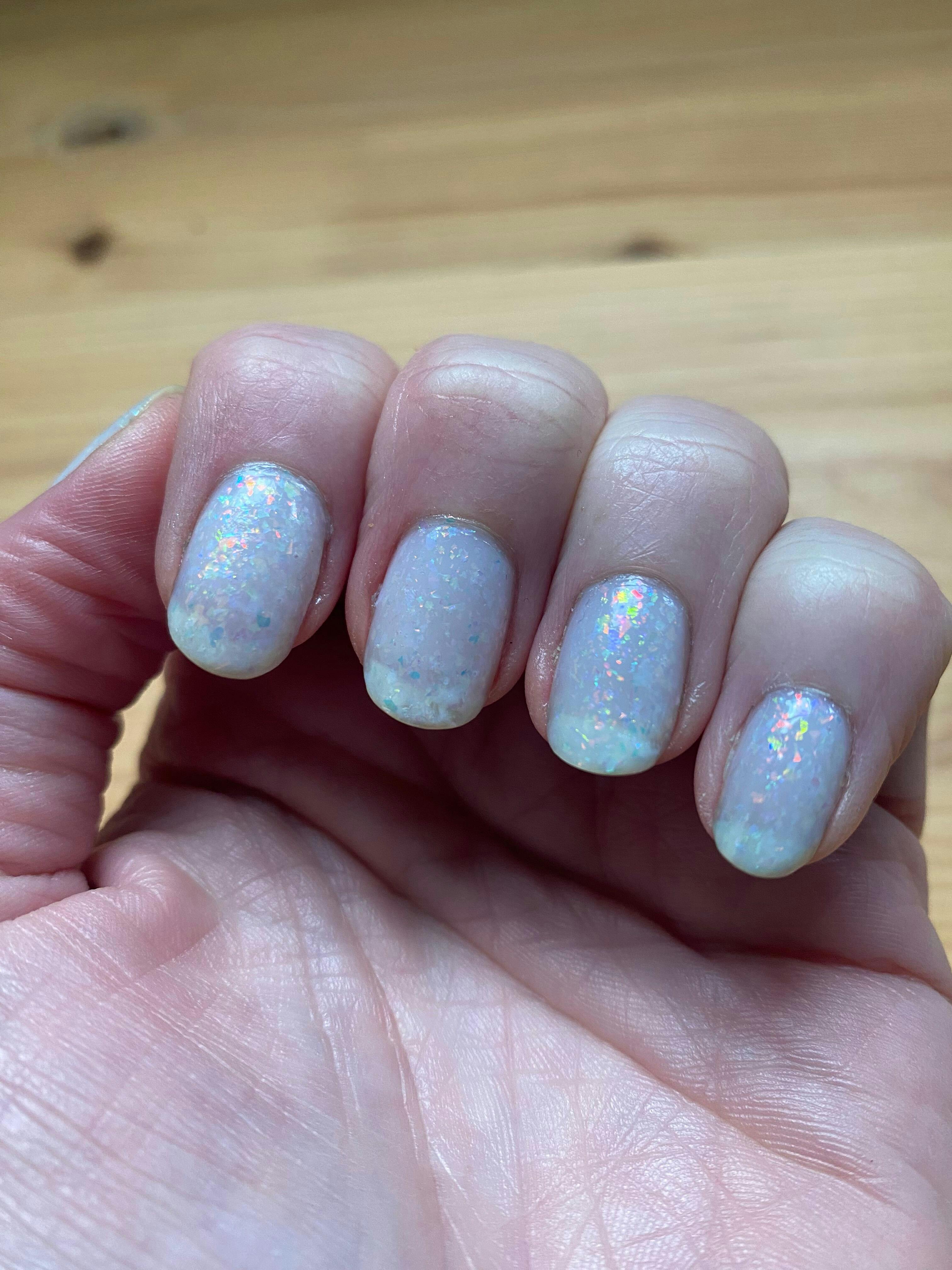 It has a buildable formula but it is not designed to be fully opaque, top coat recommended for a glossy finish.