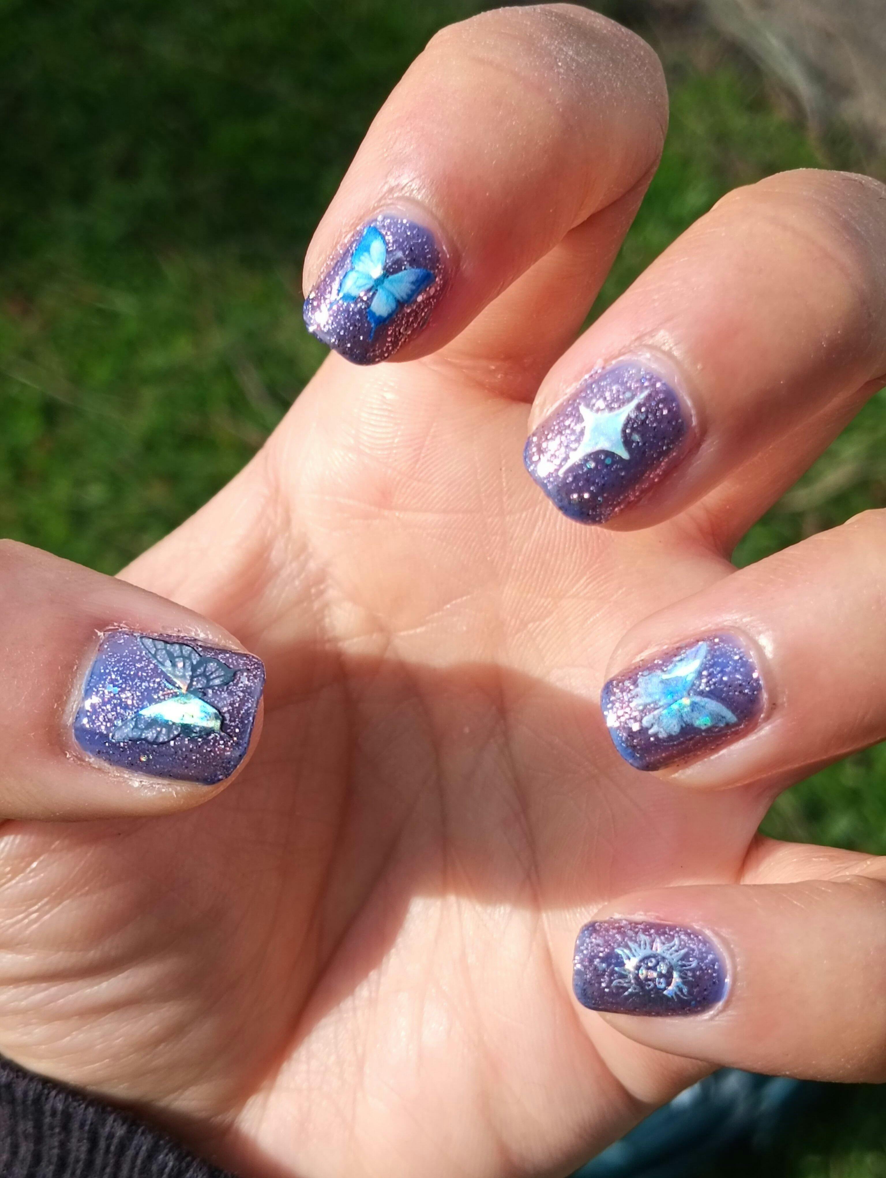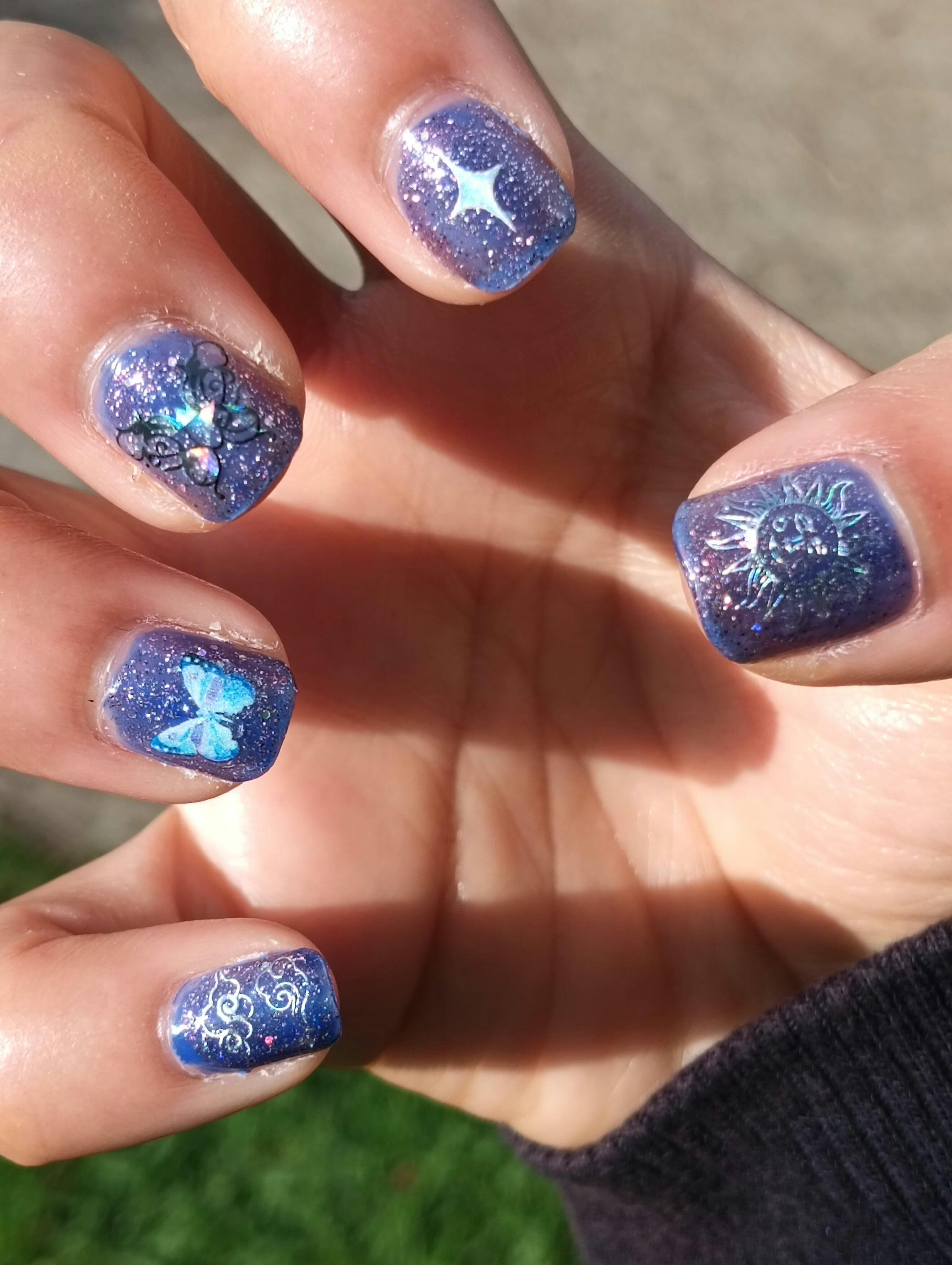 A sheer deep ultramarine blue jelly nail polish with a transparent finish. It has a buildable formula but it is not designed to be fully opaque.