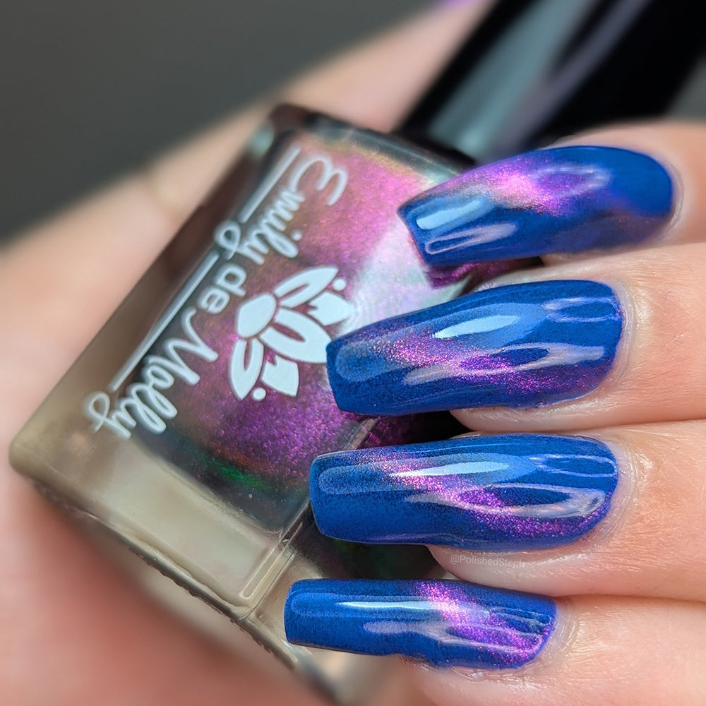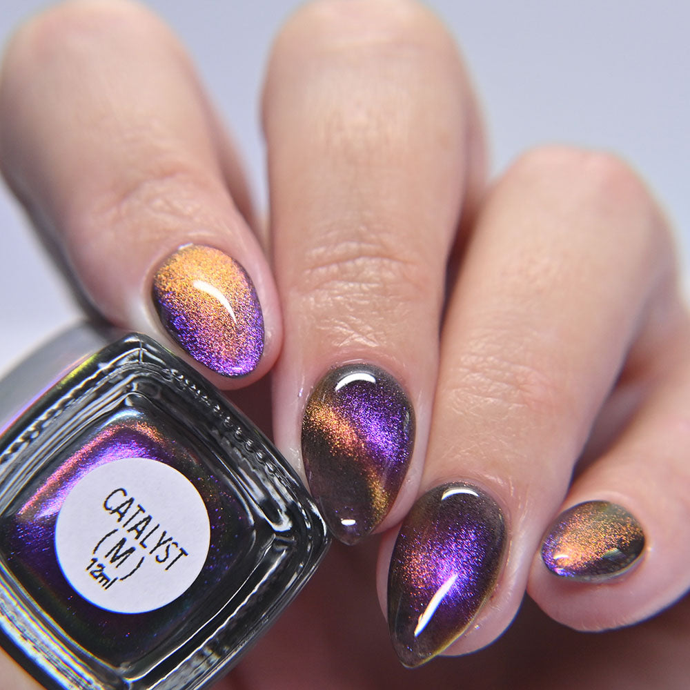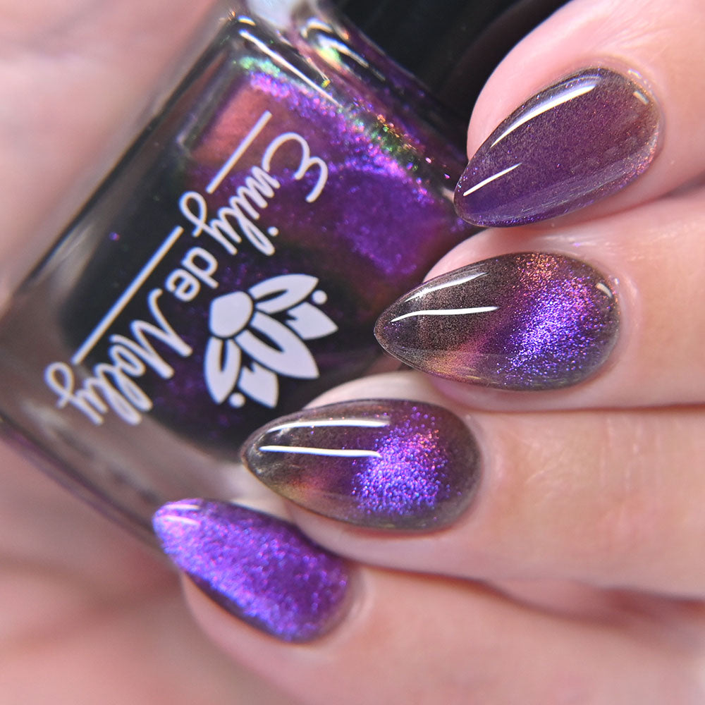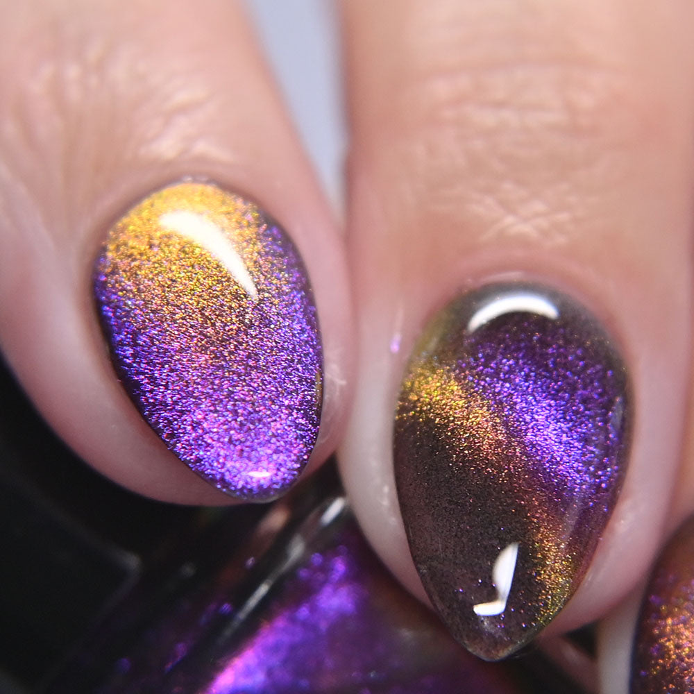 A clear nail polish with a purple / pink / gold / green shifting magnetic effect.