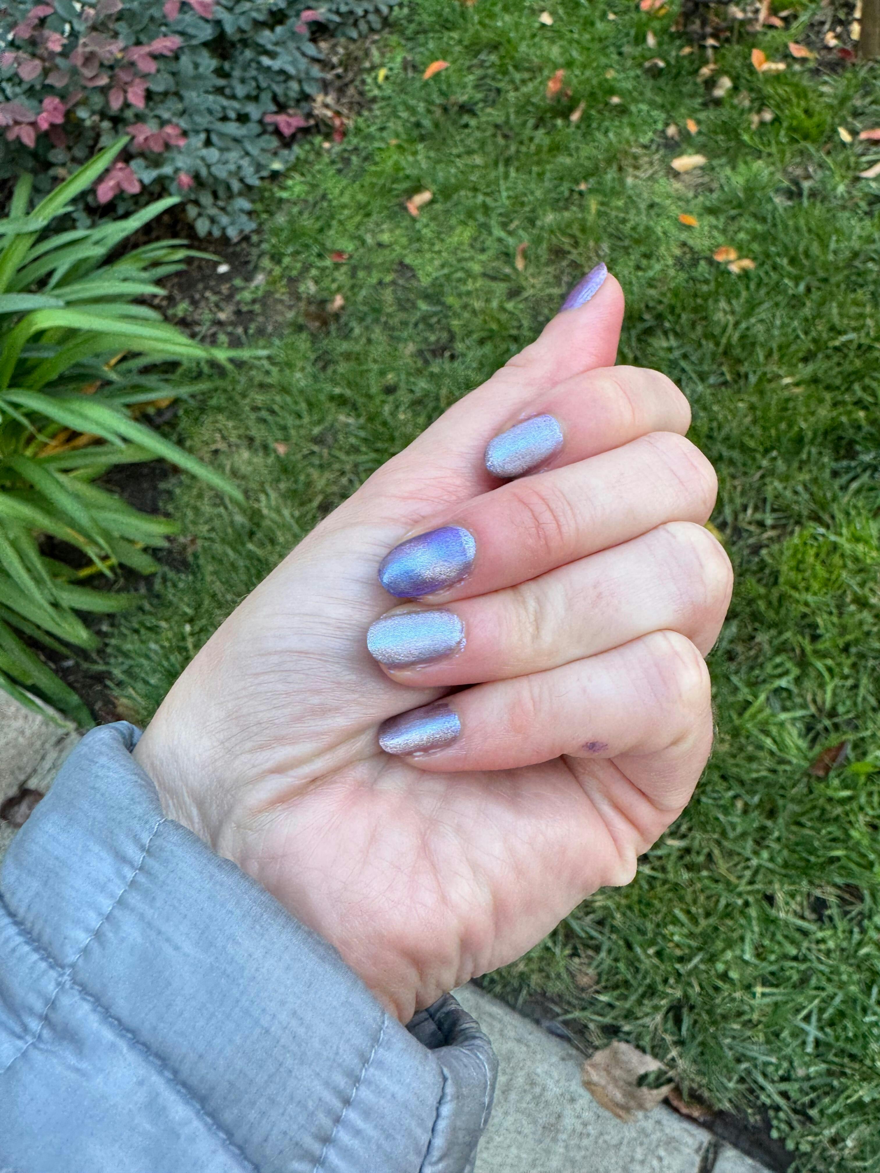 A very light brown nail polish with a blue shimmer and a silver magnetic effect.