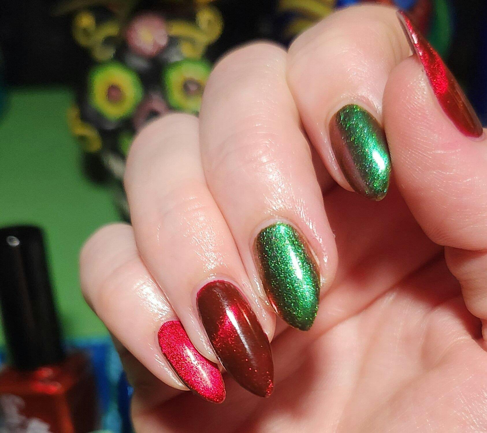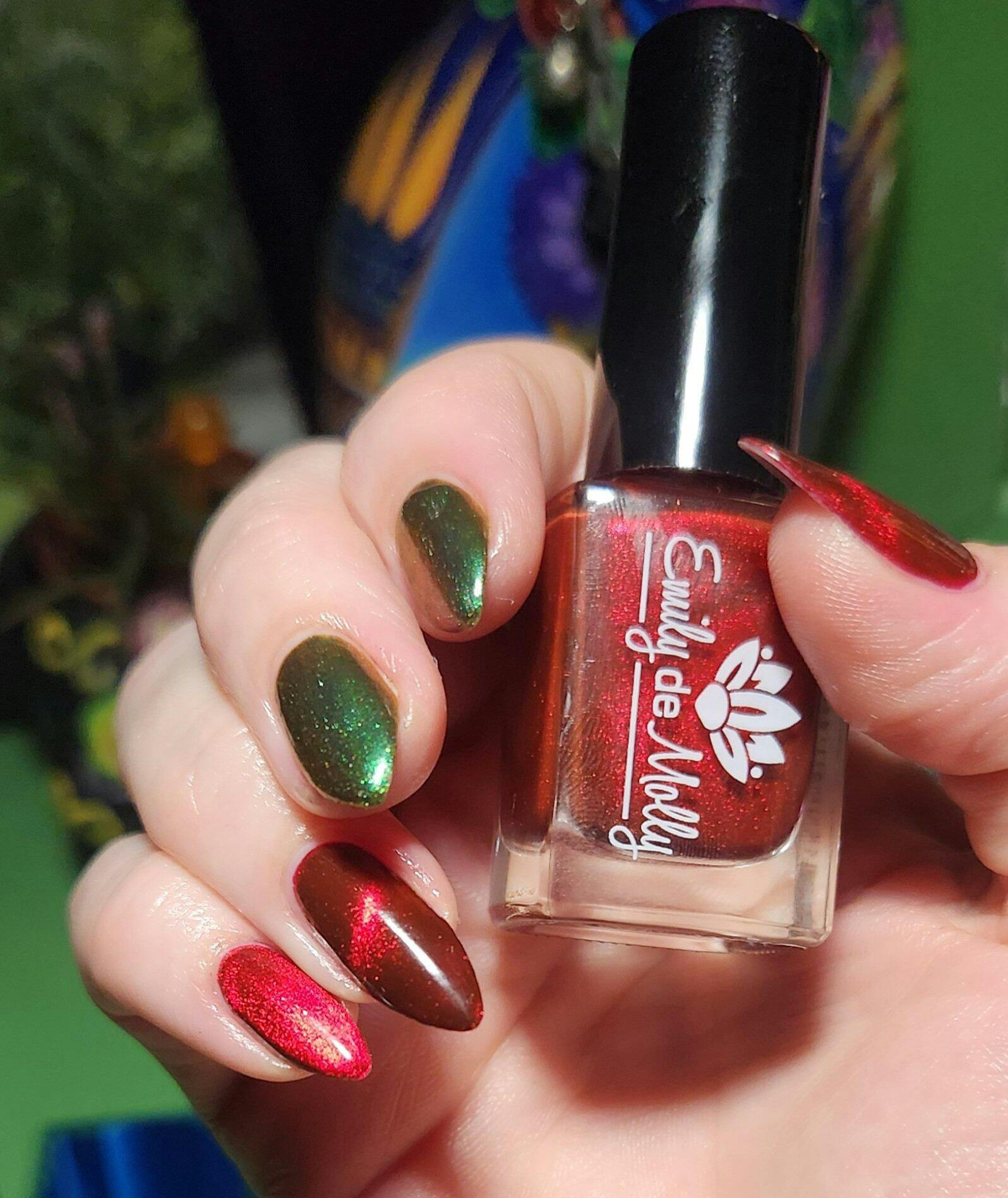 A deep red nail polish with a red to orange shifting magnetic effect.