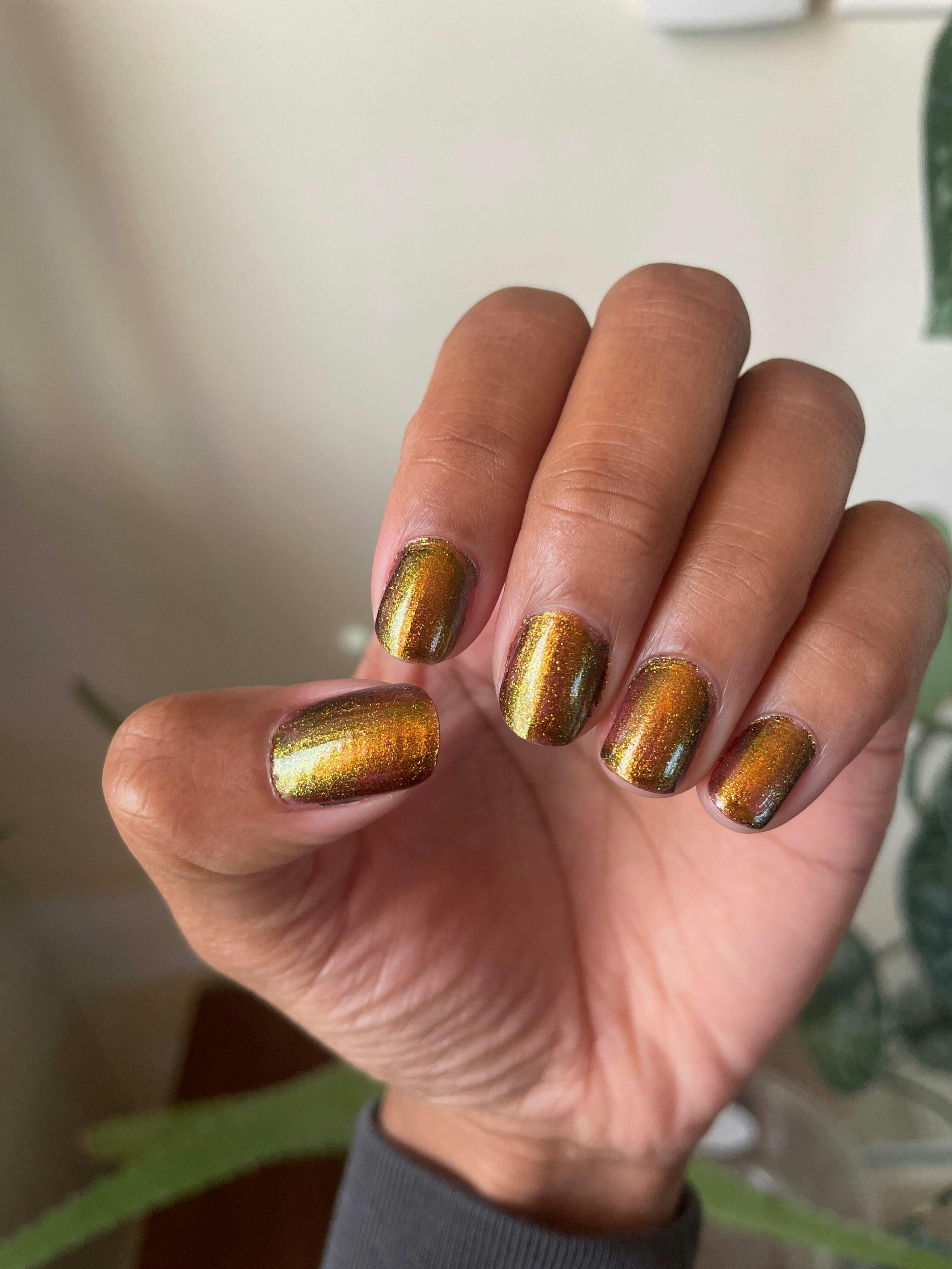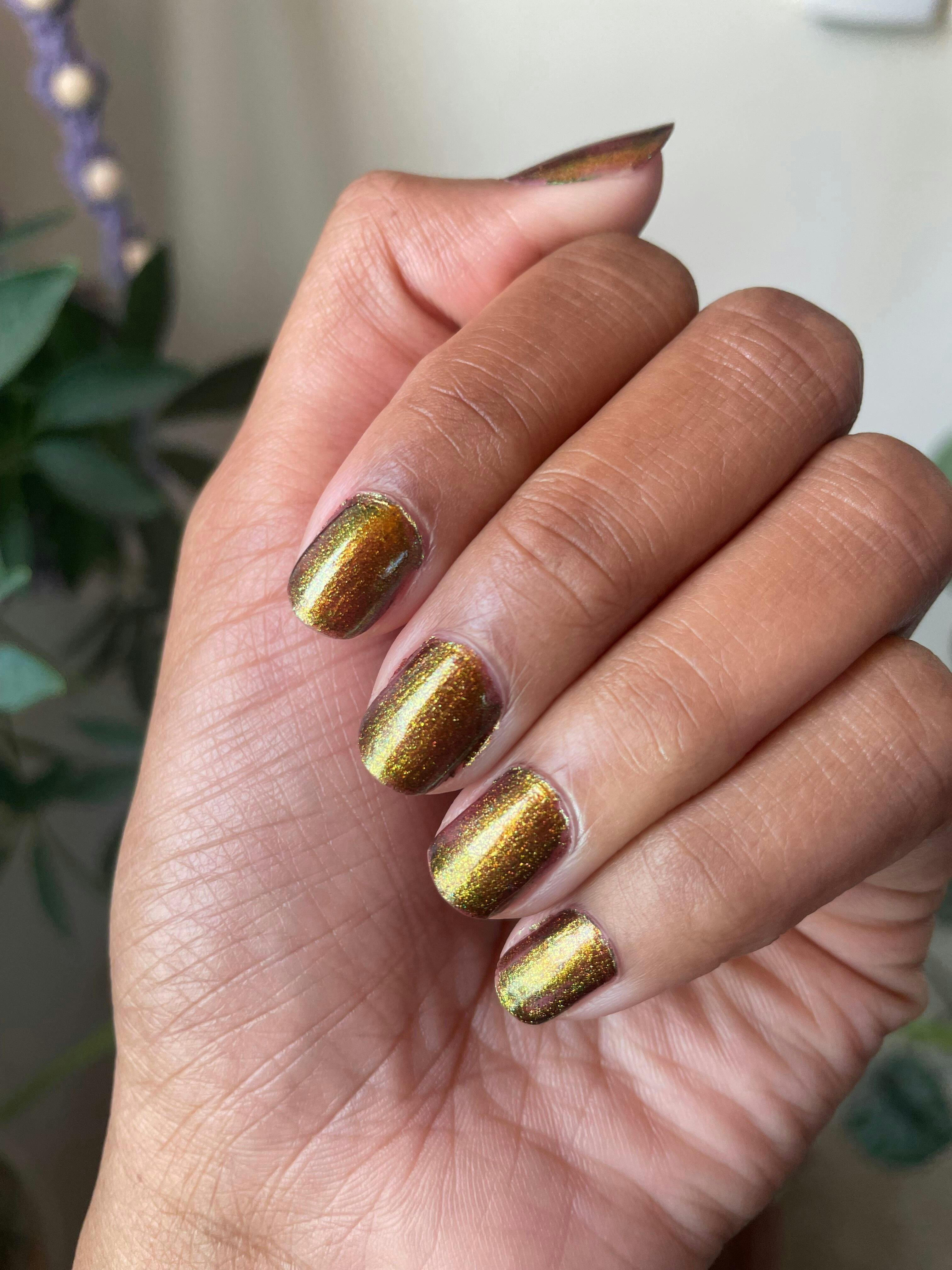 A multichrome nail polish that shifts from bronze to green, to a dark blue.