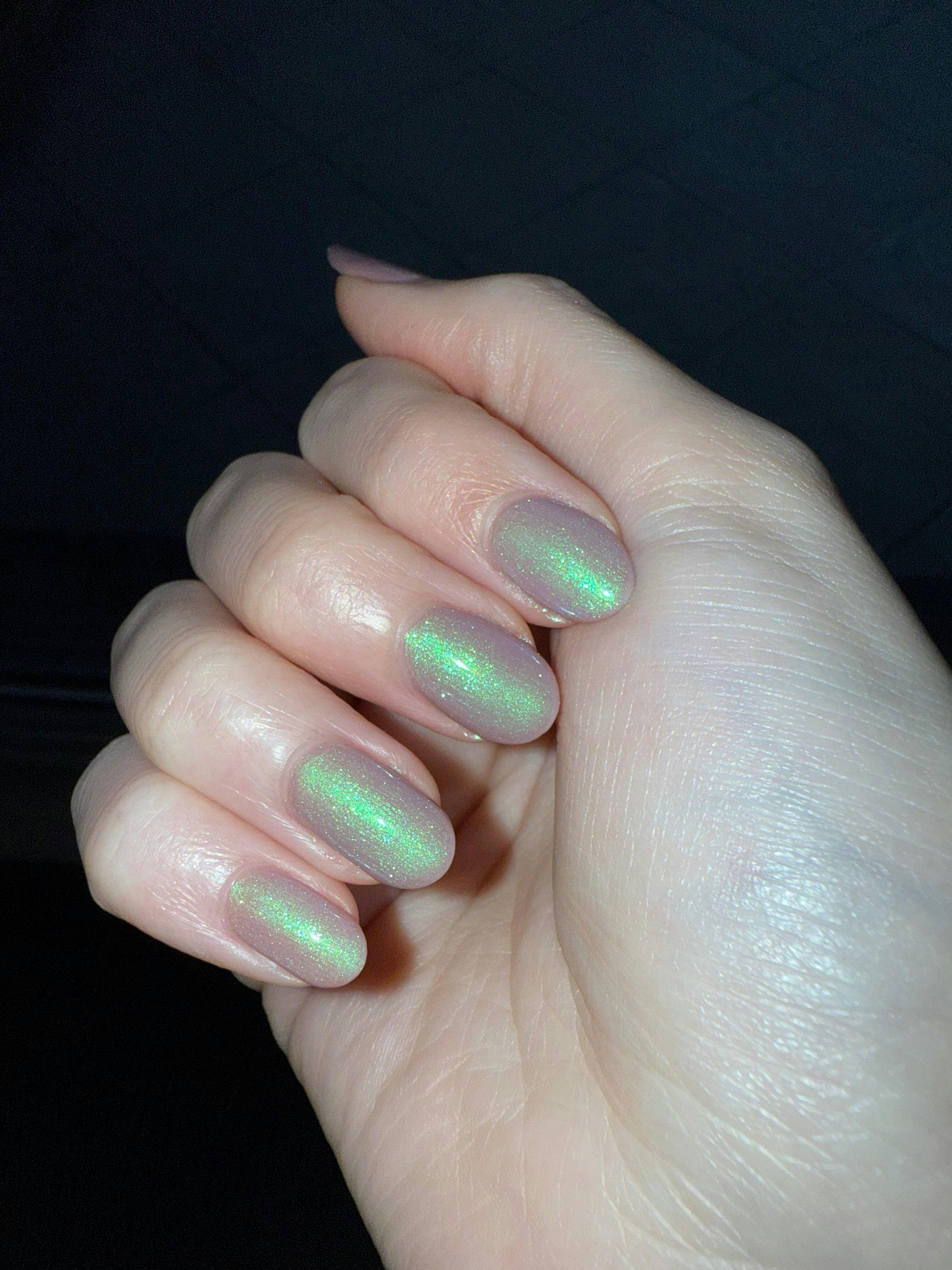A pale mauve brown nail polish with a green / blue / purple shifting shimmer.
