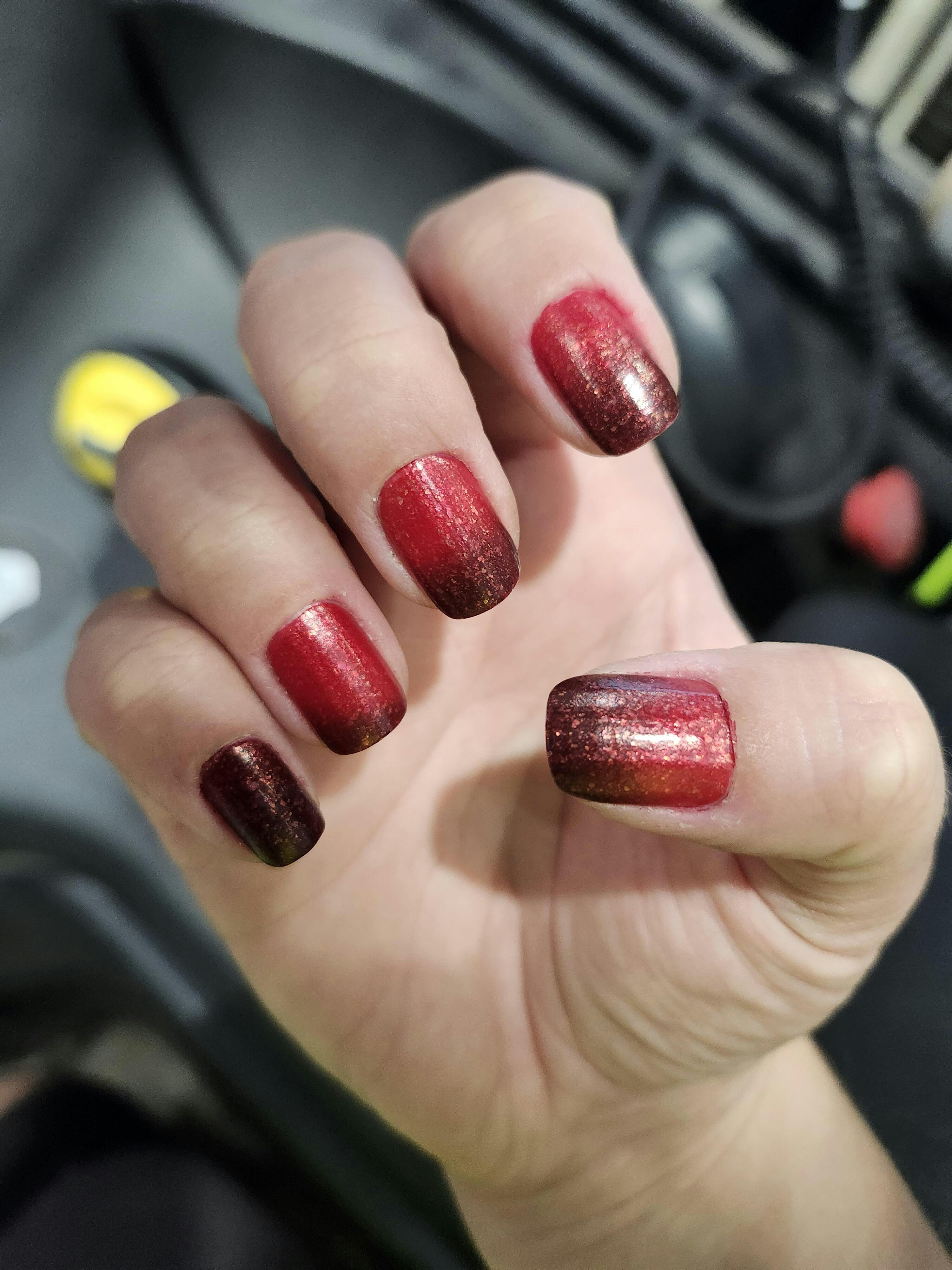 A bright red ( warm ) to dark brown ( cold ) thermal with gold flakies.