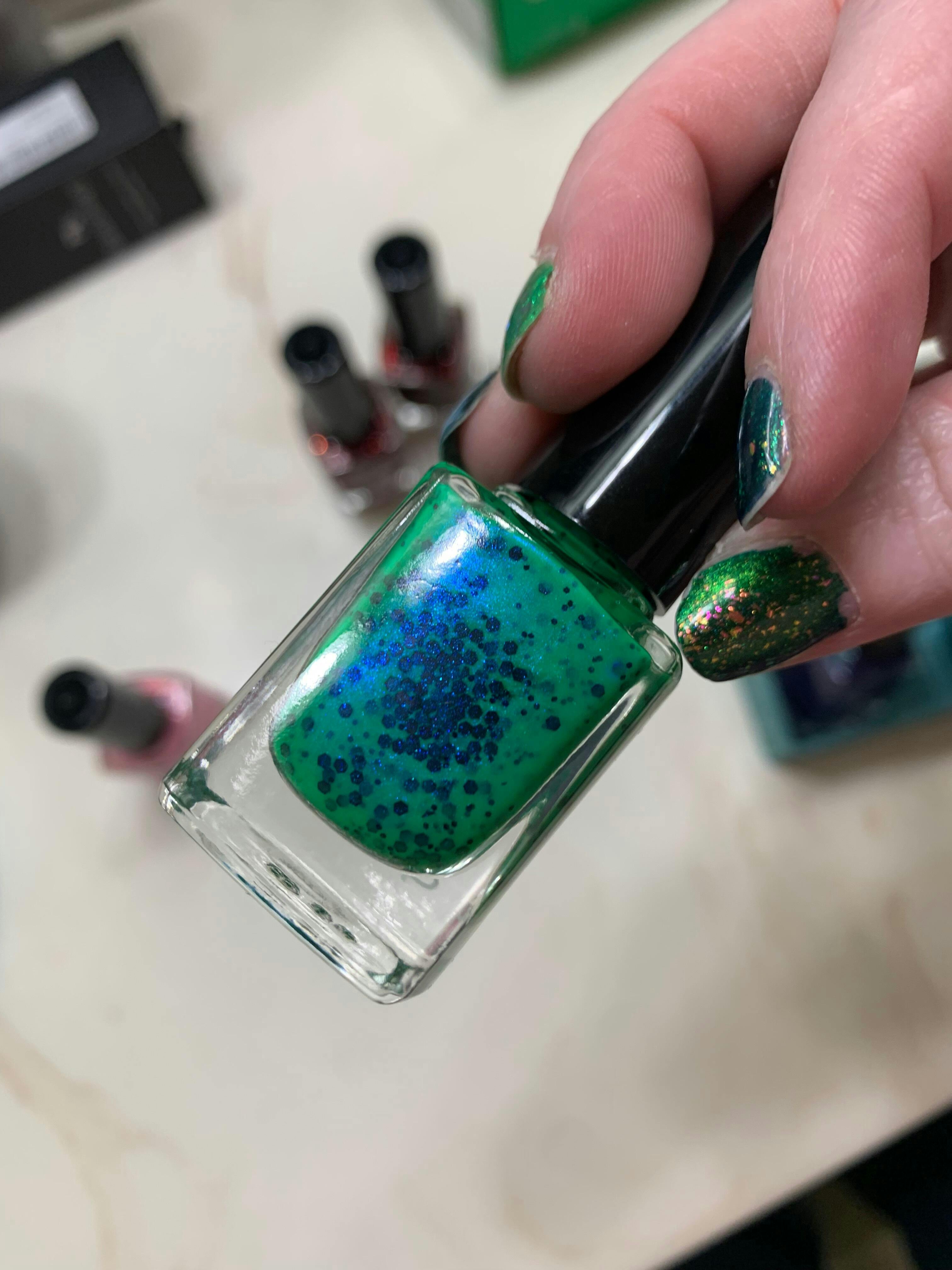 A neon green nail polish with a blue aurora shimmer and black glitters.