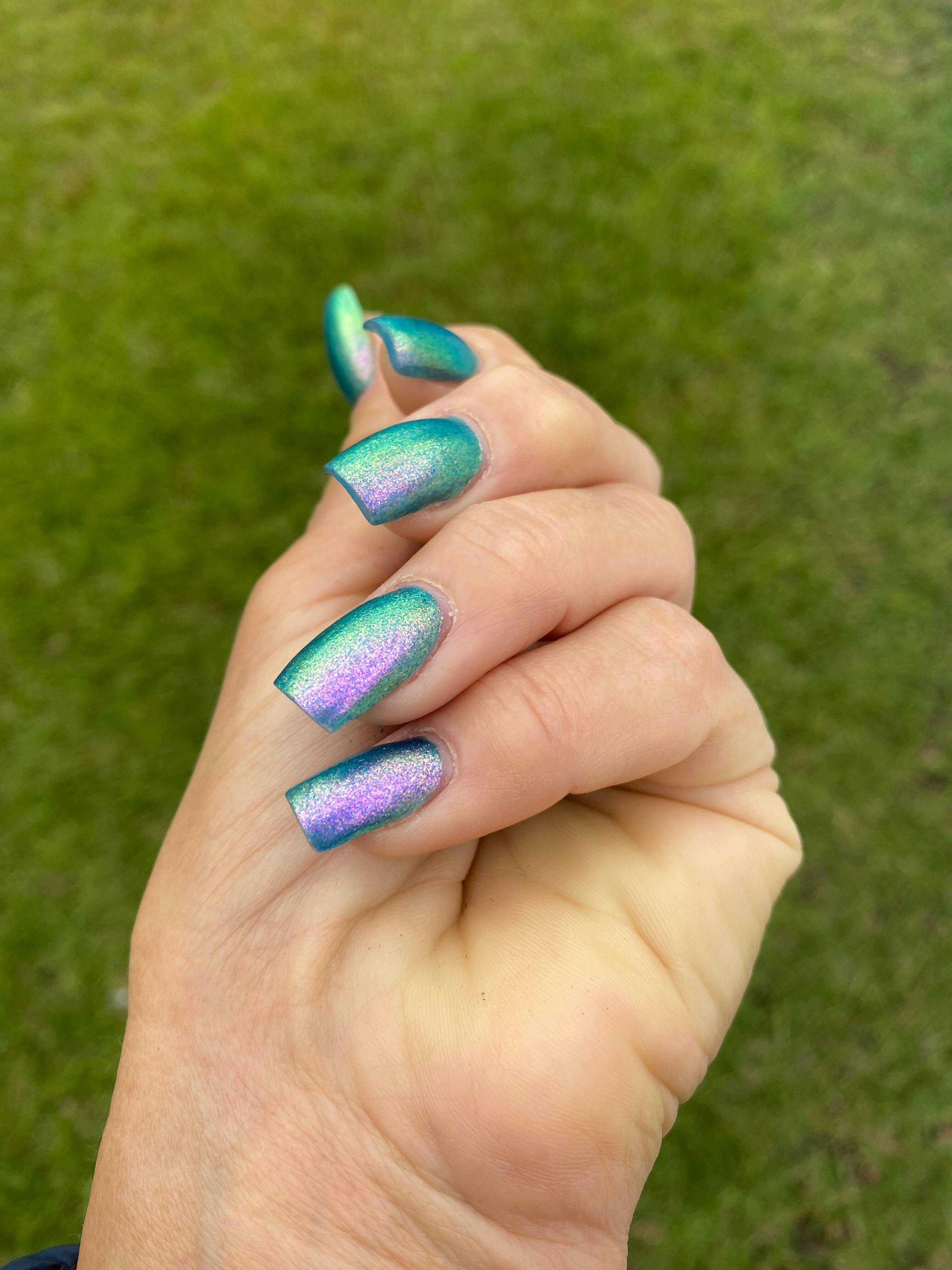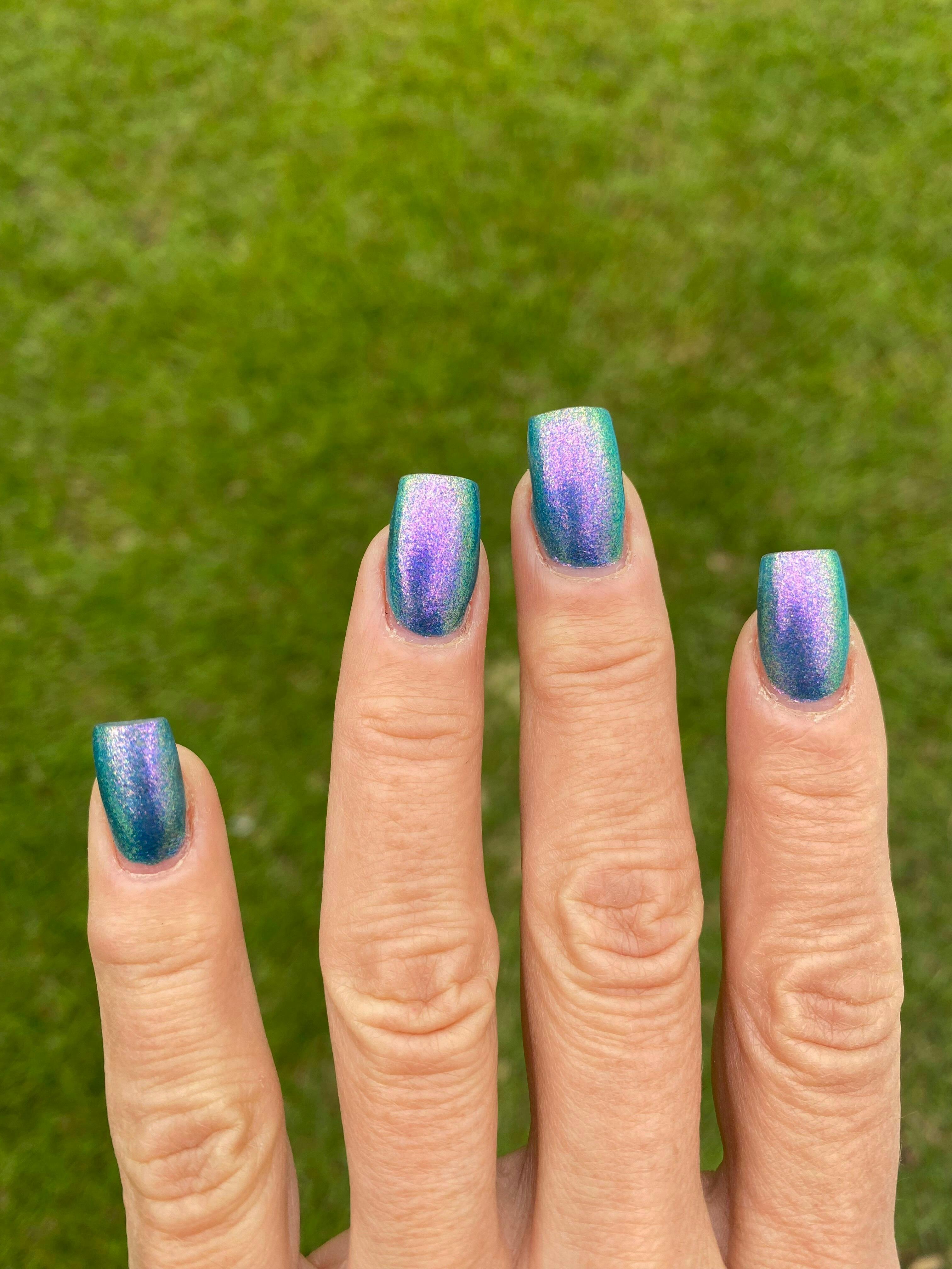 A beautiful blue nail polish with a pink / green / blue shifting large particle shimmer.