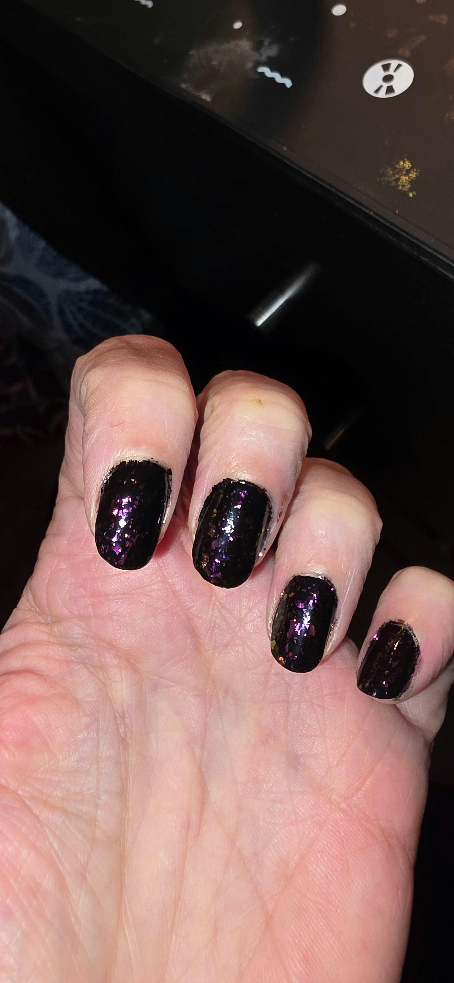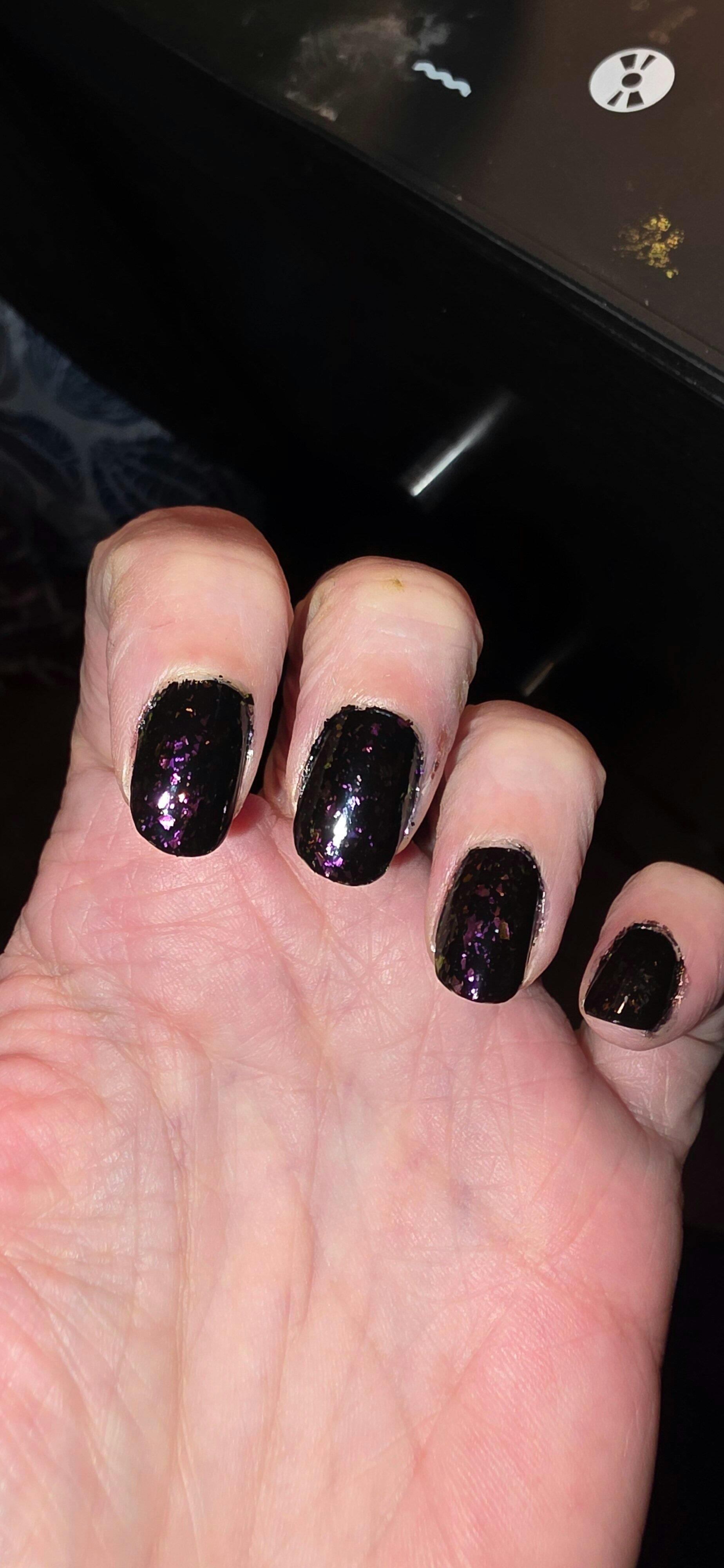 A sheer deep navy nail polish with pink / gold / green shifting multichrome flakes.It has a buildable formula but it is not designed to be fully opaque, top coat recommended for a glossy finish.
