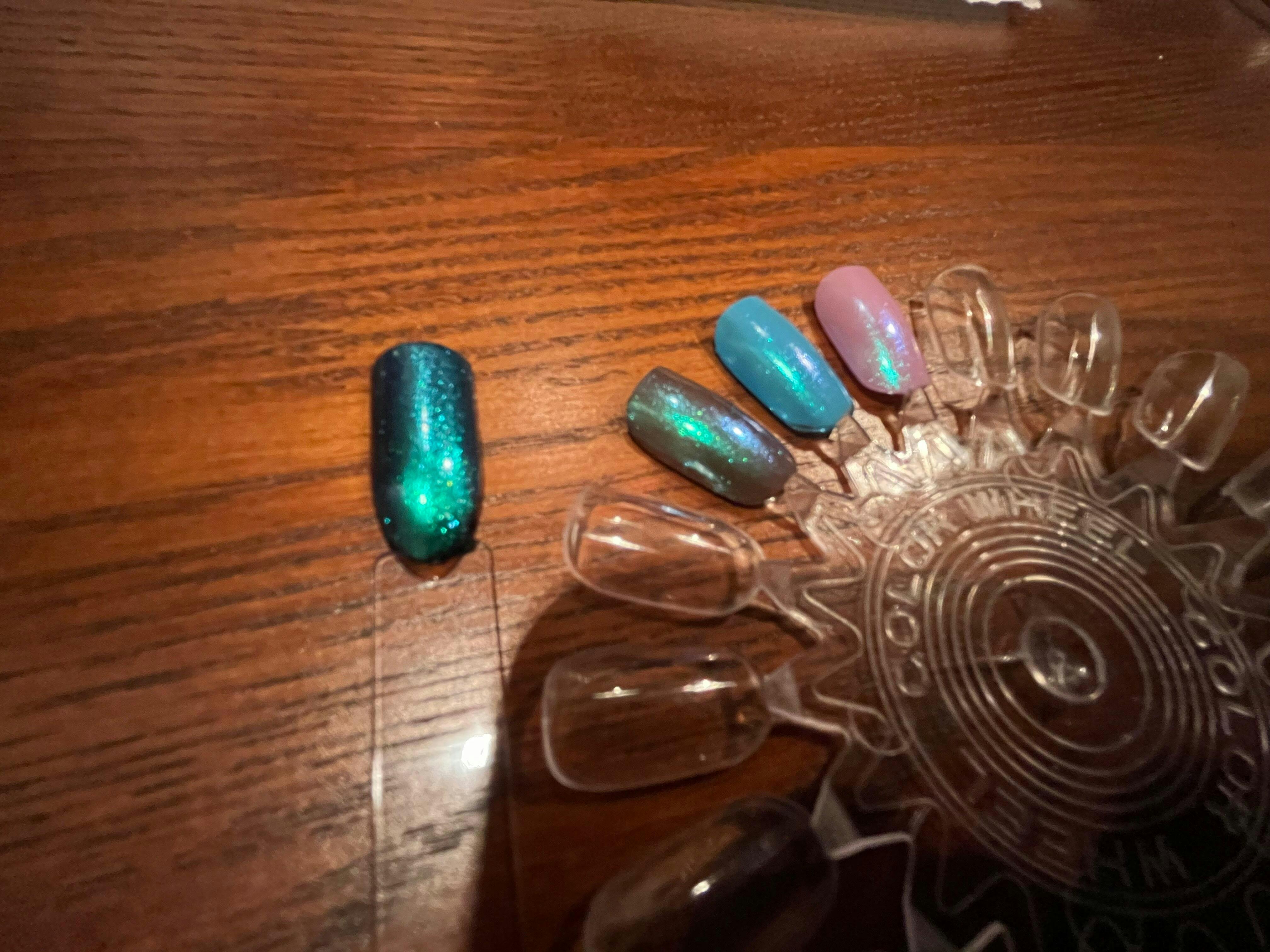 A clear nail polish with a strong green aurora shimmer.