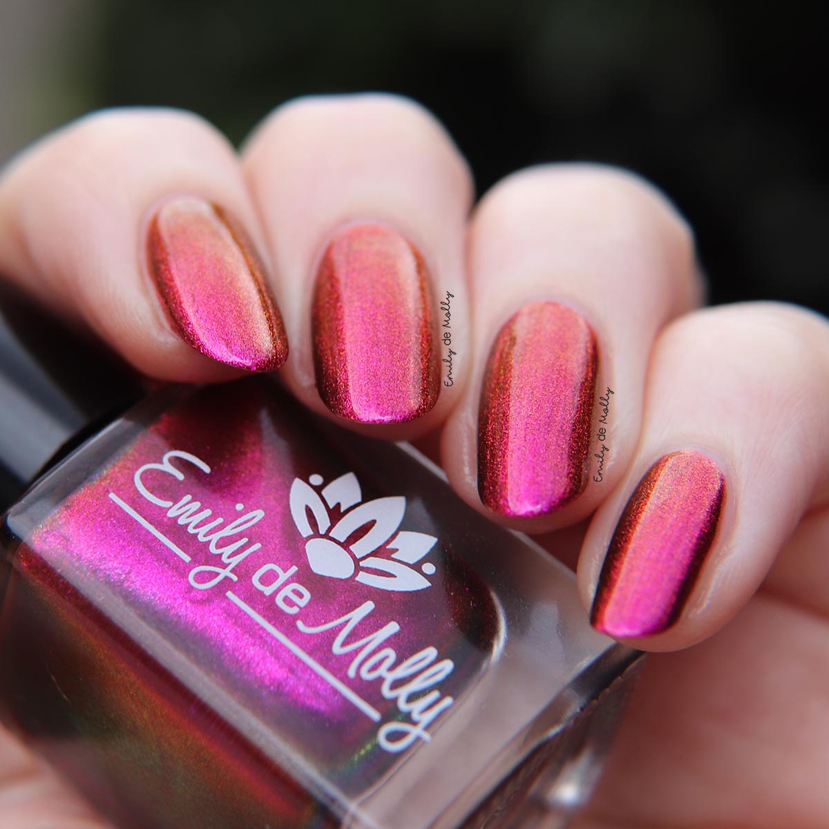 A large particle multichrome nail polish that shifts from a dark burgundy pink to orange to copper.