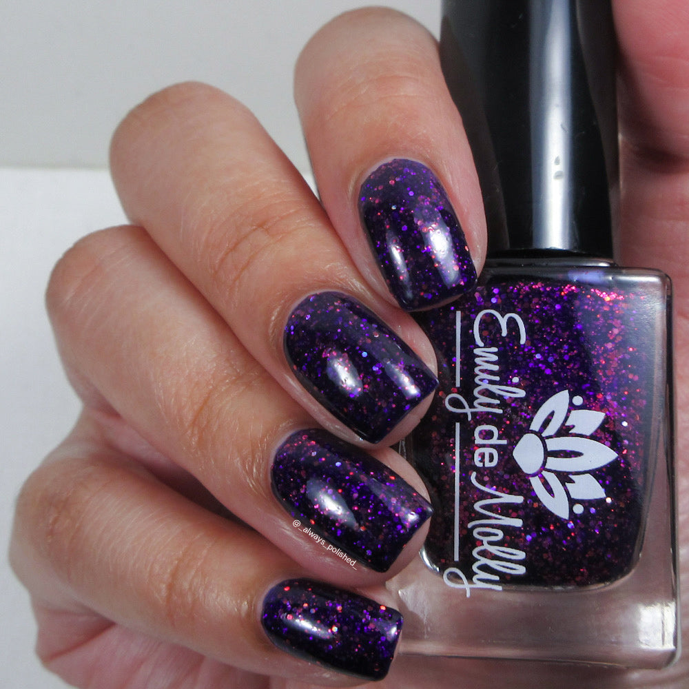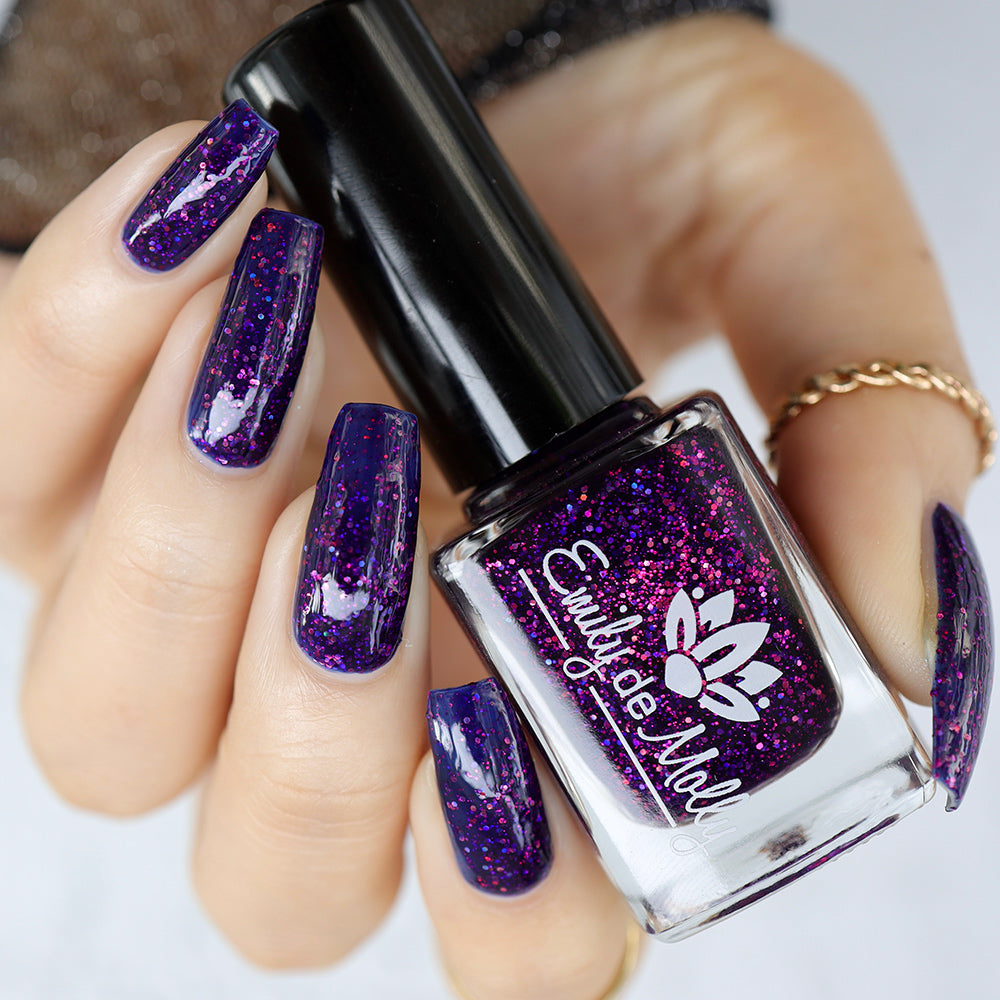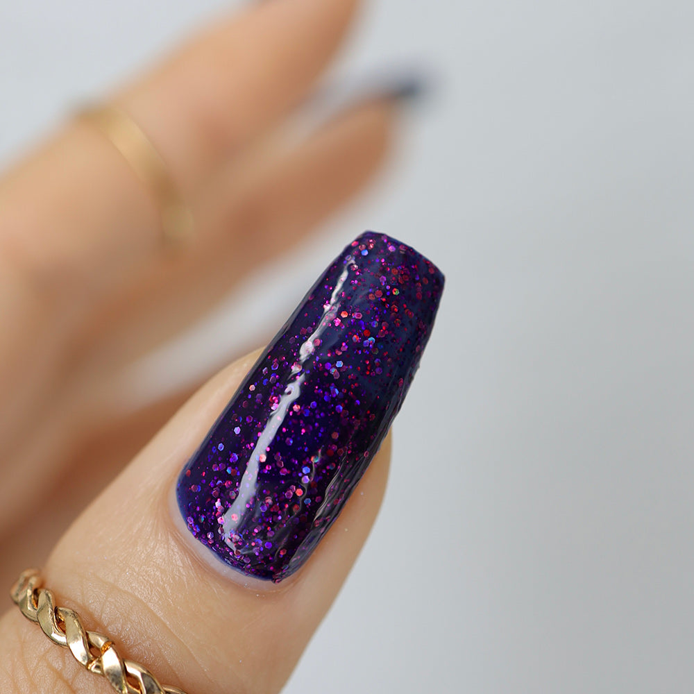 A deep blurple jelly nail polish packed with fuchsia holographic glitters.