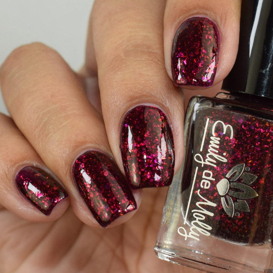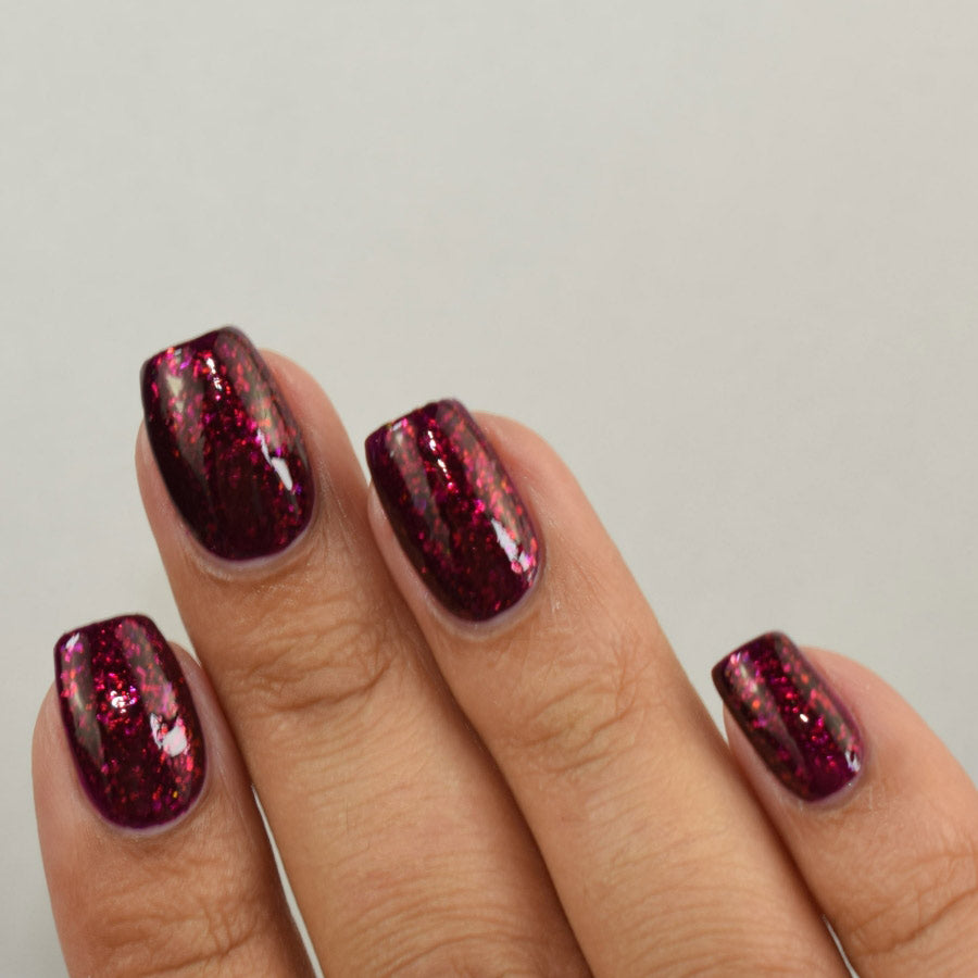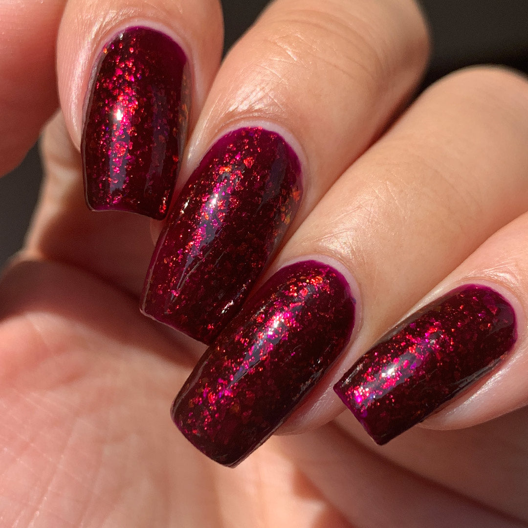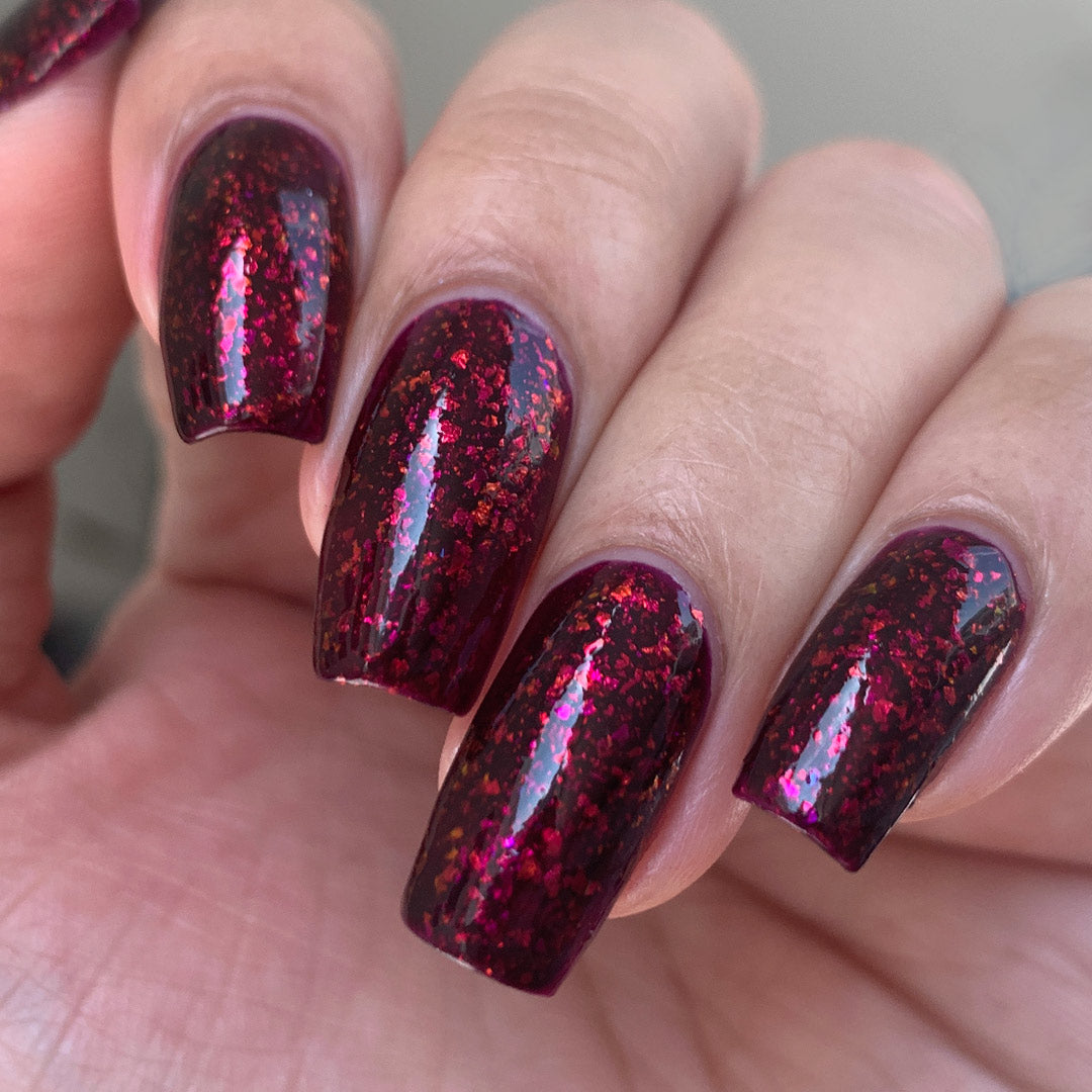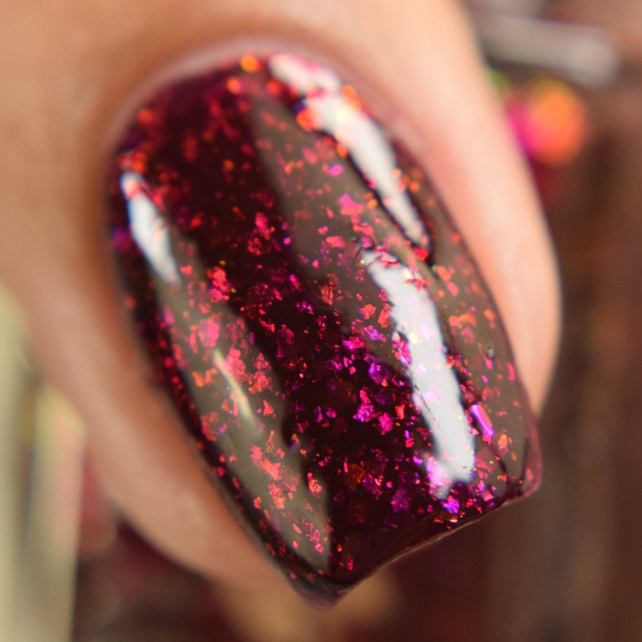 A deep red ( purple undertones ) nail polish filled with pink / orange / green shifting iridescent flakes.