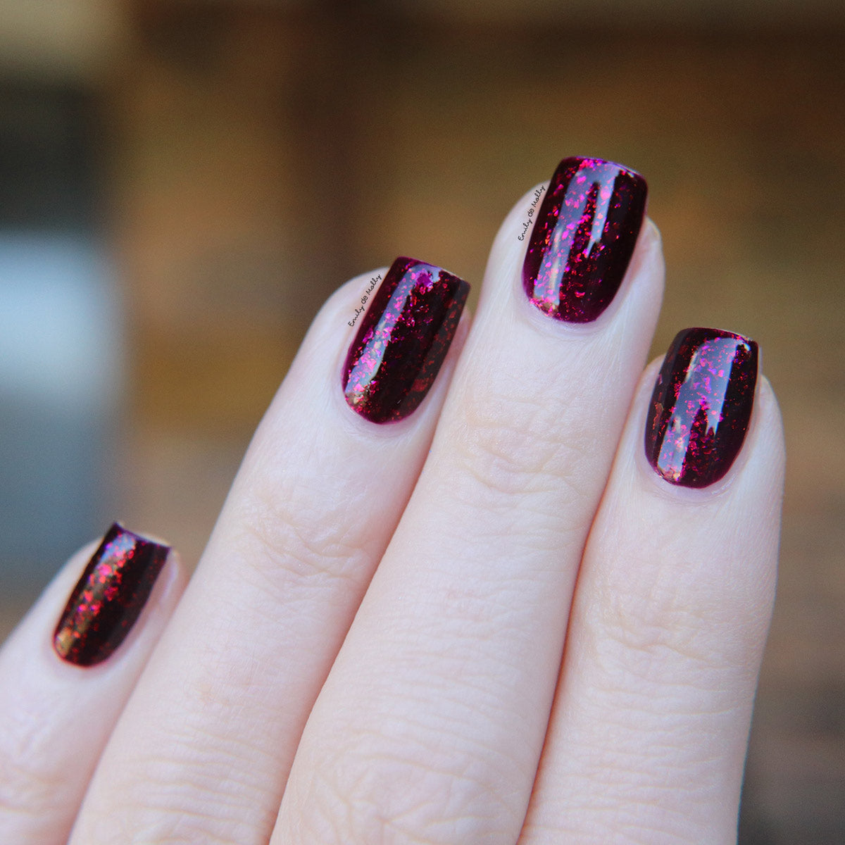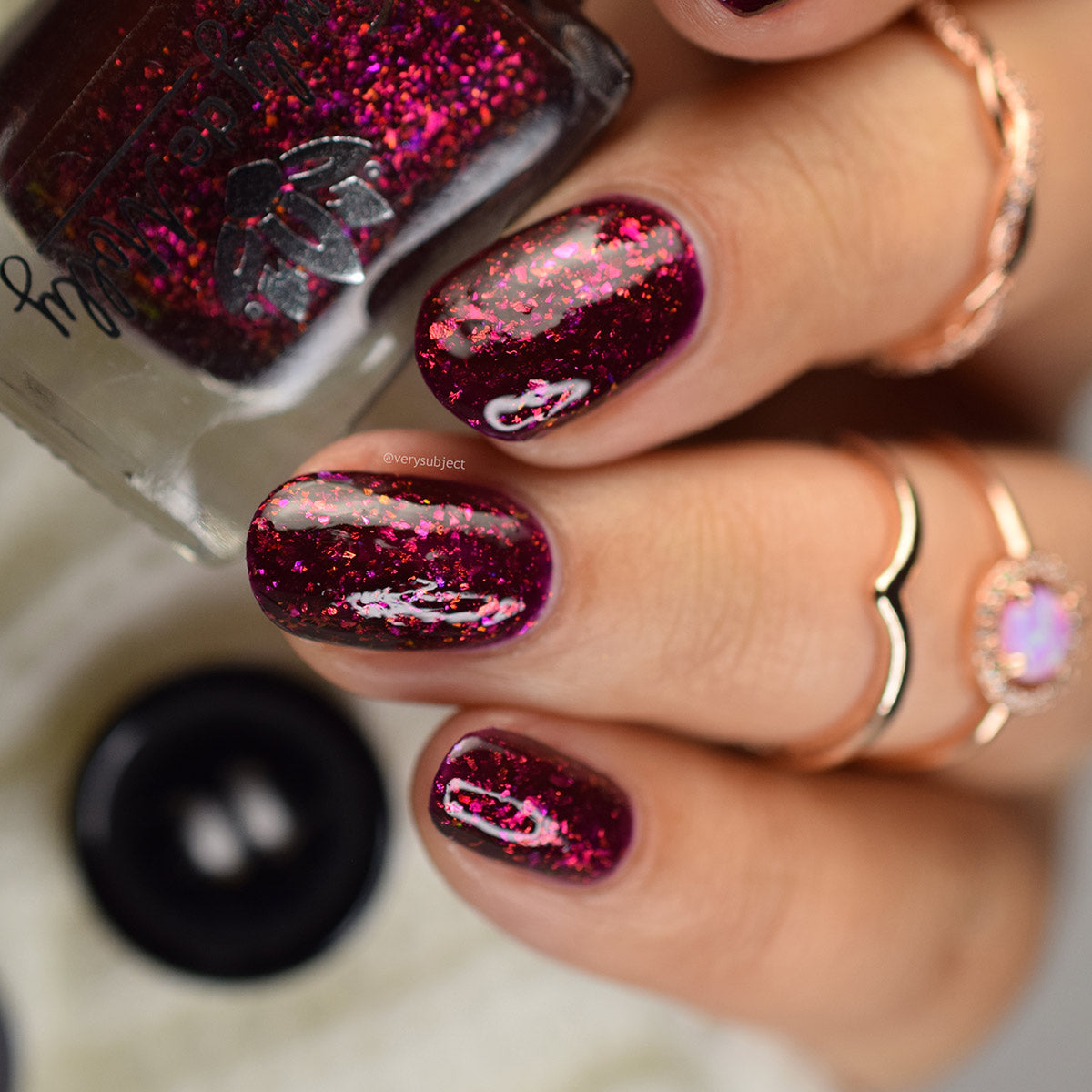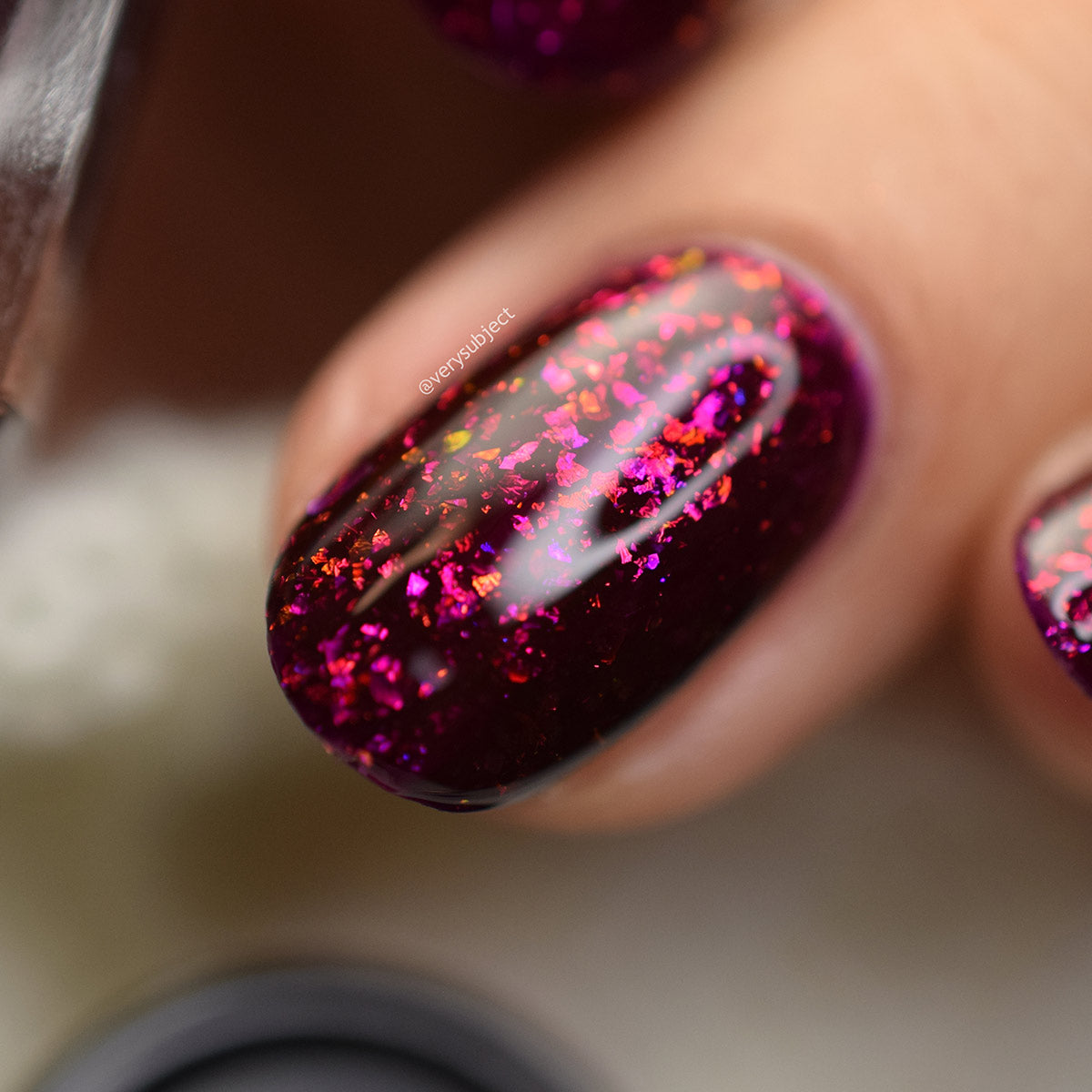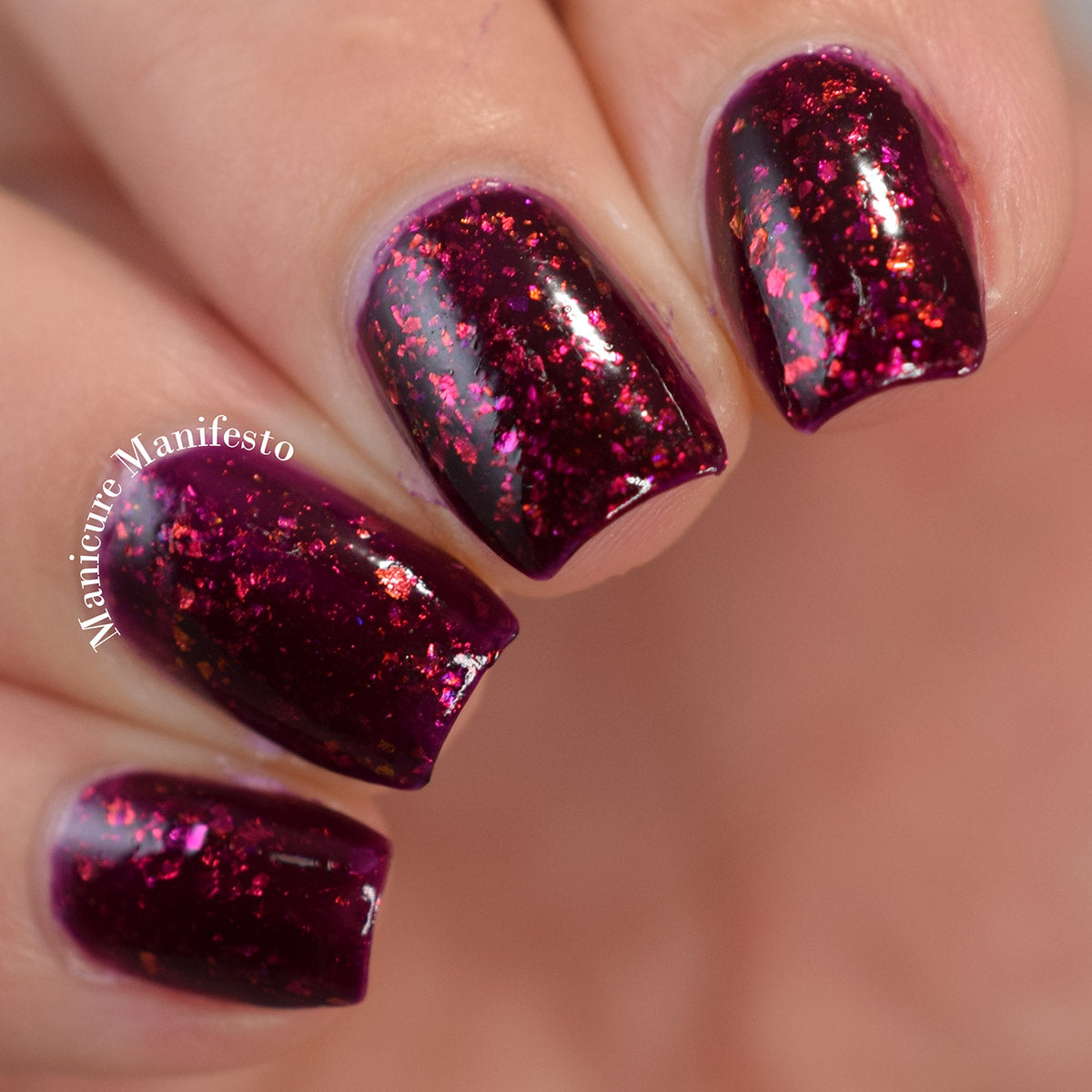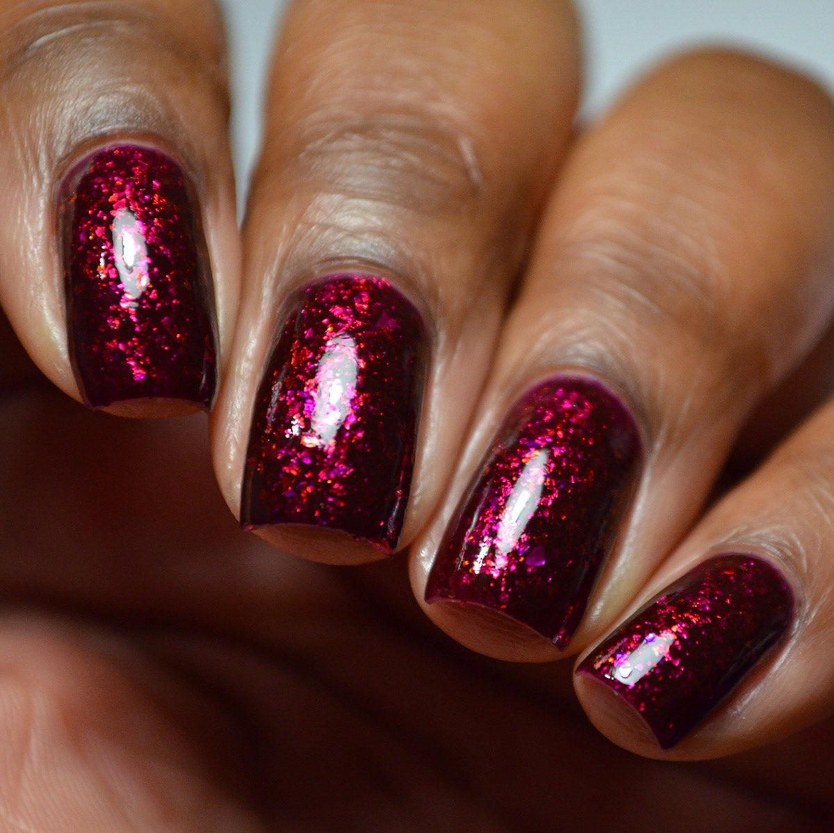 A deep red ( purple undertones ) nail polish filled with pink / orange / green shifting iridescent flakes.