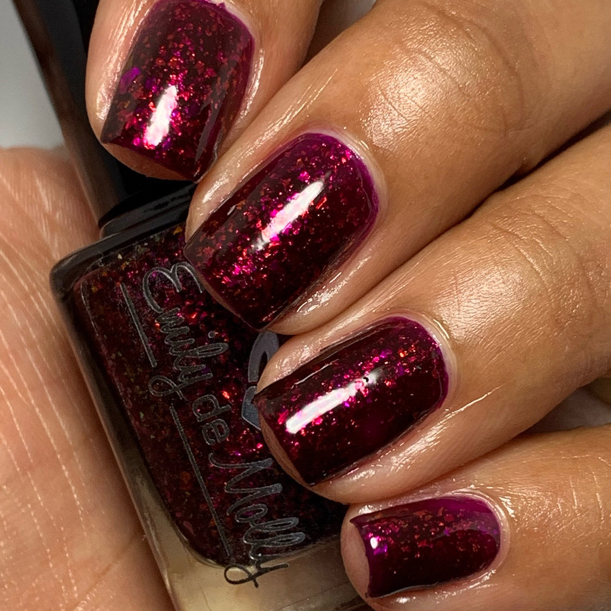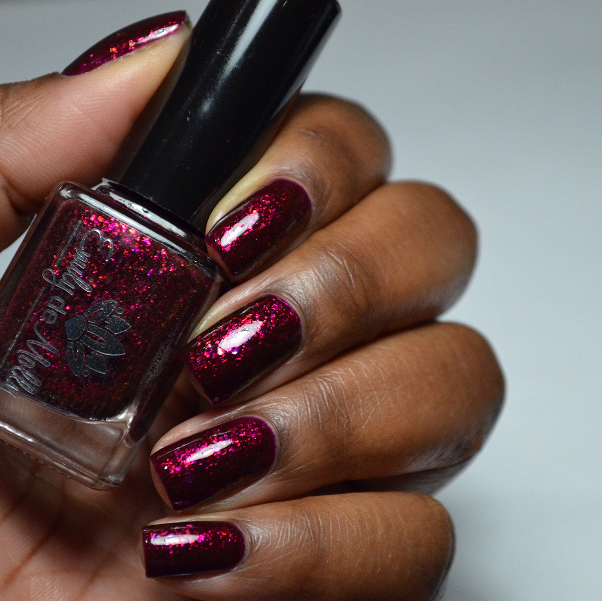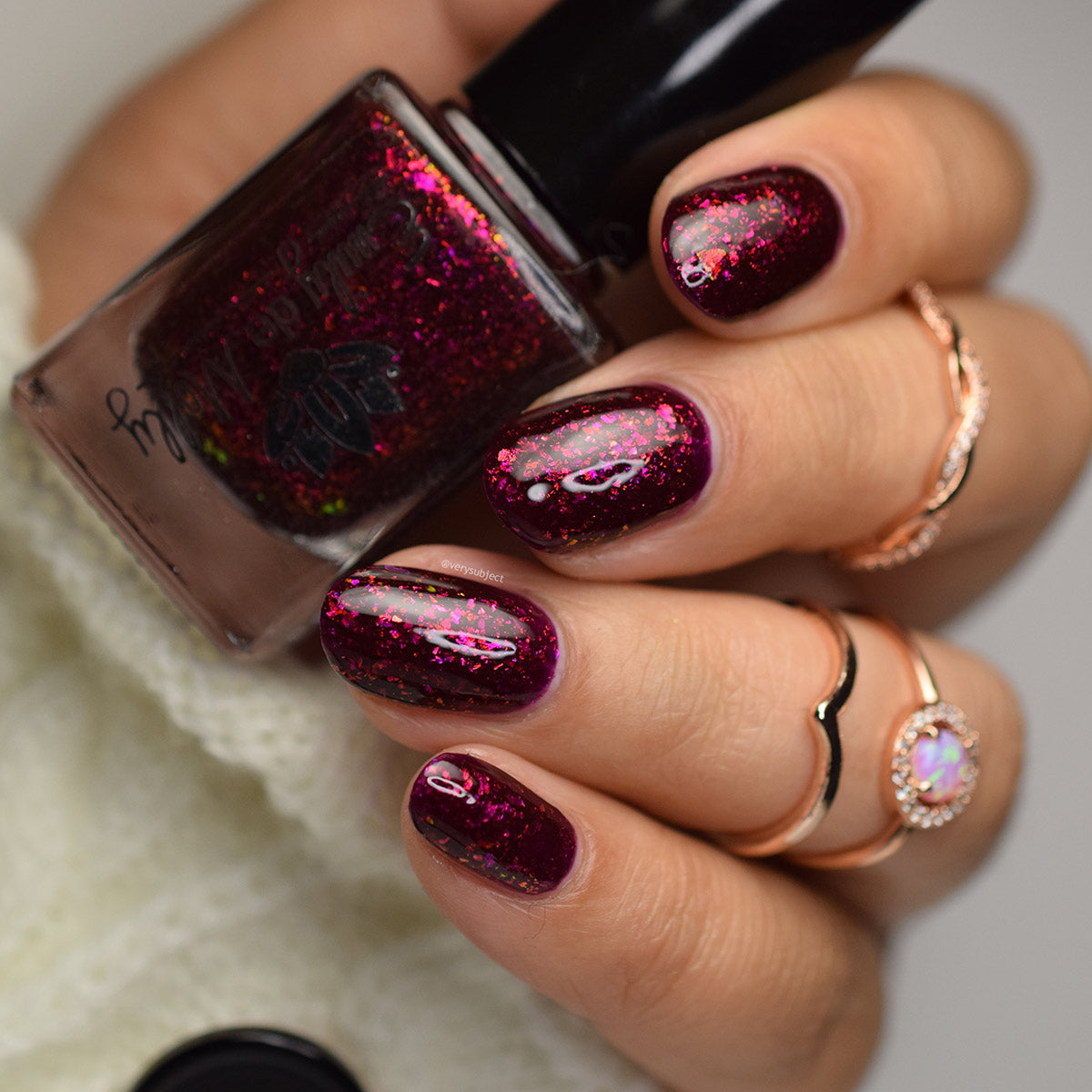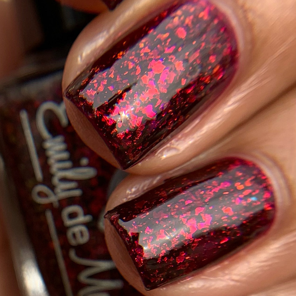 A deep red ( purple undertones ) nail polish filled with pink / orange / green shifting iridescent flakes.