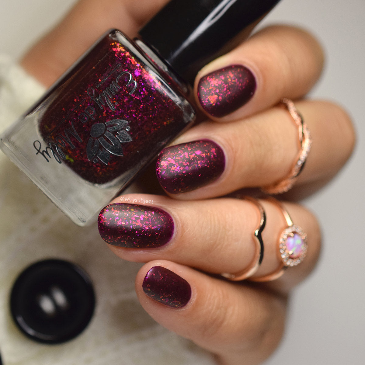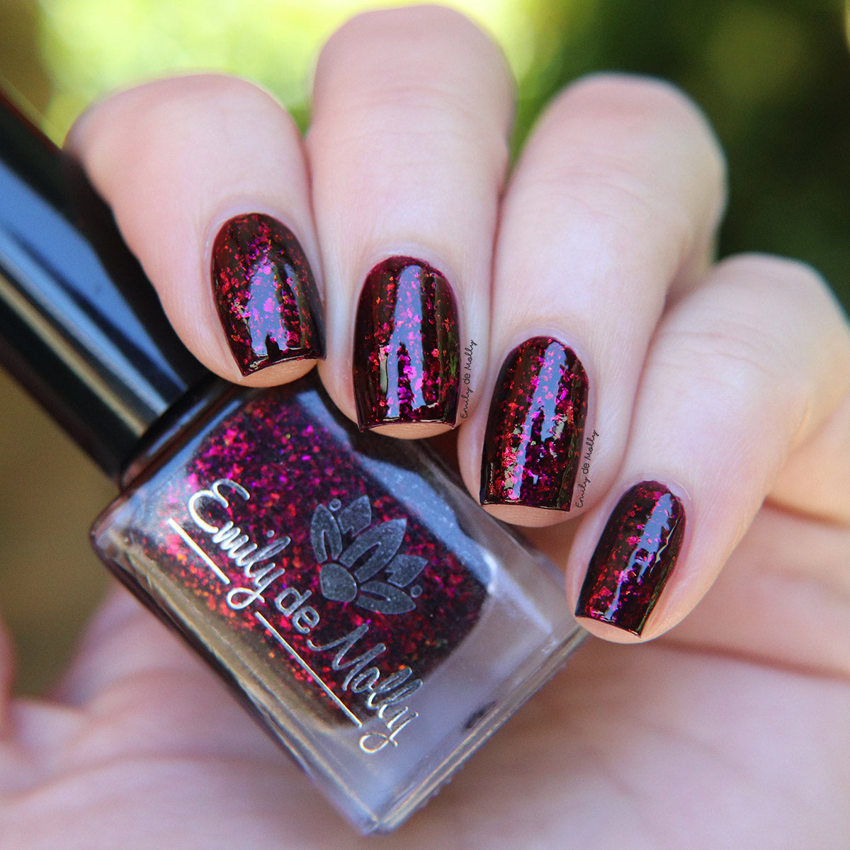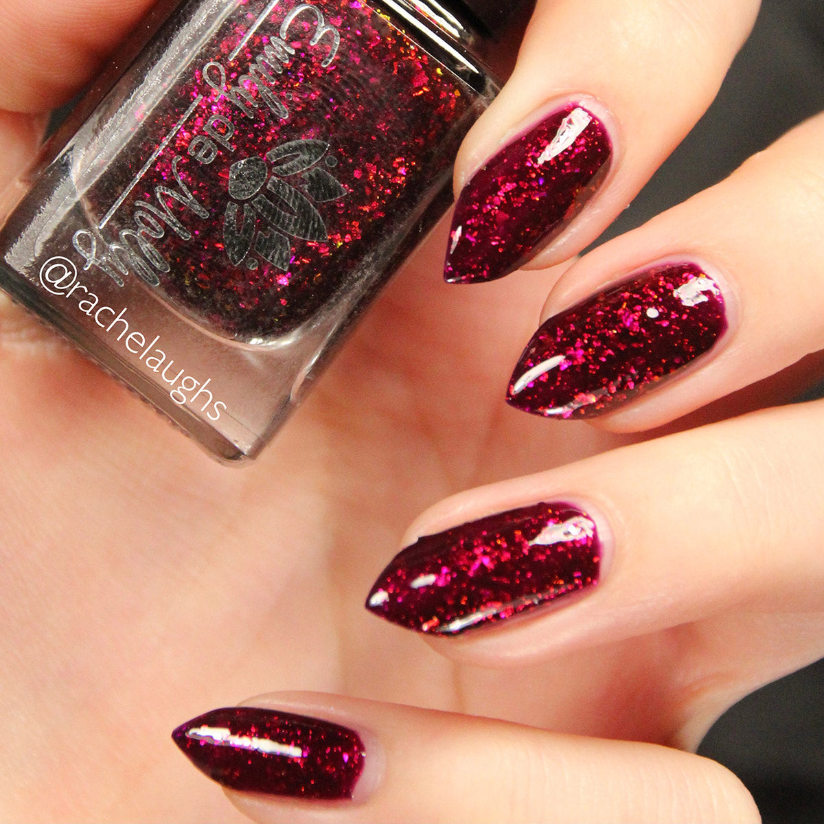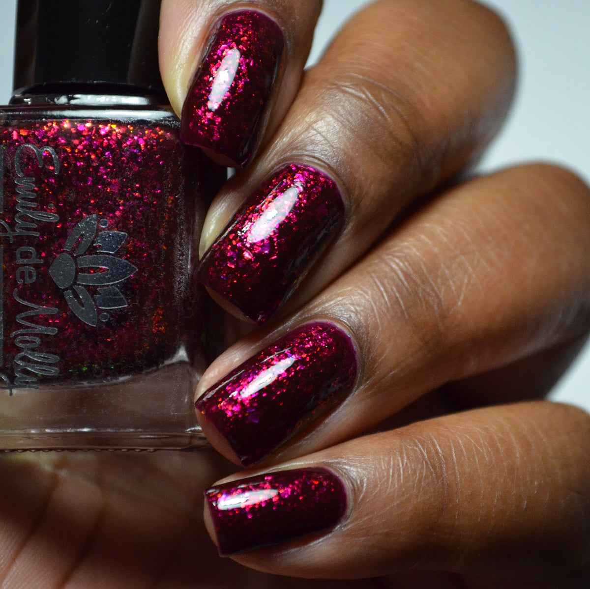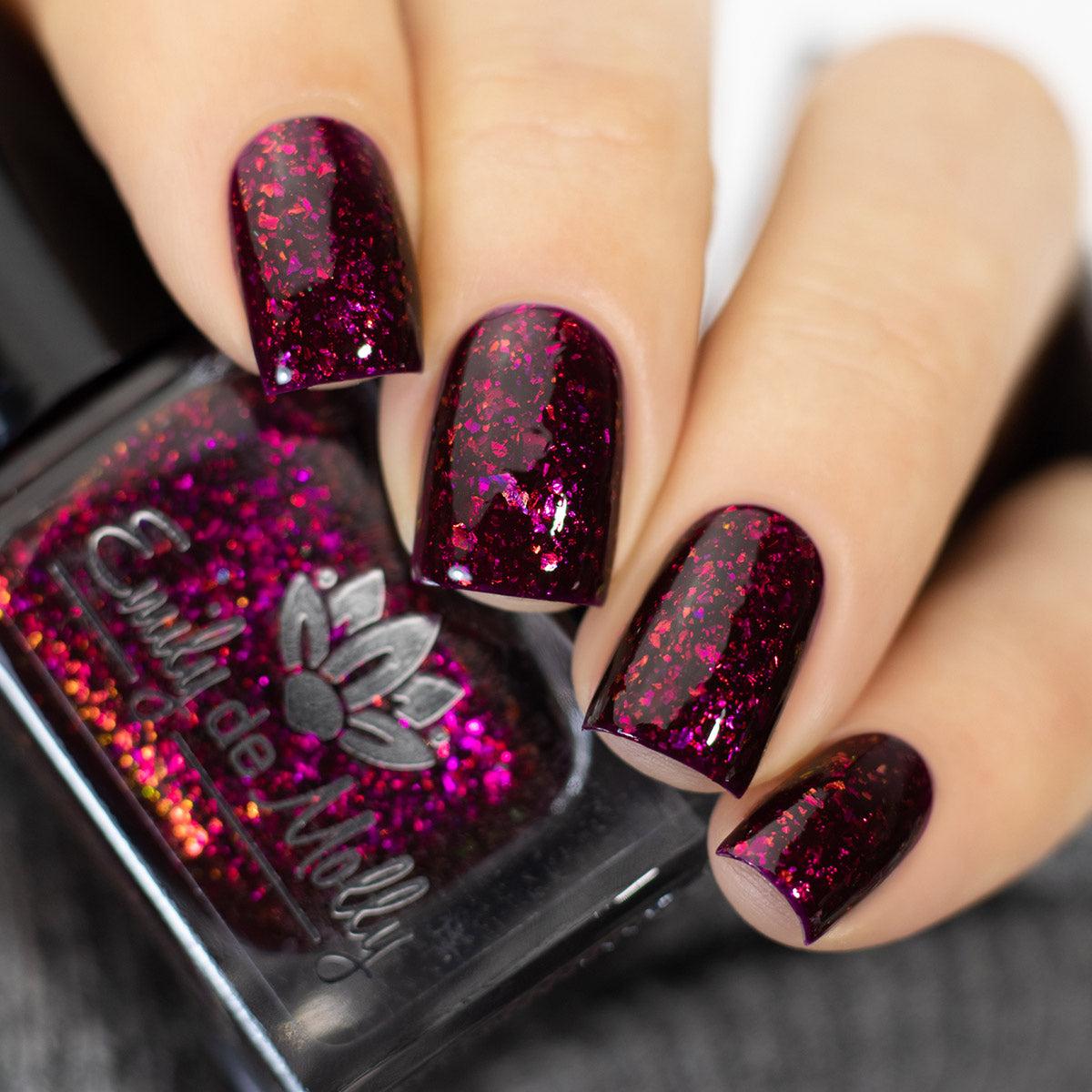 A deep red ( purple undertones ) nail polish filled with pink / orange / green shifting iridescent flakes.