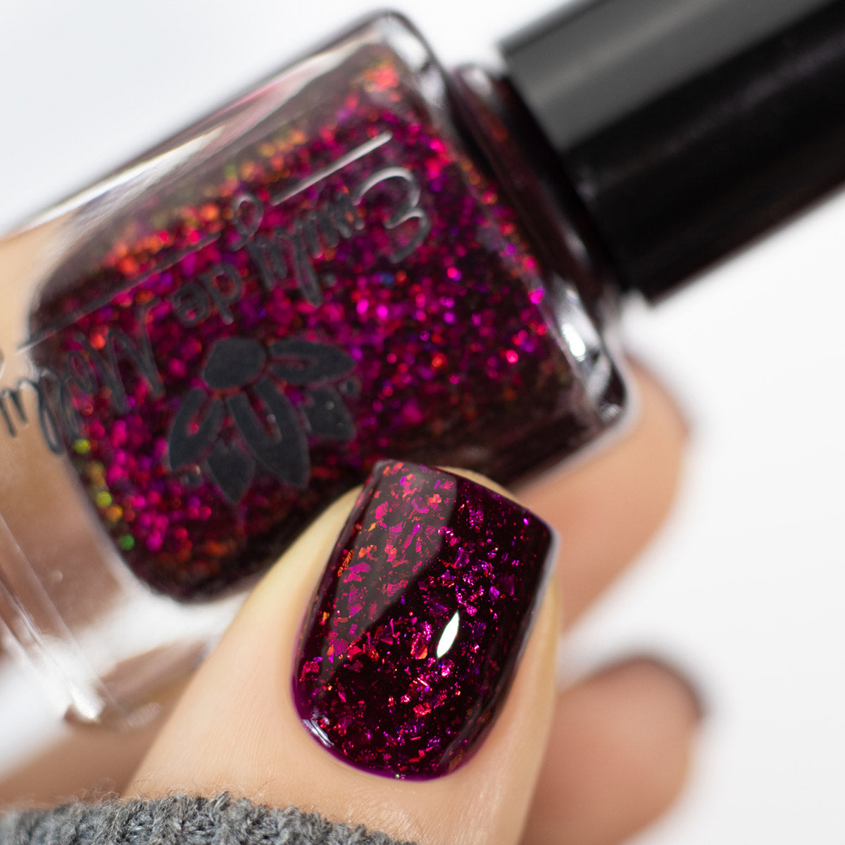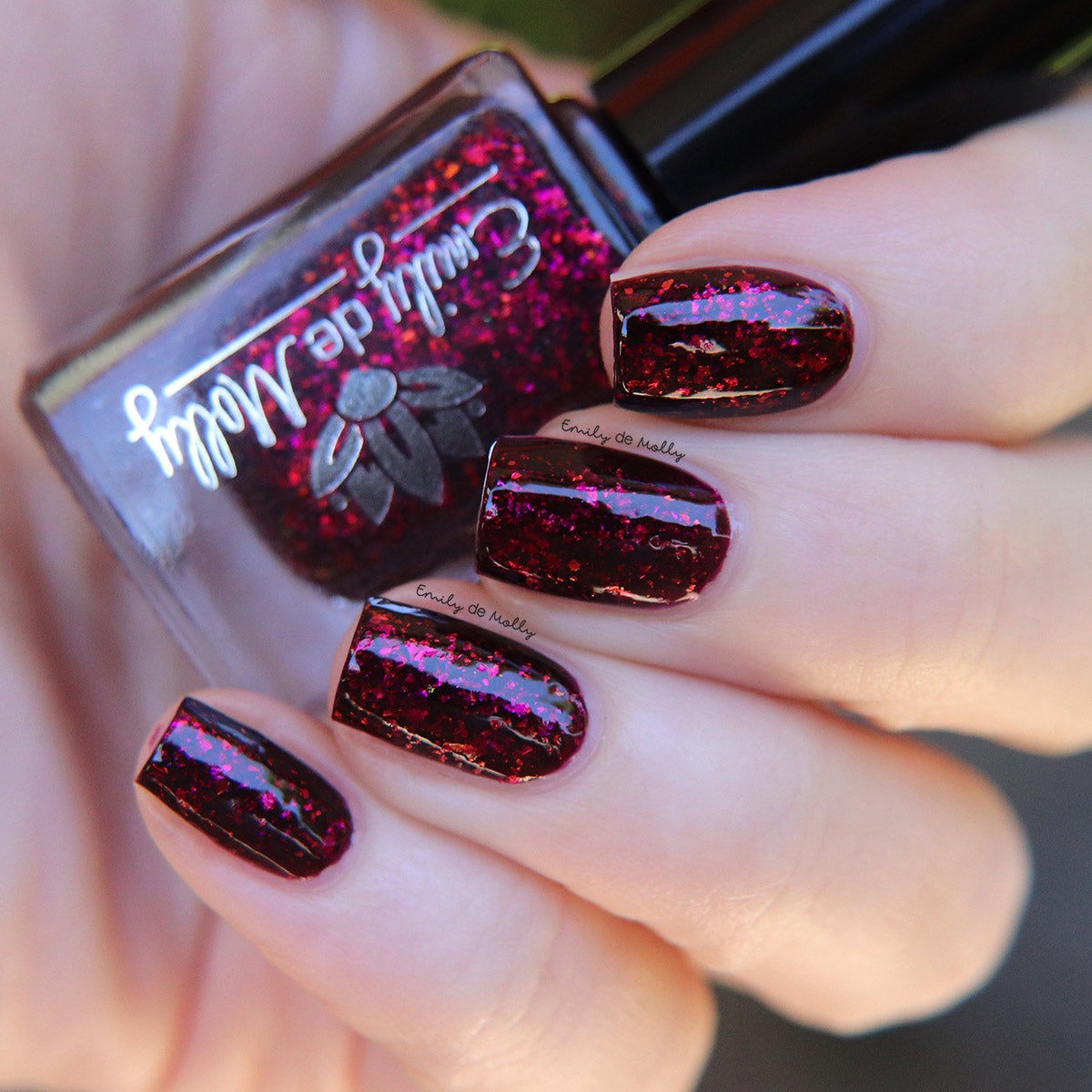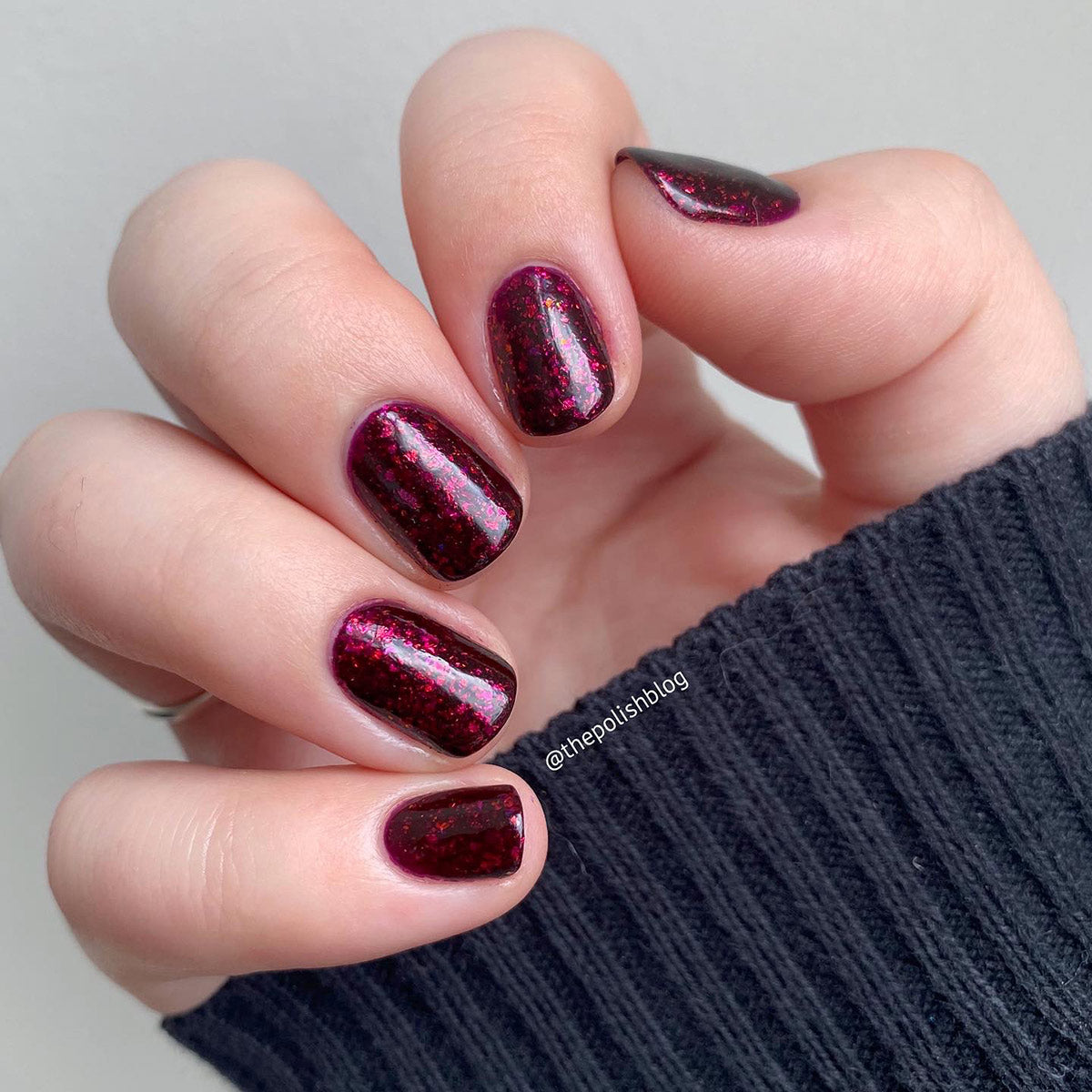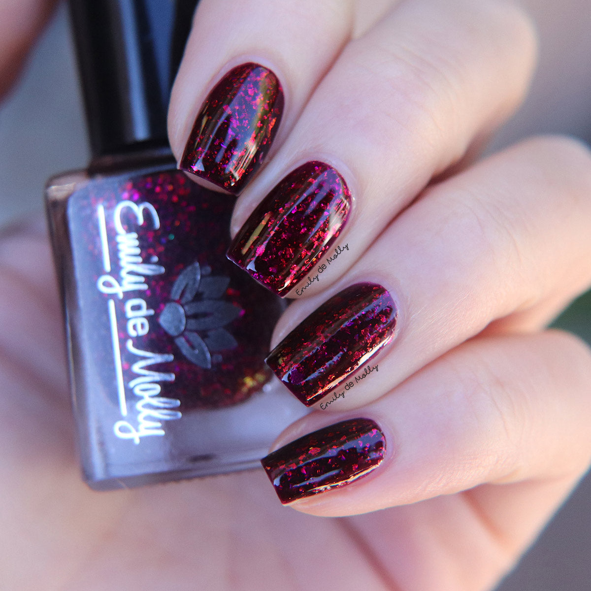 A deep red ( purple undertones ) nail polish filled with pink / orange / green shifting iridescent flakes.