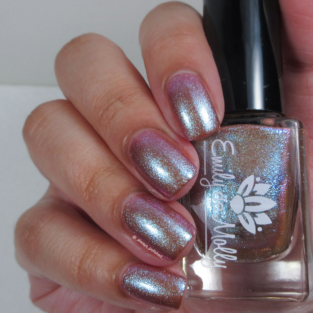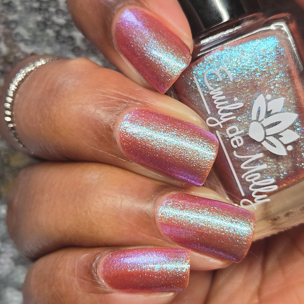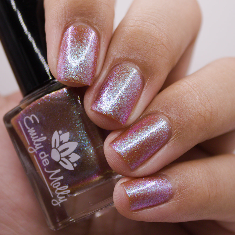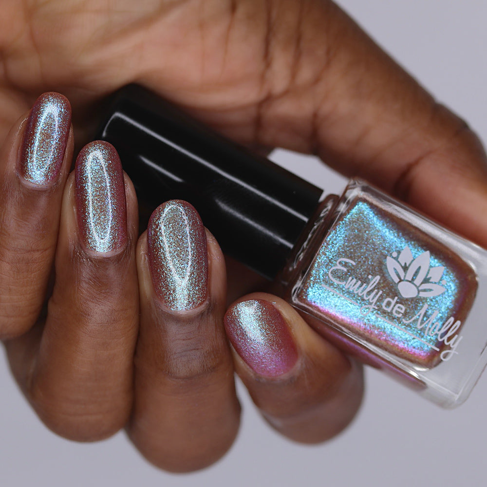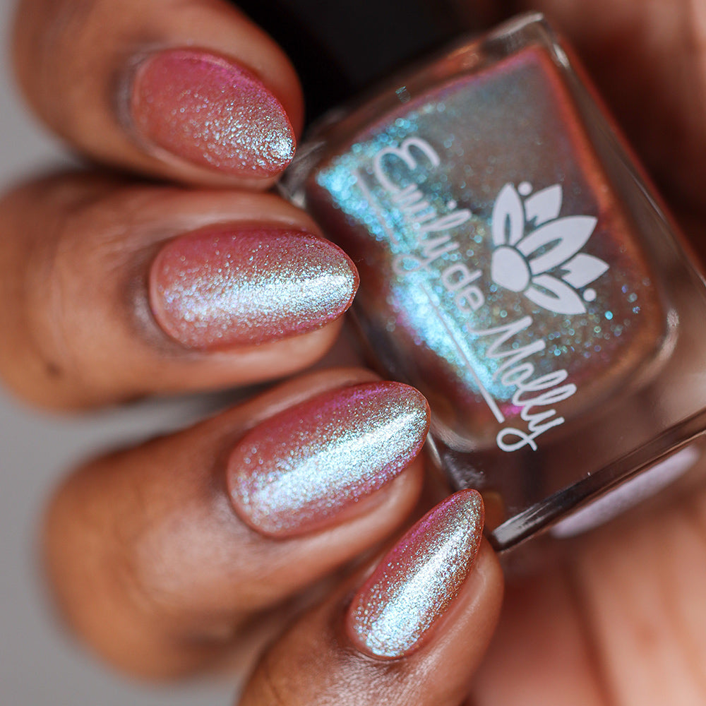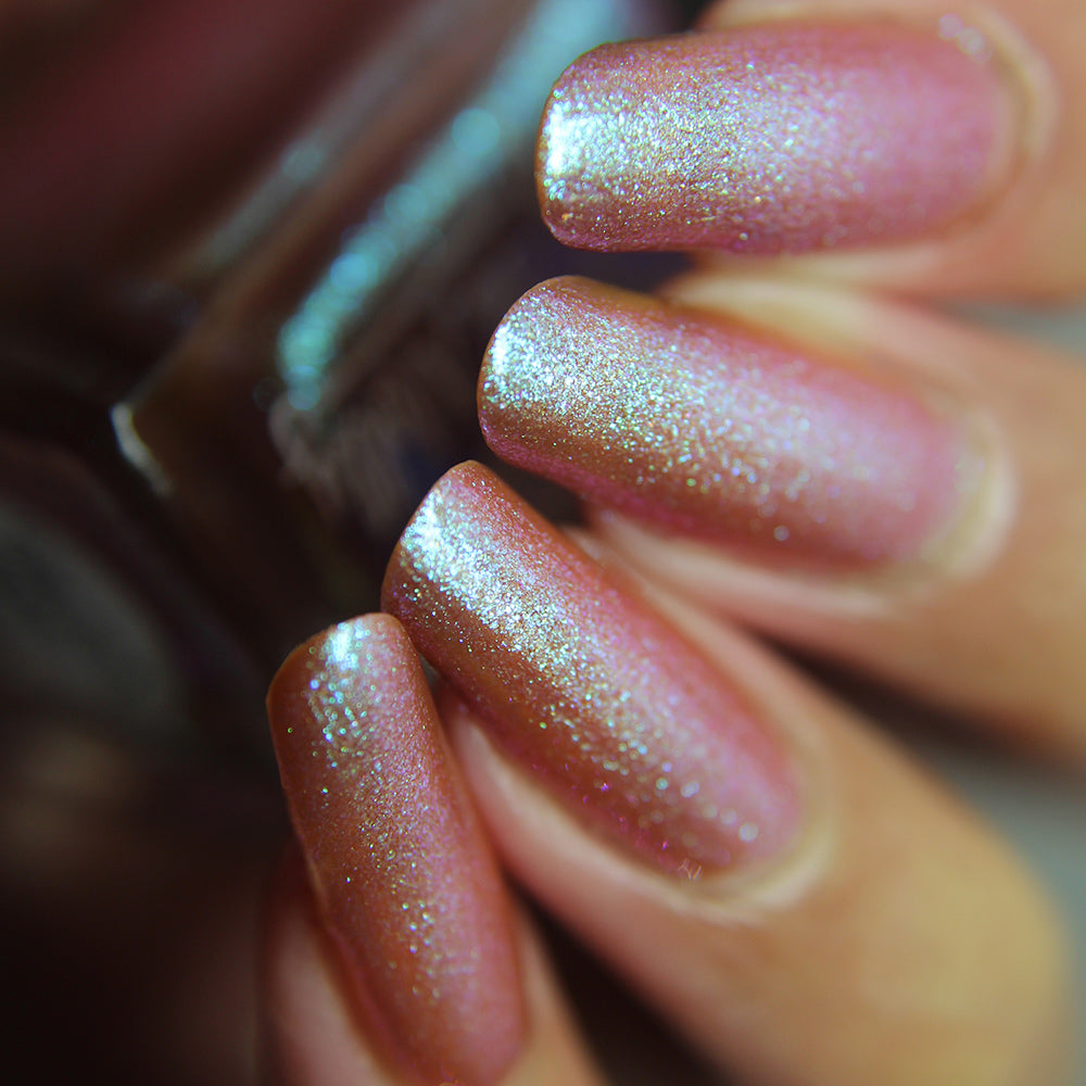 A light sandy brown nail polish with an aqua to purple shifting, large particle shimmer.