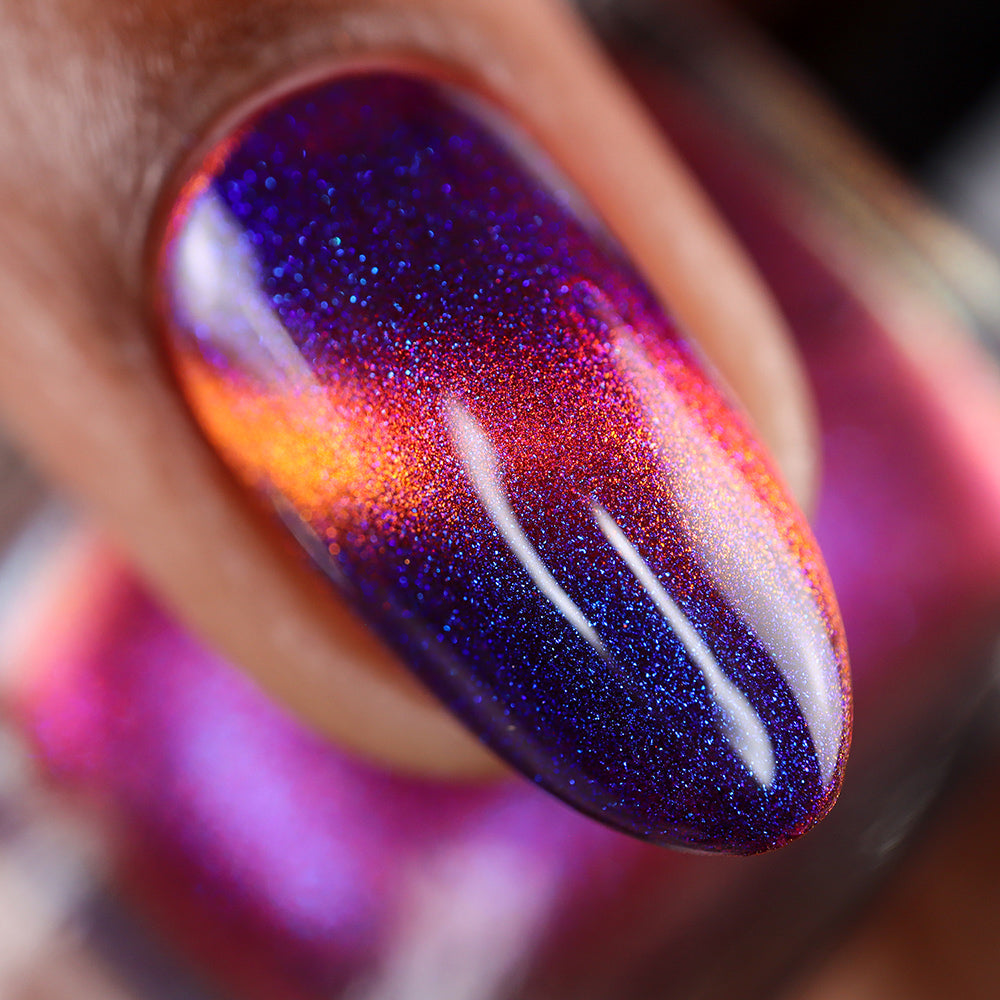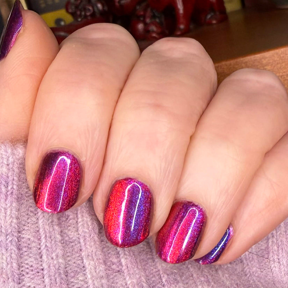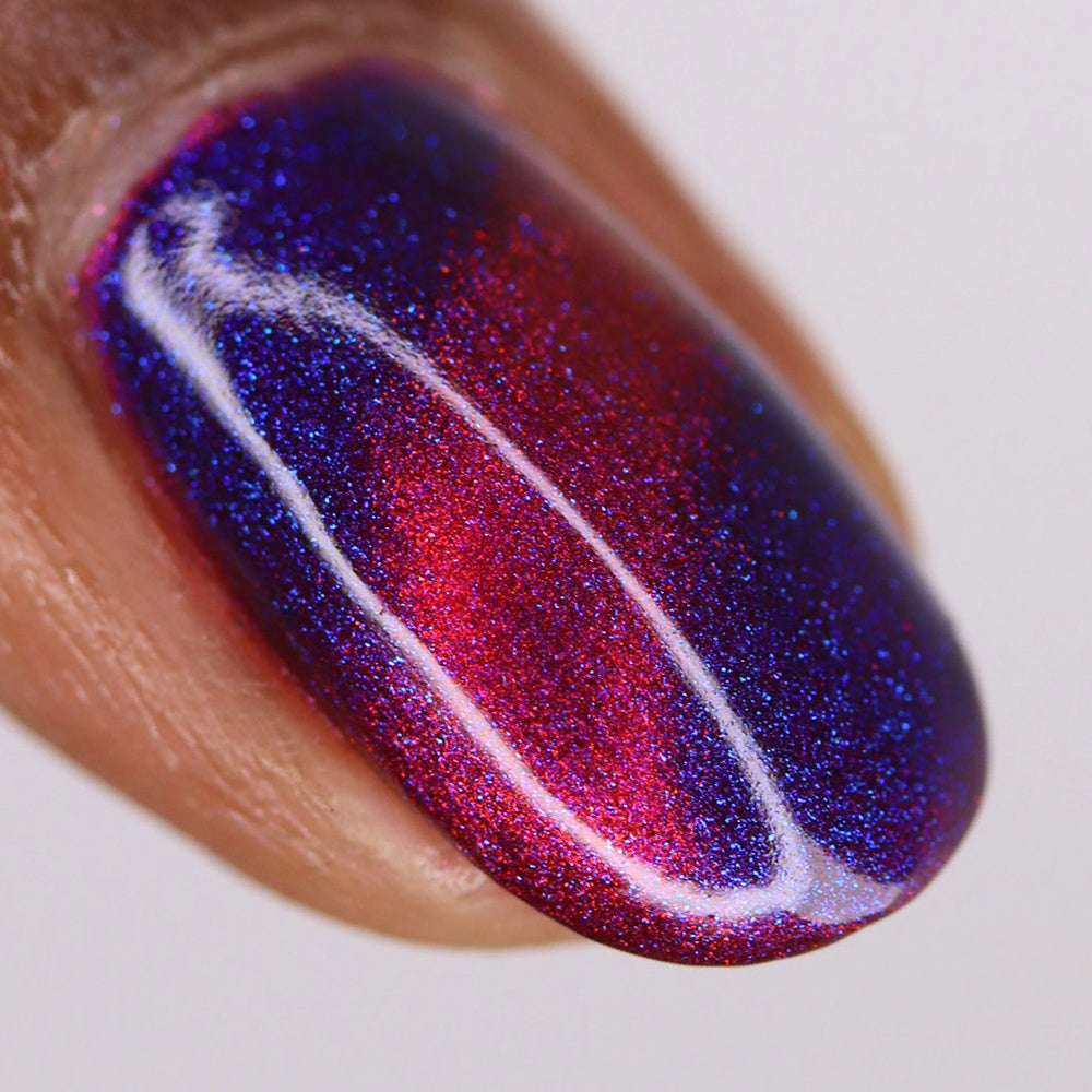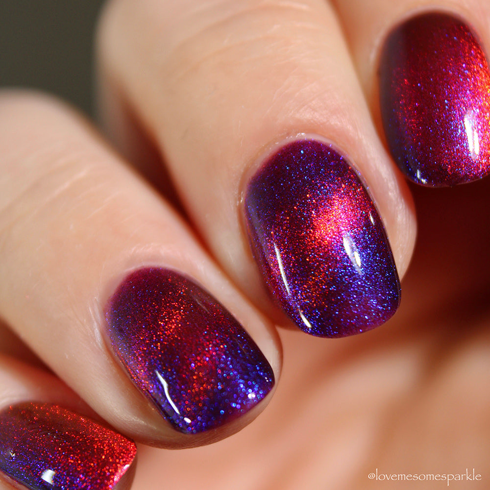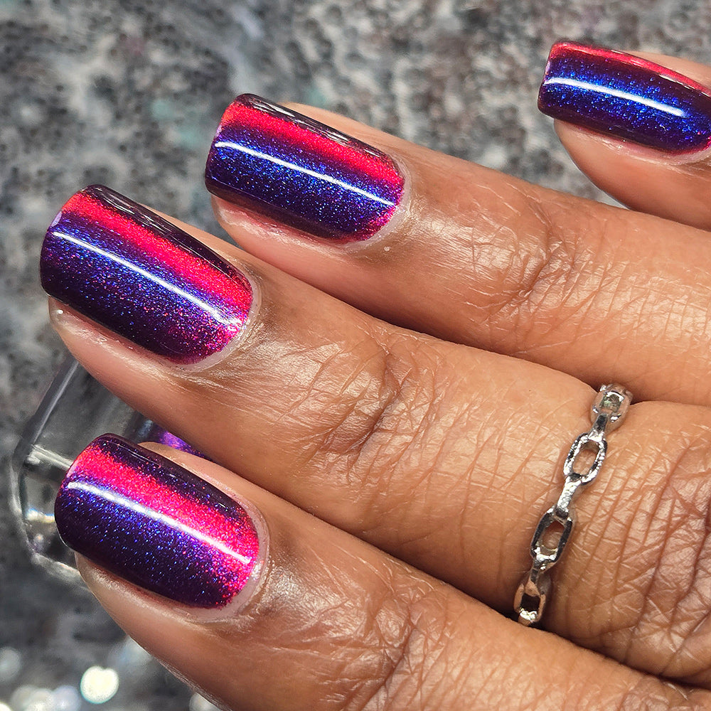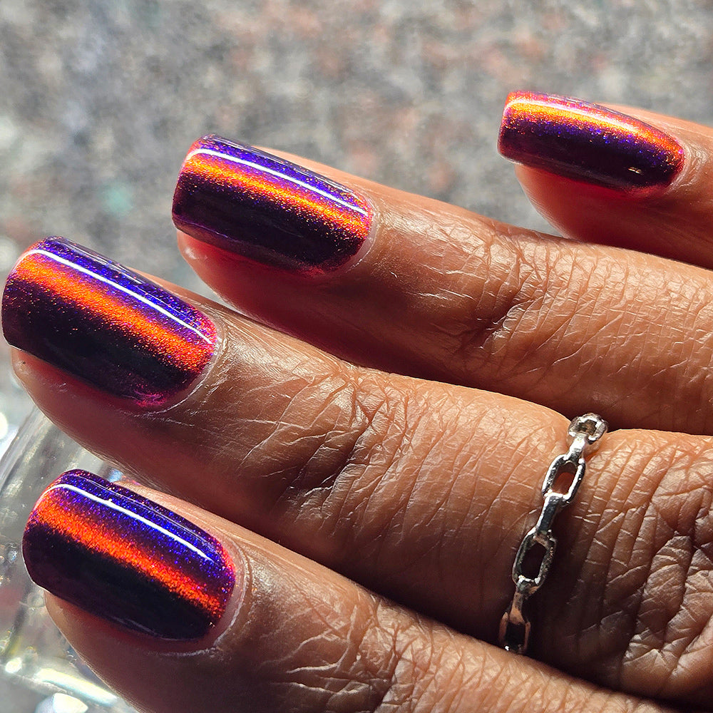 A deep purple nail polish with a blue aurora shimmer and a red to orange shifting magnetic effect.