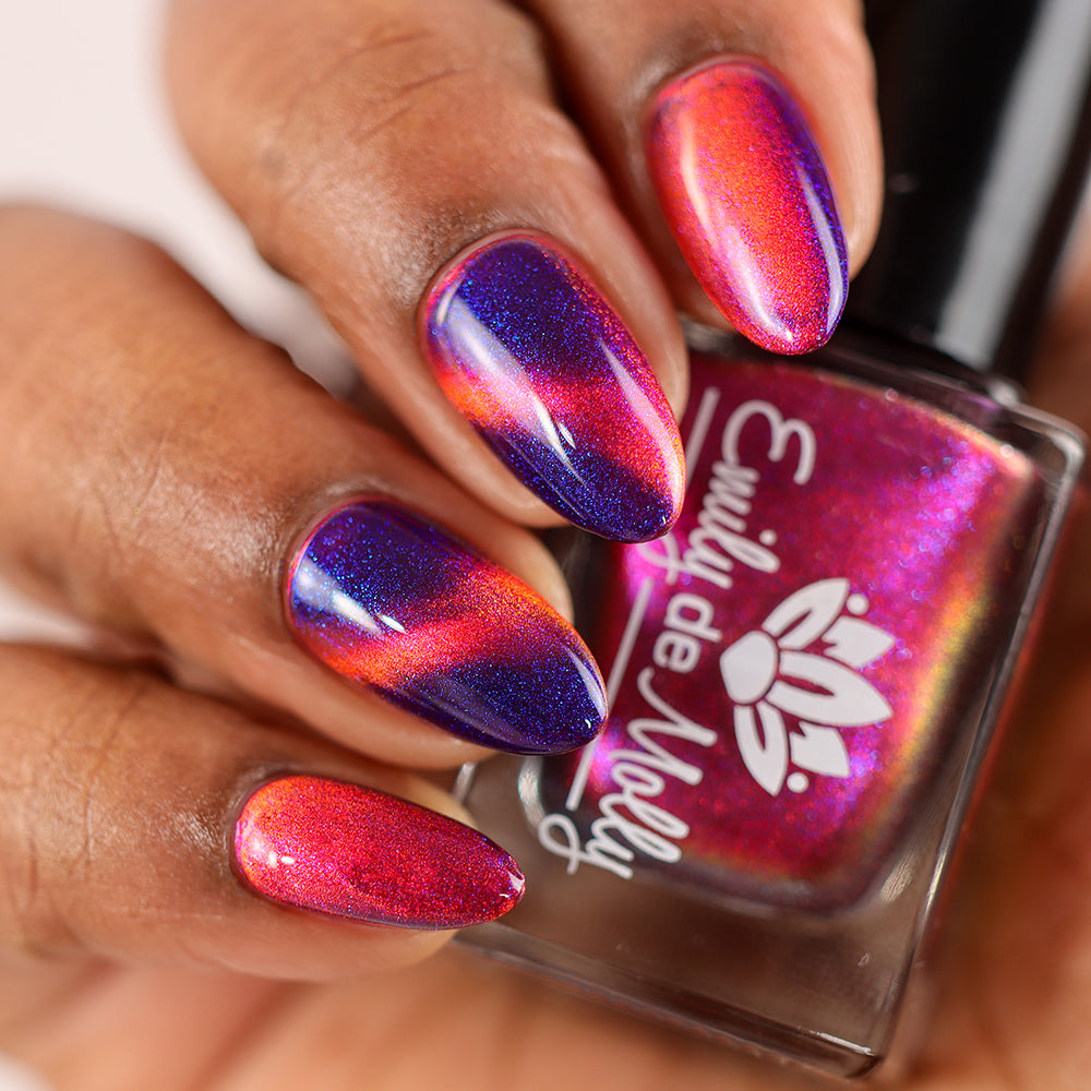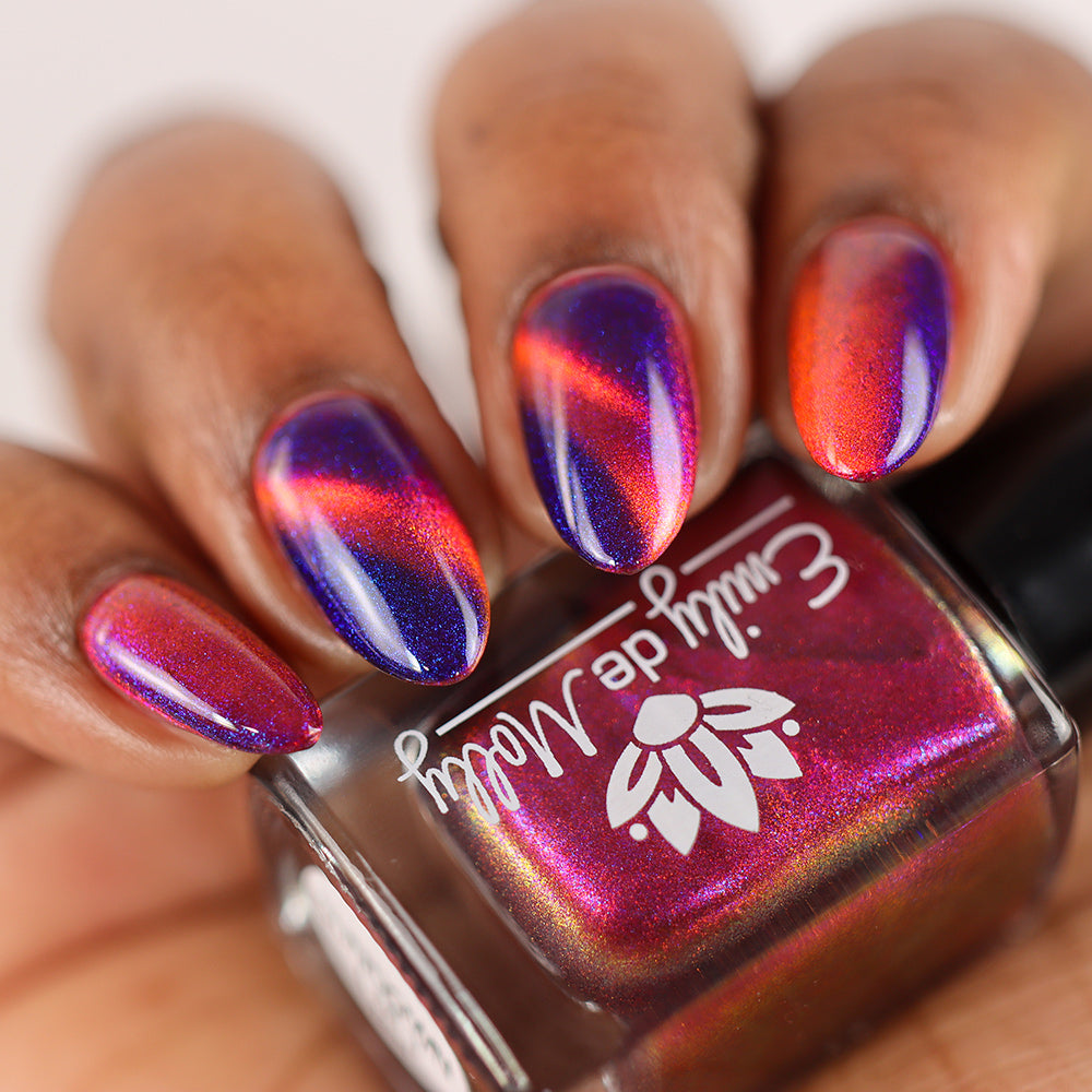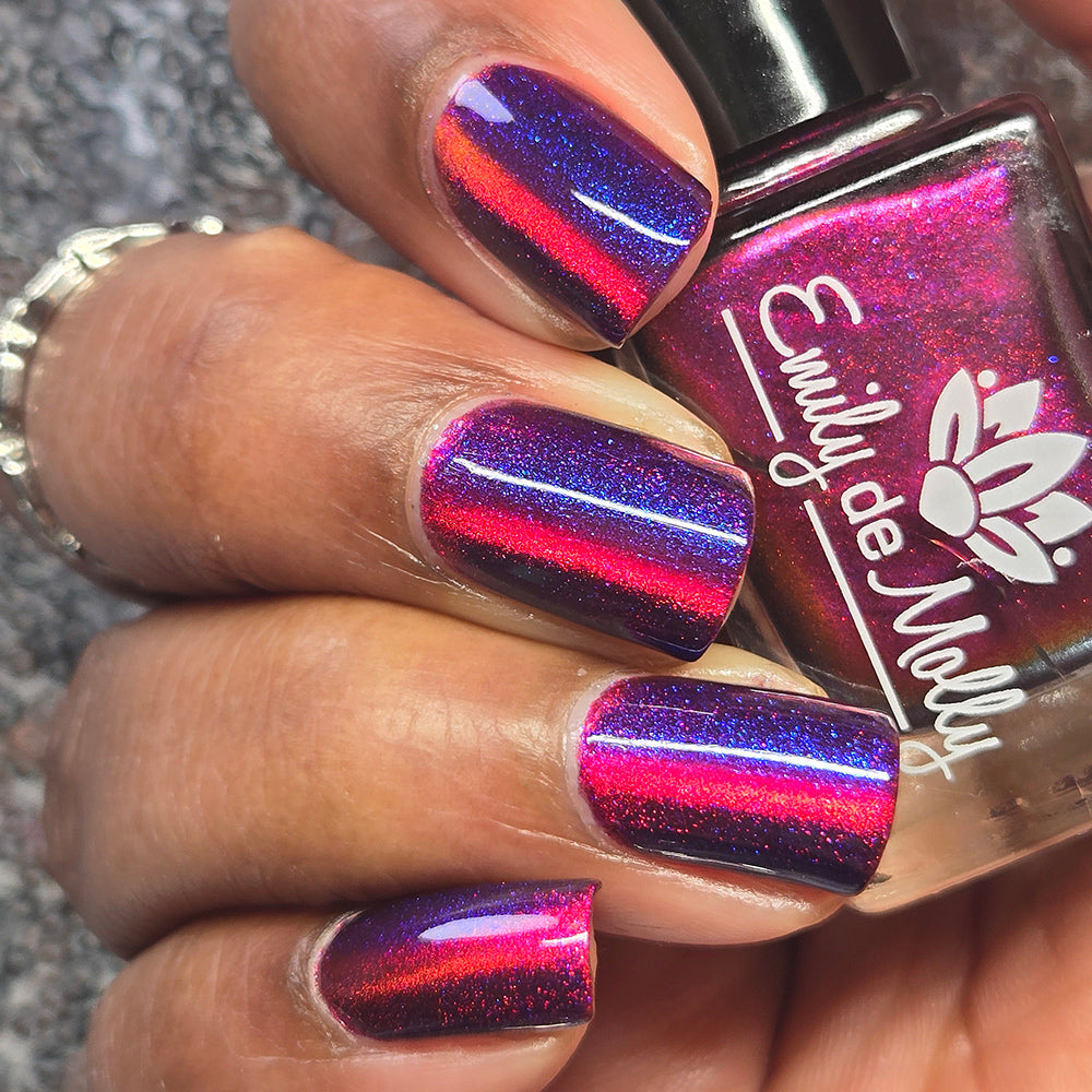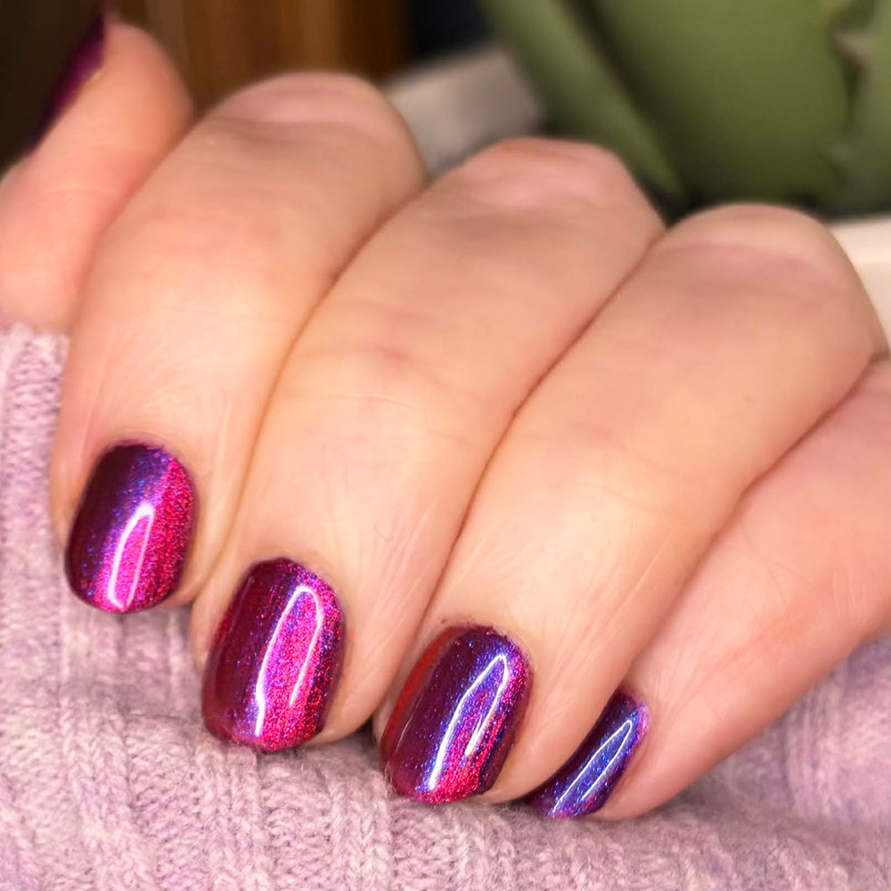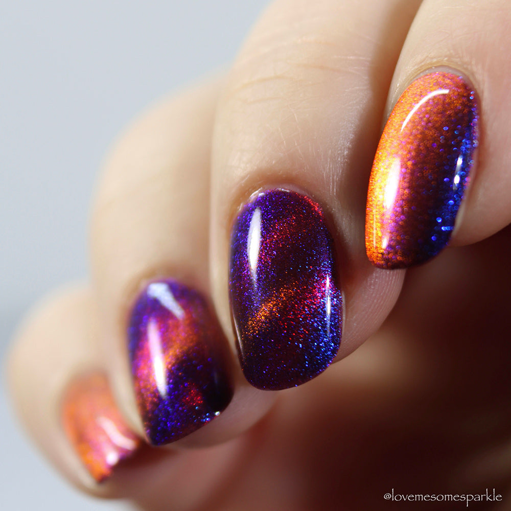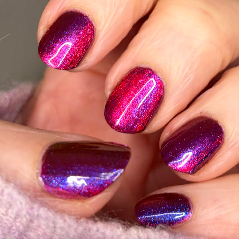 A deep purple nail polish with a blue aurora shimmer and a red to orange shifting magnetic effect.