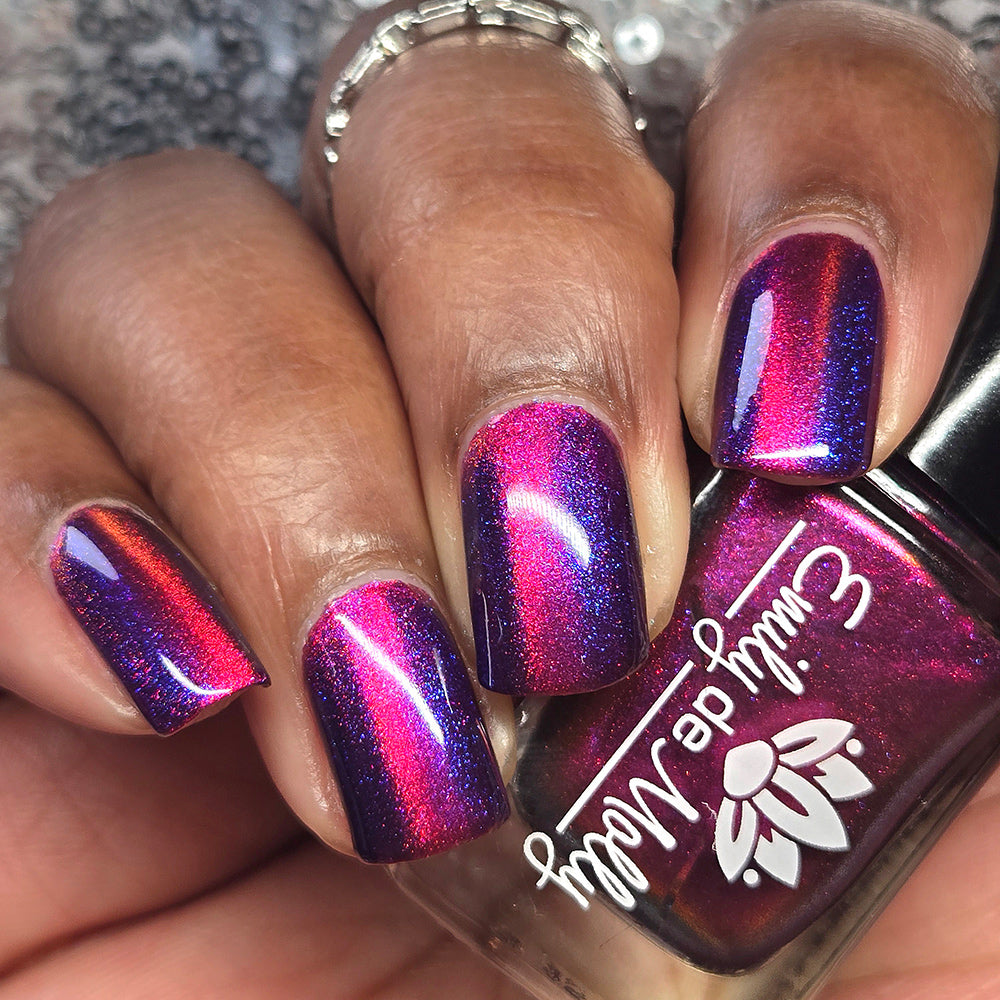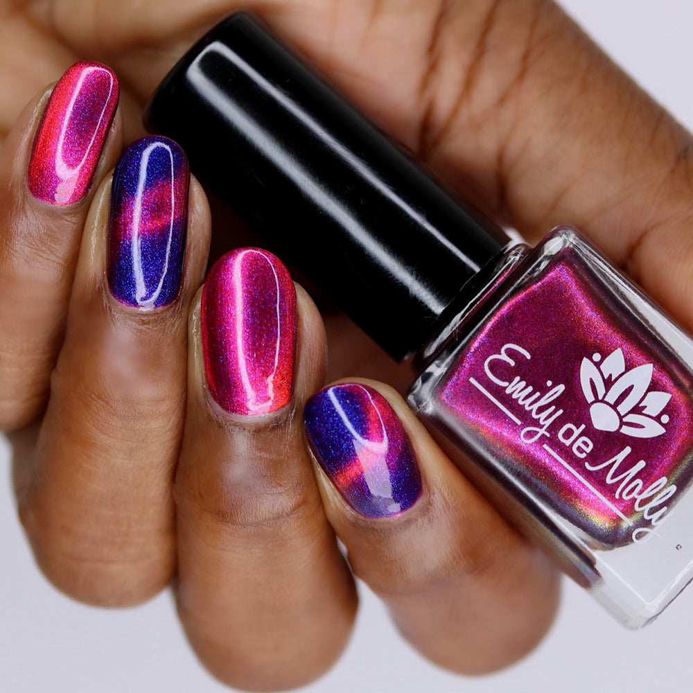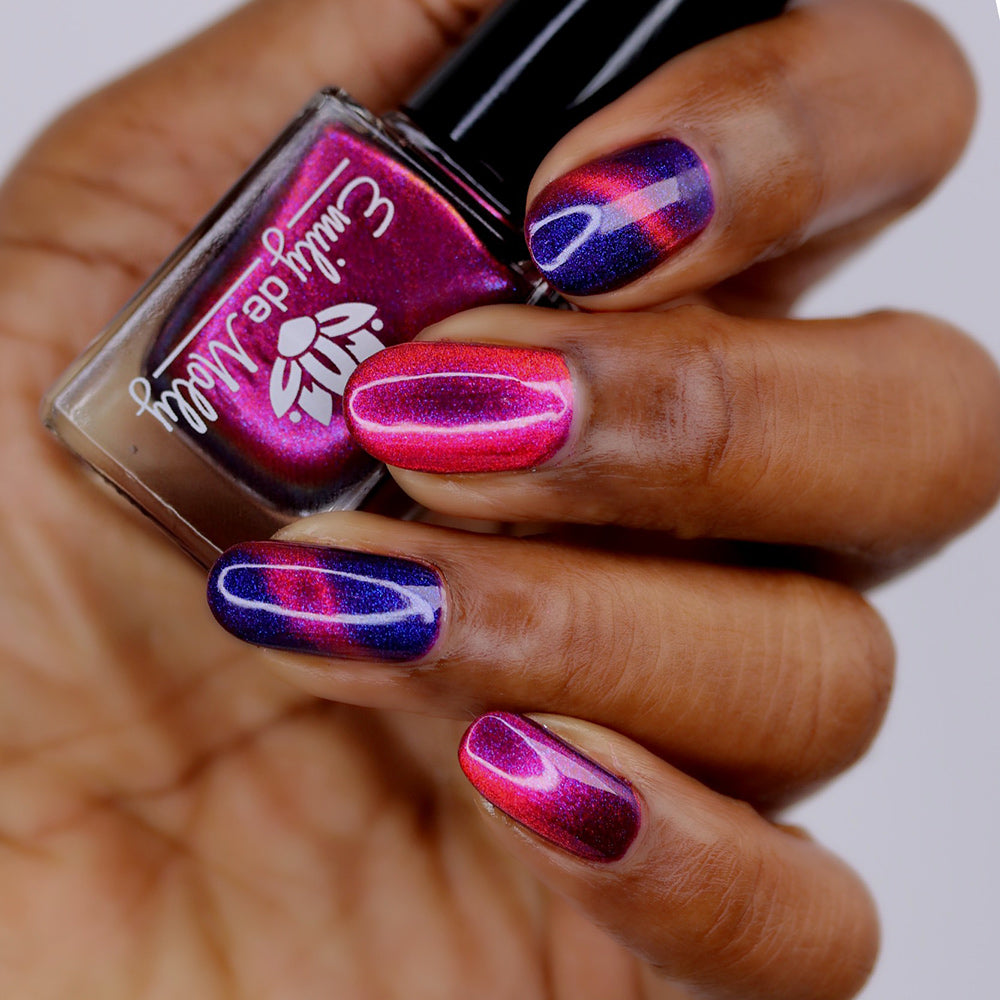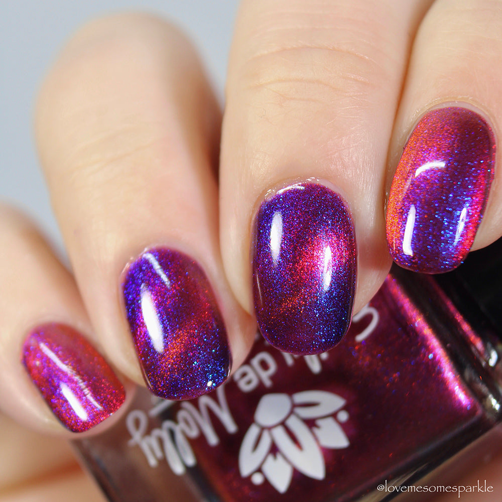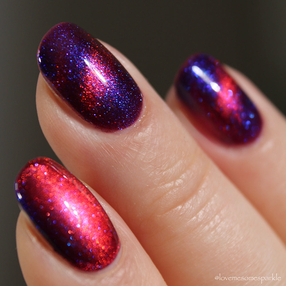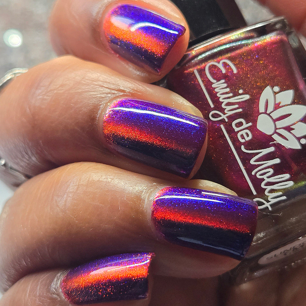 A deep purple nail polish with a blue aurora shimmer and a red to orange shifting magnetic effect.