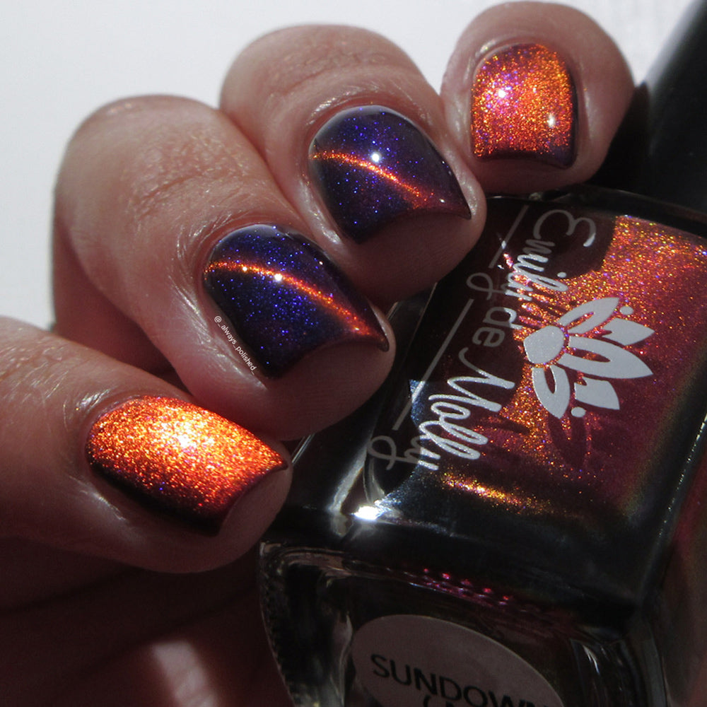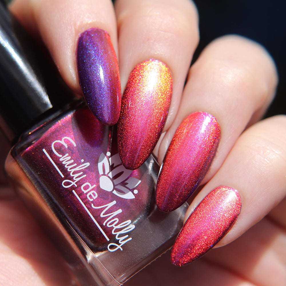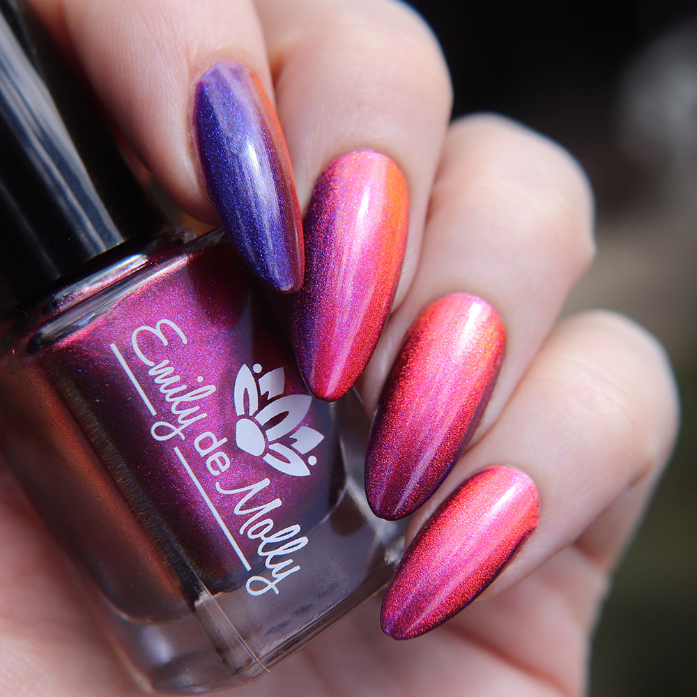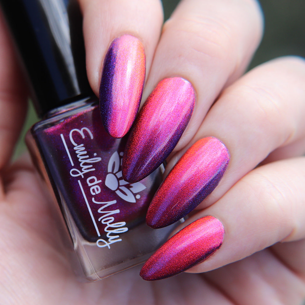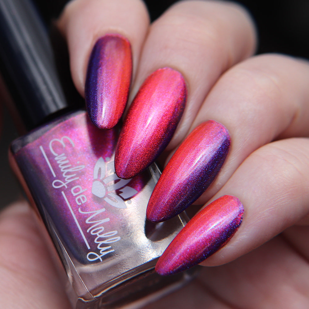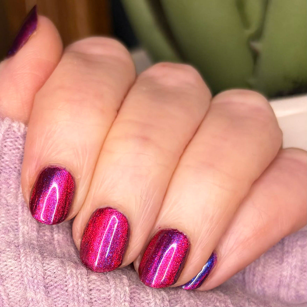 A deep purple nail polish with a blue aurora shimmer and a red to orange shifting magnetic effect.