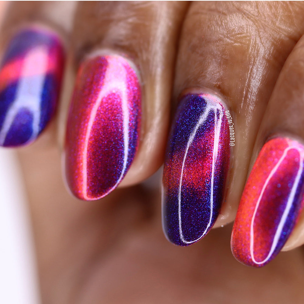3. It’s also important to remember that top coating a magnetic can have an undesired effect on your magnetic lines. Most topcoats will allow the magnetic particles to continue to move away over time. It can take up to a full 24 hours for all layers of nail lacquer to fully "cure" and because the magnetic pigments are heavier than the other ingredients, they will continue to move and settle during this drying time which is what causes the lines to blur. In saying that, most swatchers take their photos immediately after application so your end result will most likely not look like theirs.