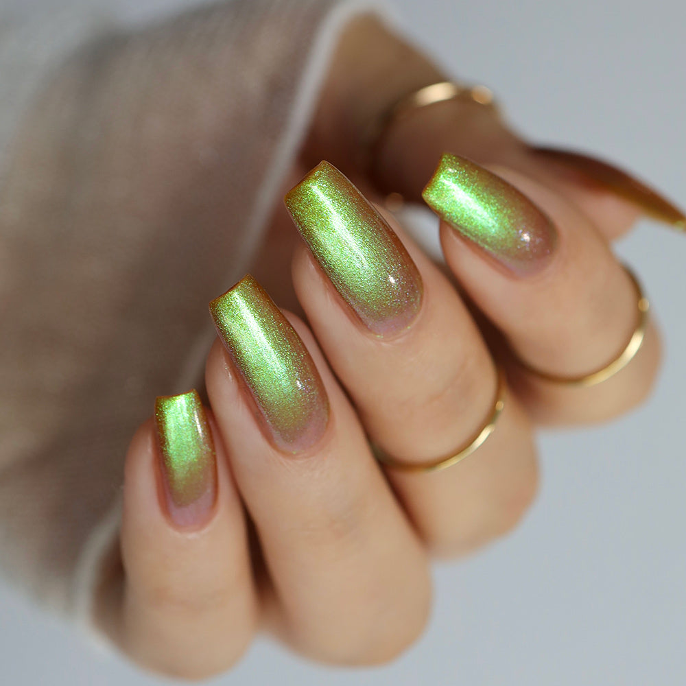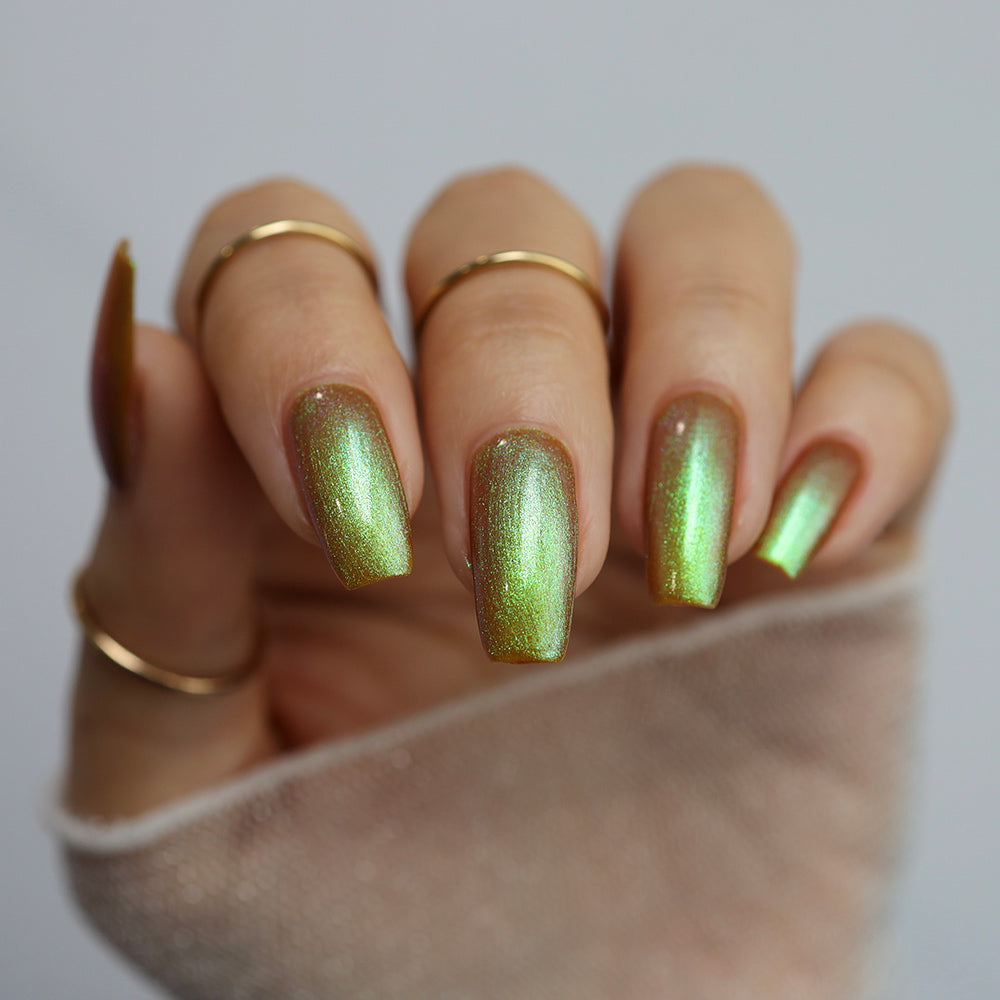 A grungy yellow nail polish with a strong green / light brown shifting shimmer.