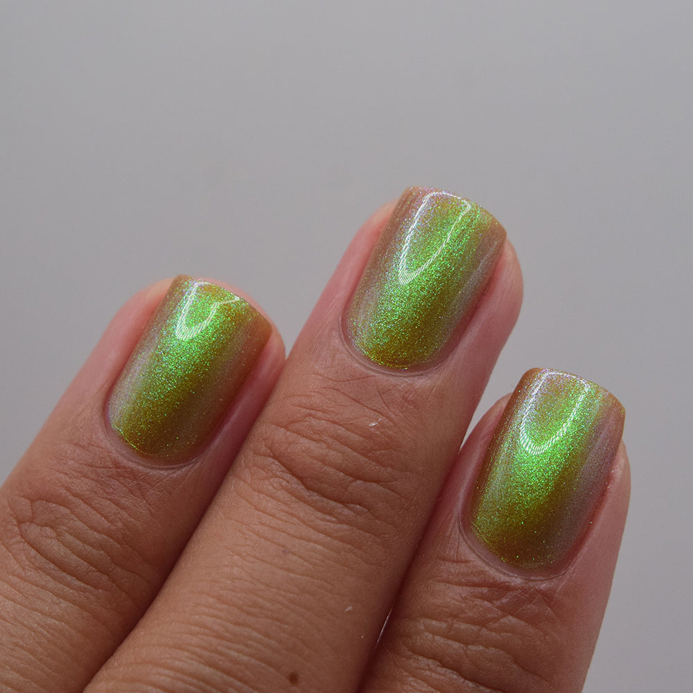 A grungy yellow nail polish with a strong green / light brown shifting shimmer.