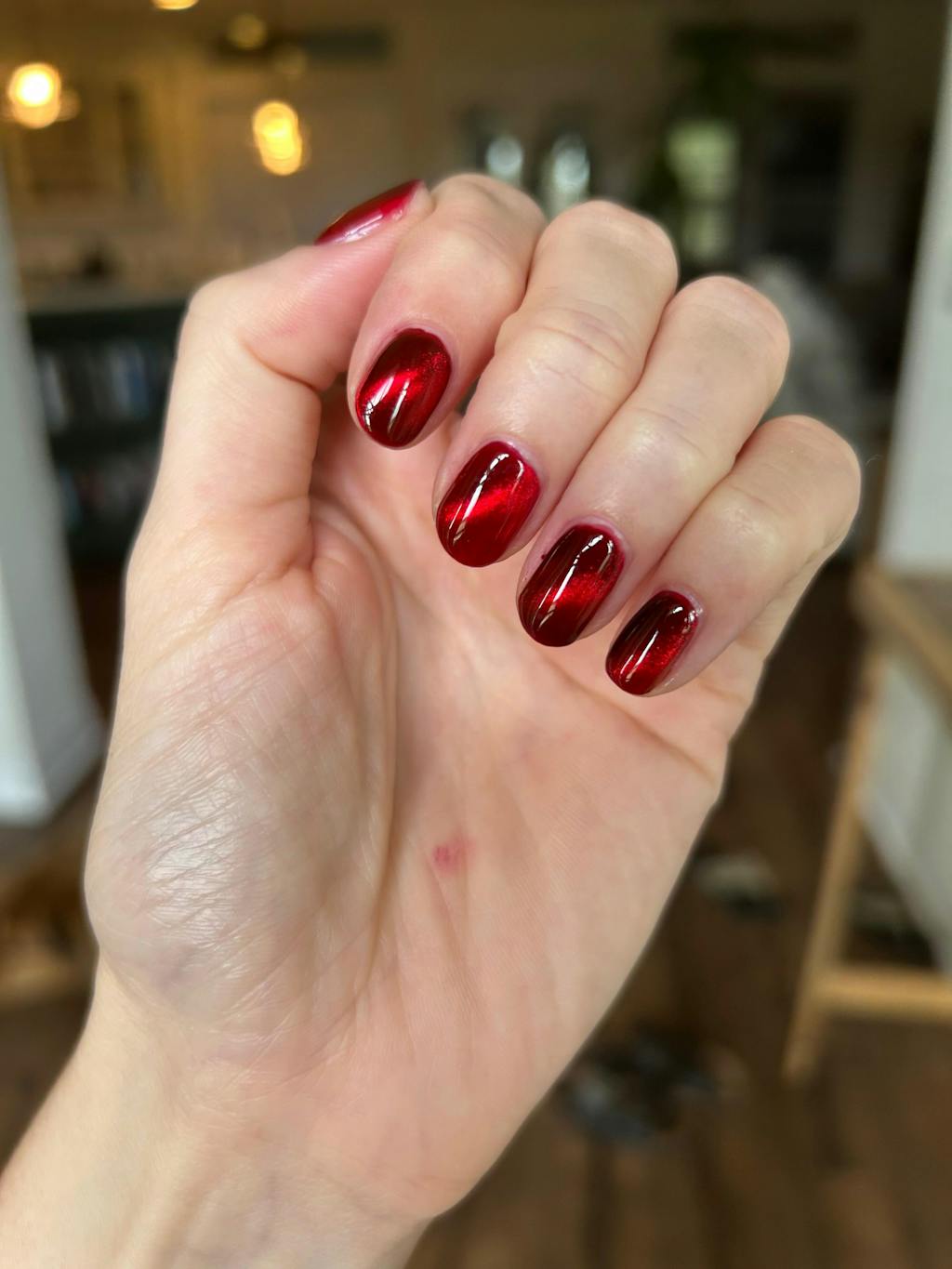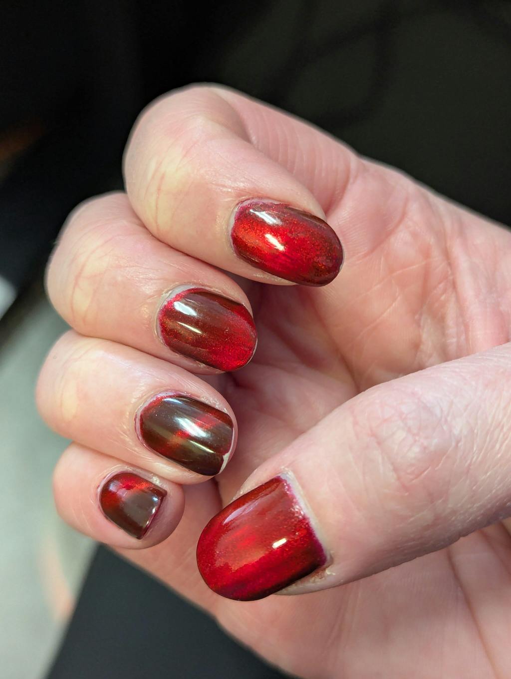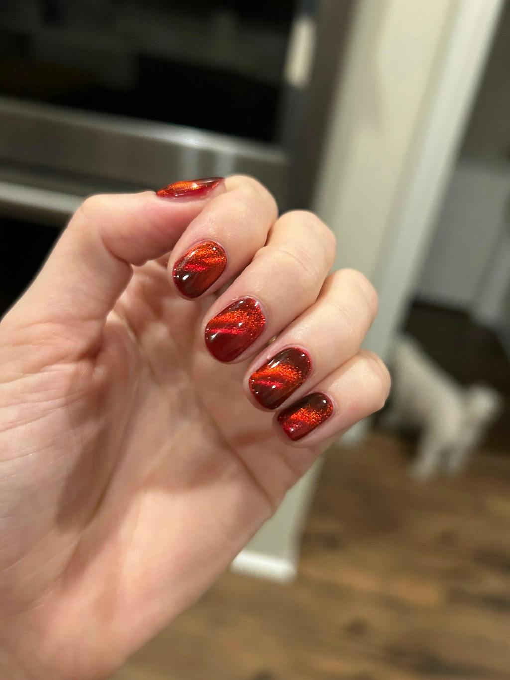 A deep red nail polish with a red to orange shifting magnetic effect.