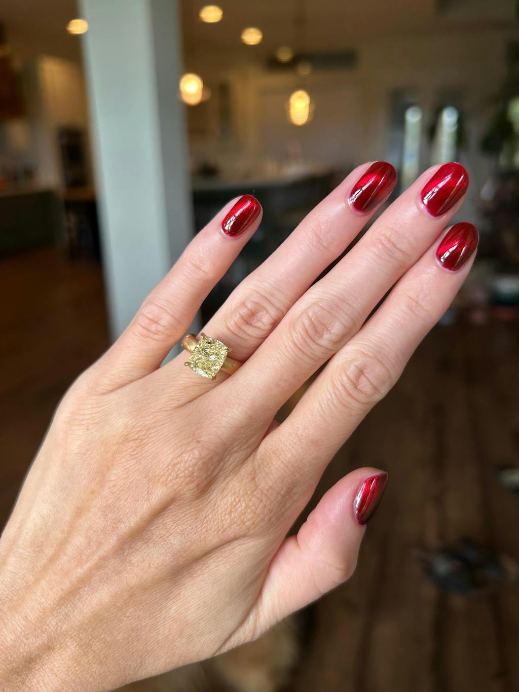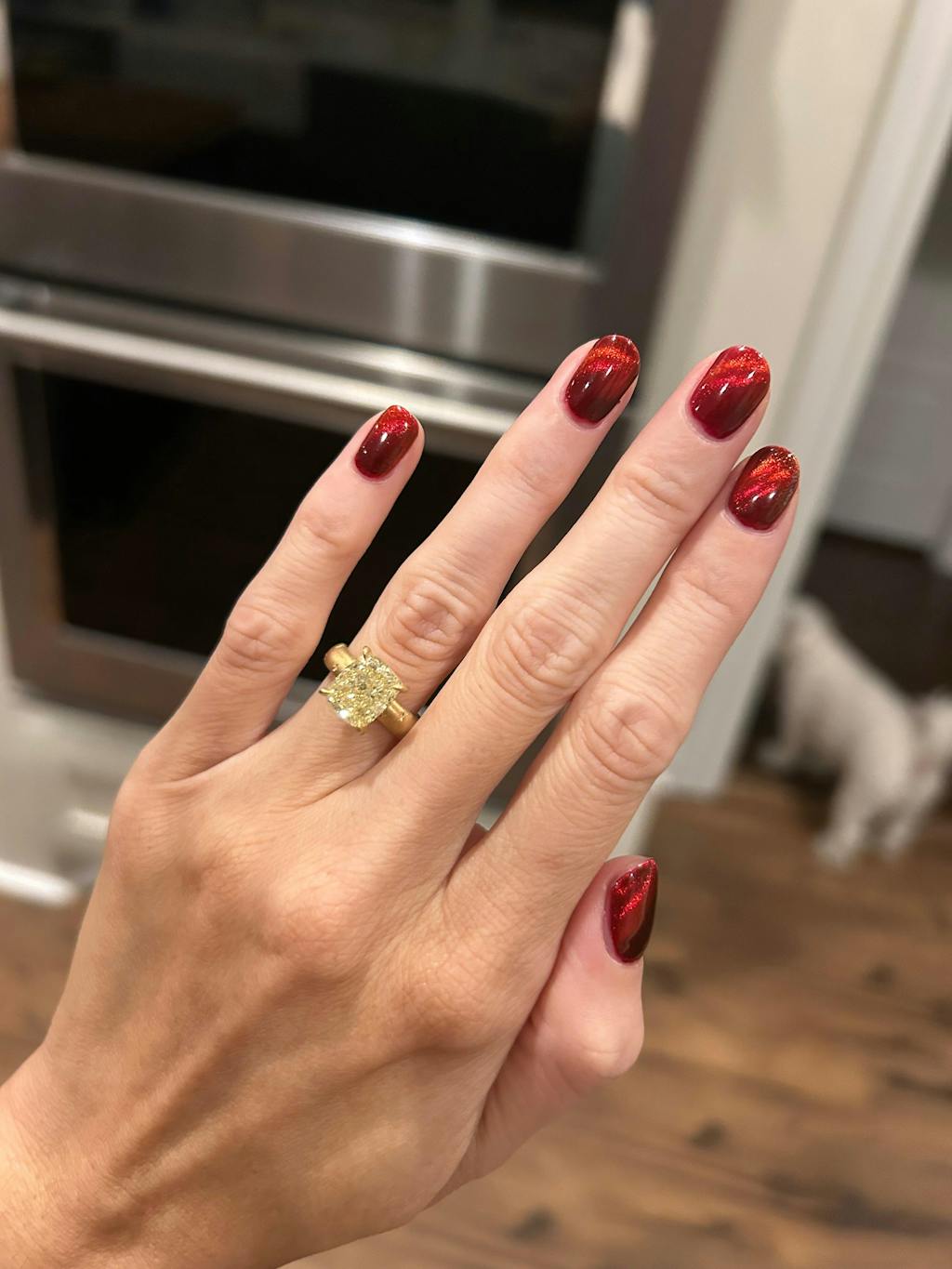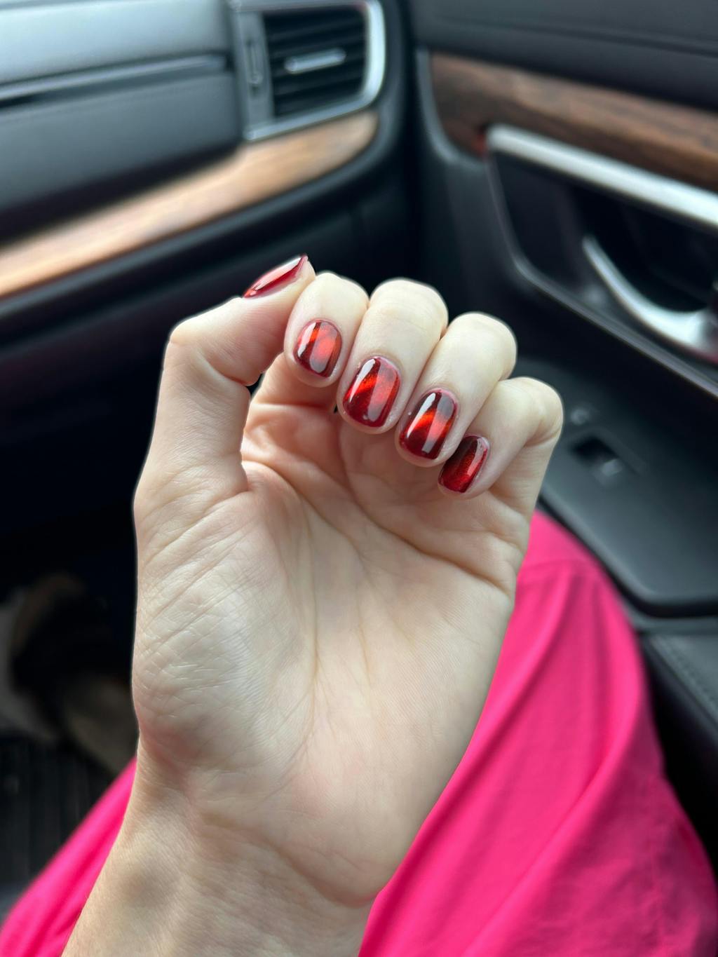 A deep red nail polish with a red to orange shifting magnetic effect.