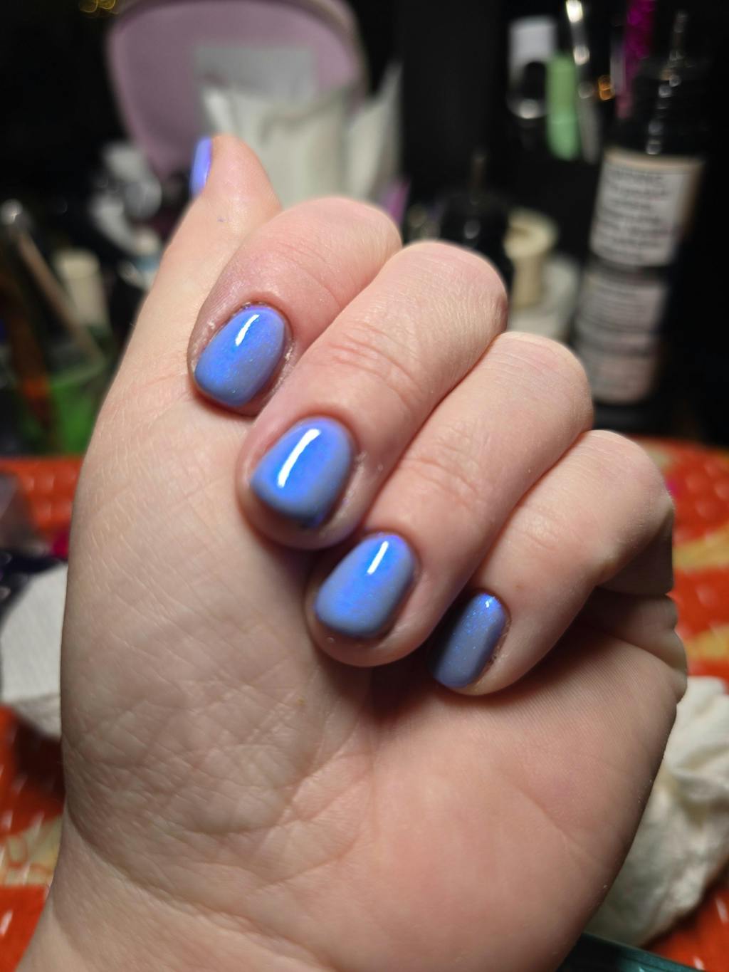 A thermal nail polish that shifts from a very light neutral ( warm ) to a deeper blue / purple ( cold ) with a blue aurora shimmer.