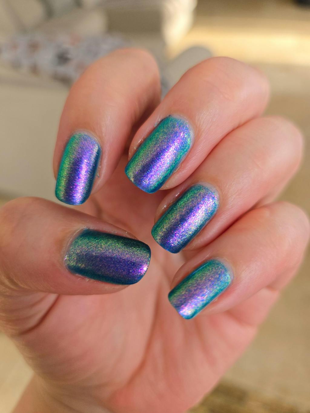 A beautiful blue nail polish with a pink / green / blue shifting large particle shimmer.