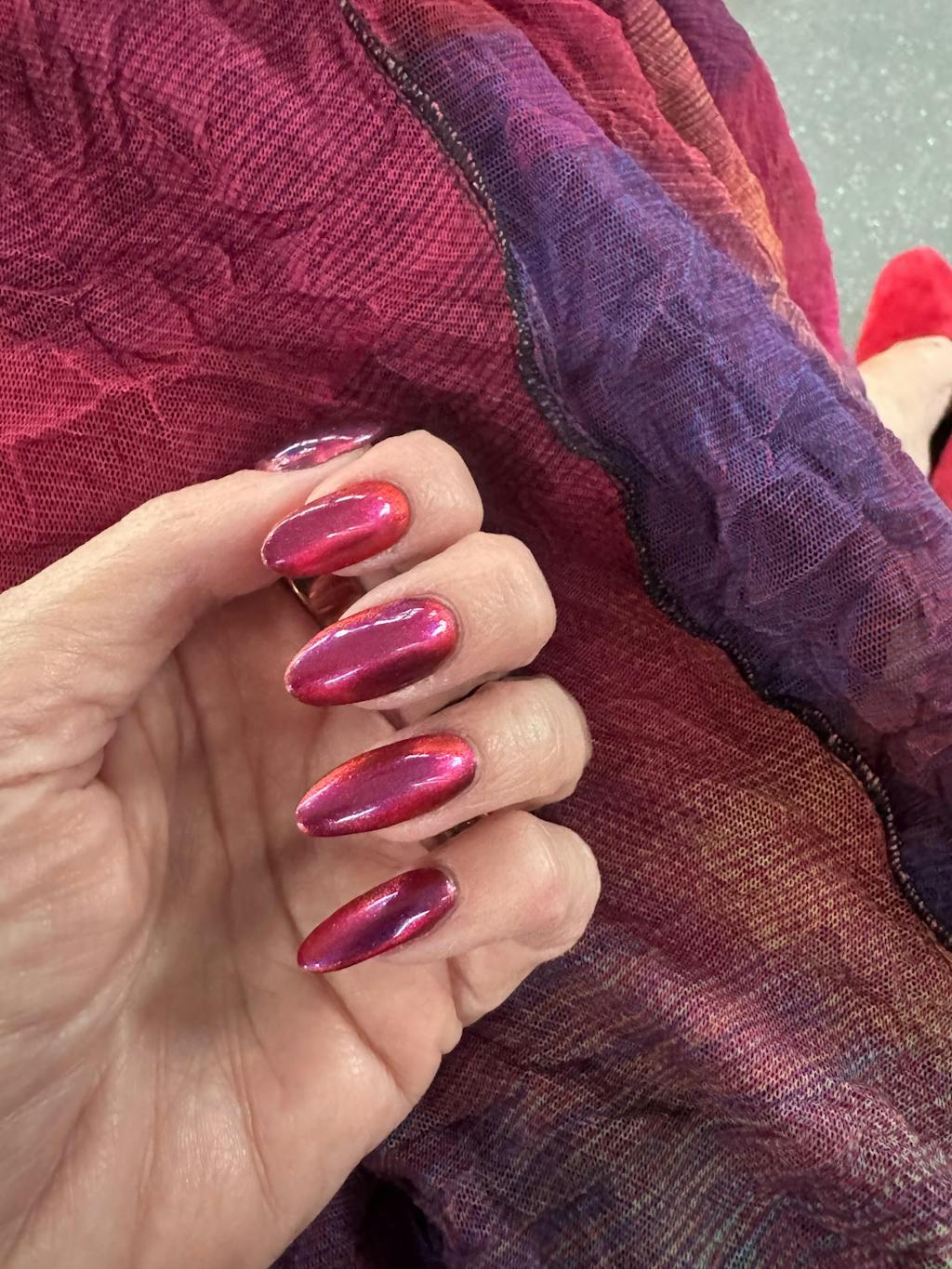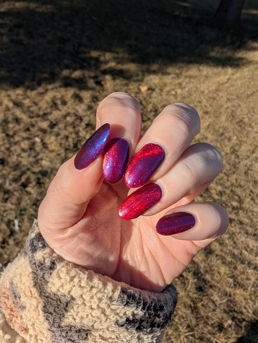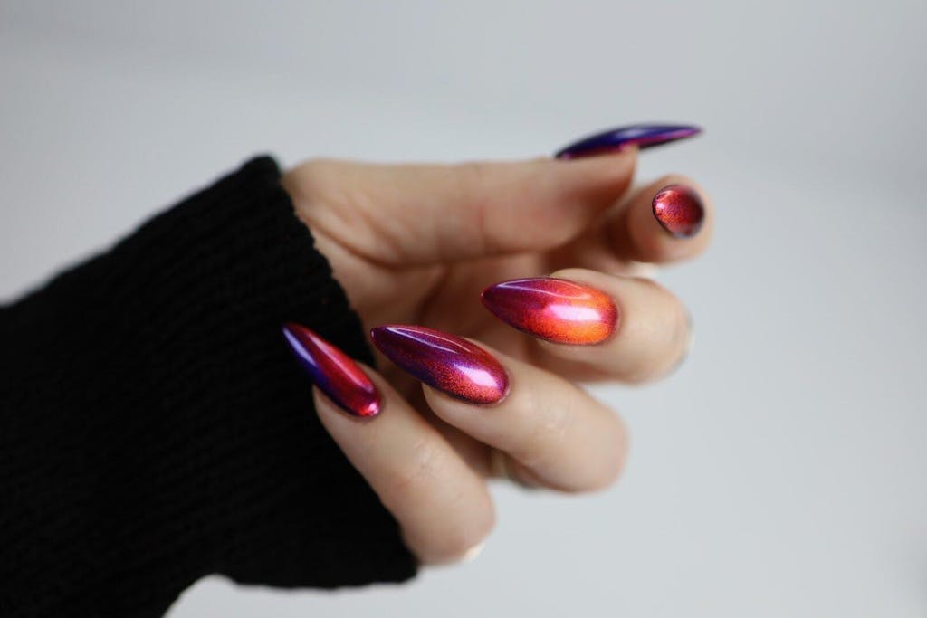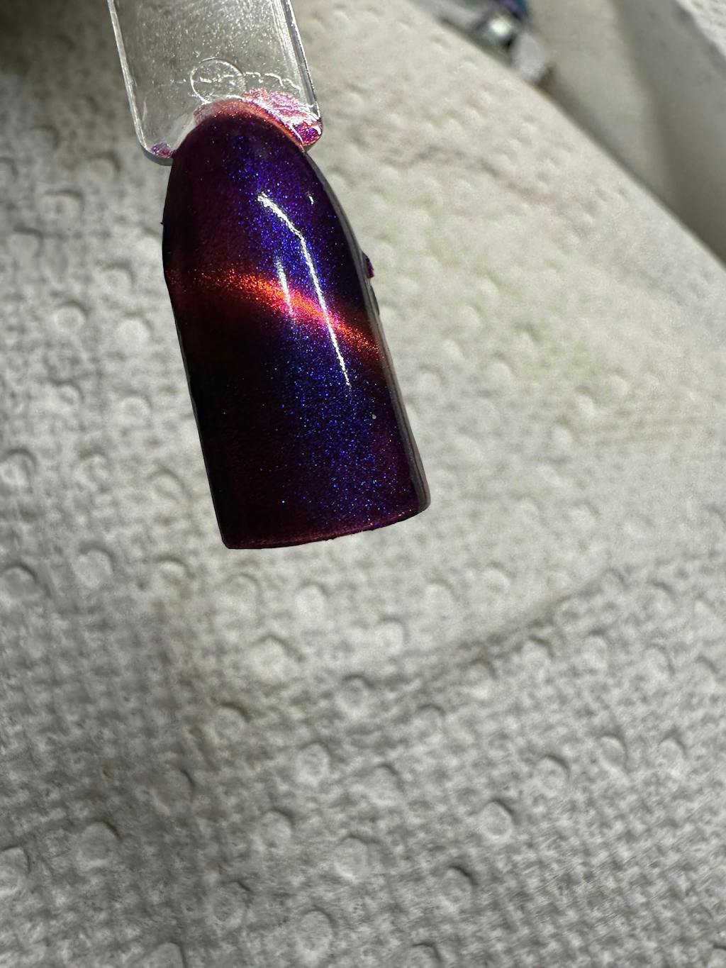 A deep purple nail polish with a blue aurora shimmer and a red to orange shifting magnetic effect.