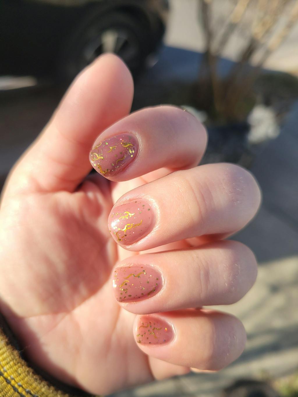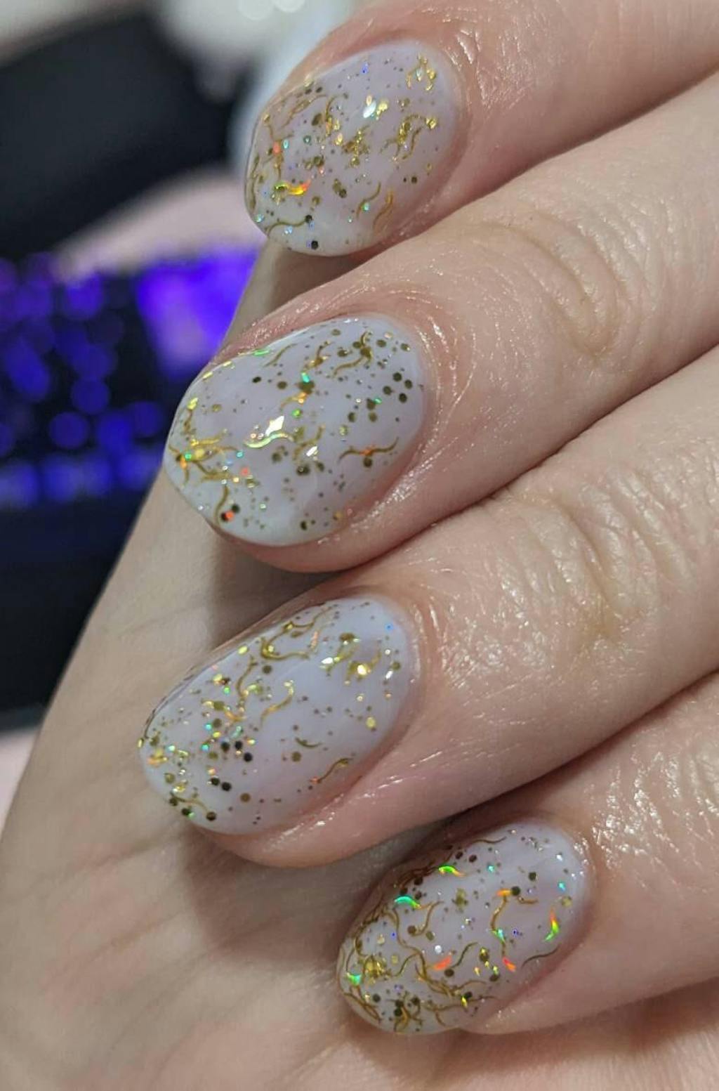 A clear glitter topper filled with gold holographic wave shaped glitters and gold hex glitters.