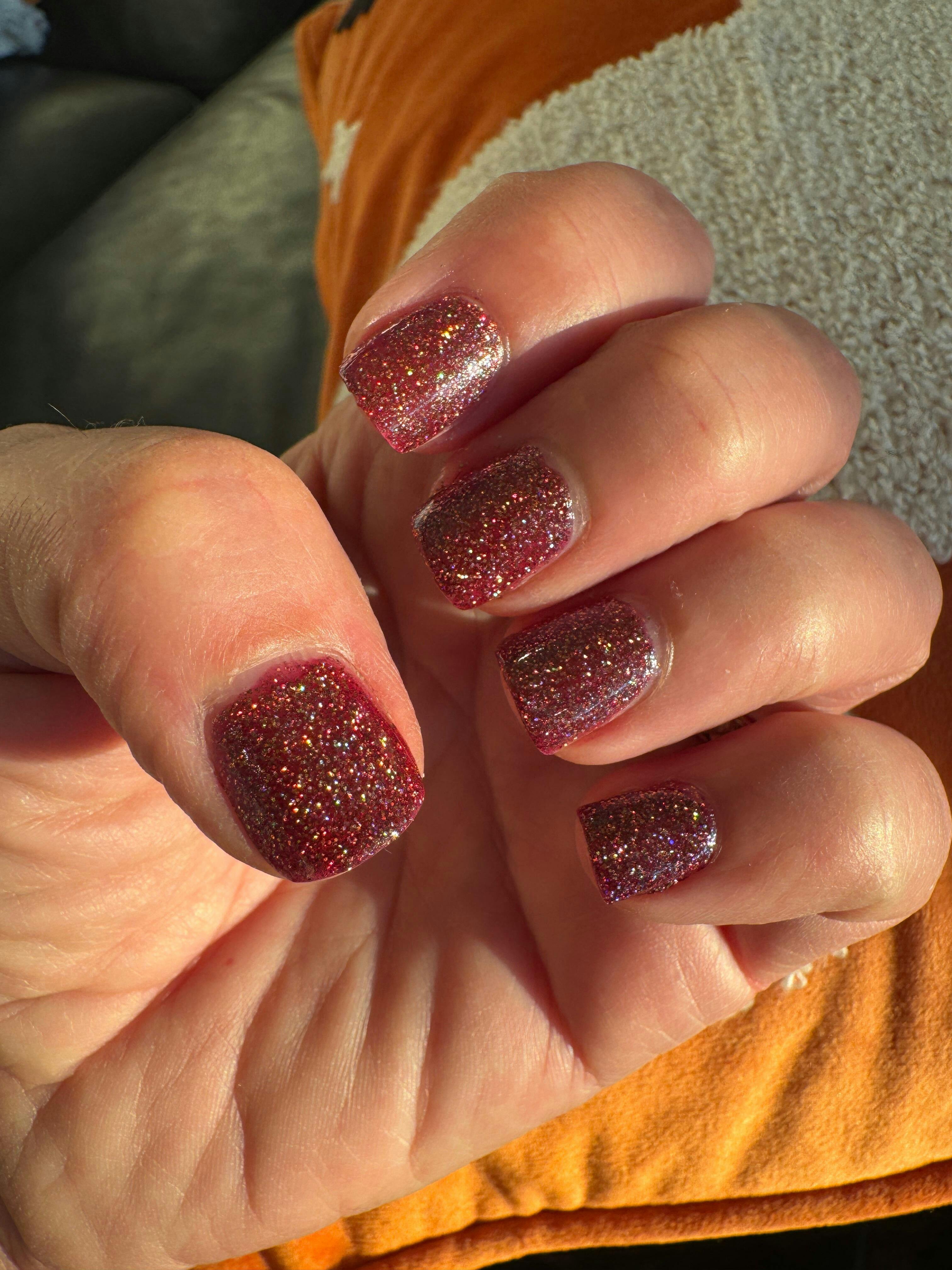 A burgundy brown nail polish with gold holographic glitters and an olive green to blue shifting shimmer.Opaque in 2 - 3 coats depending on your application, top coat recommended for a glossy finish.