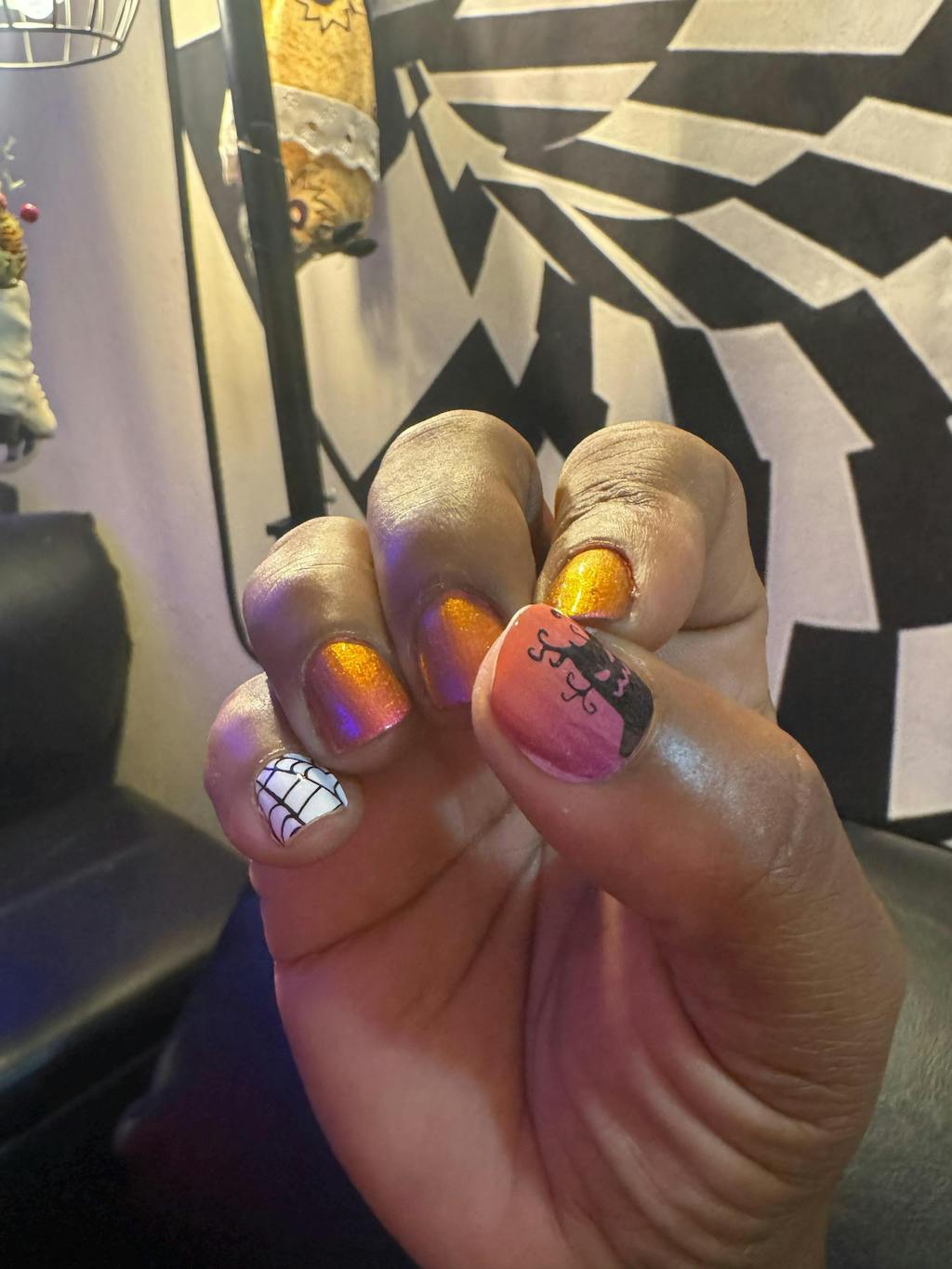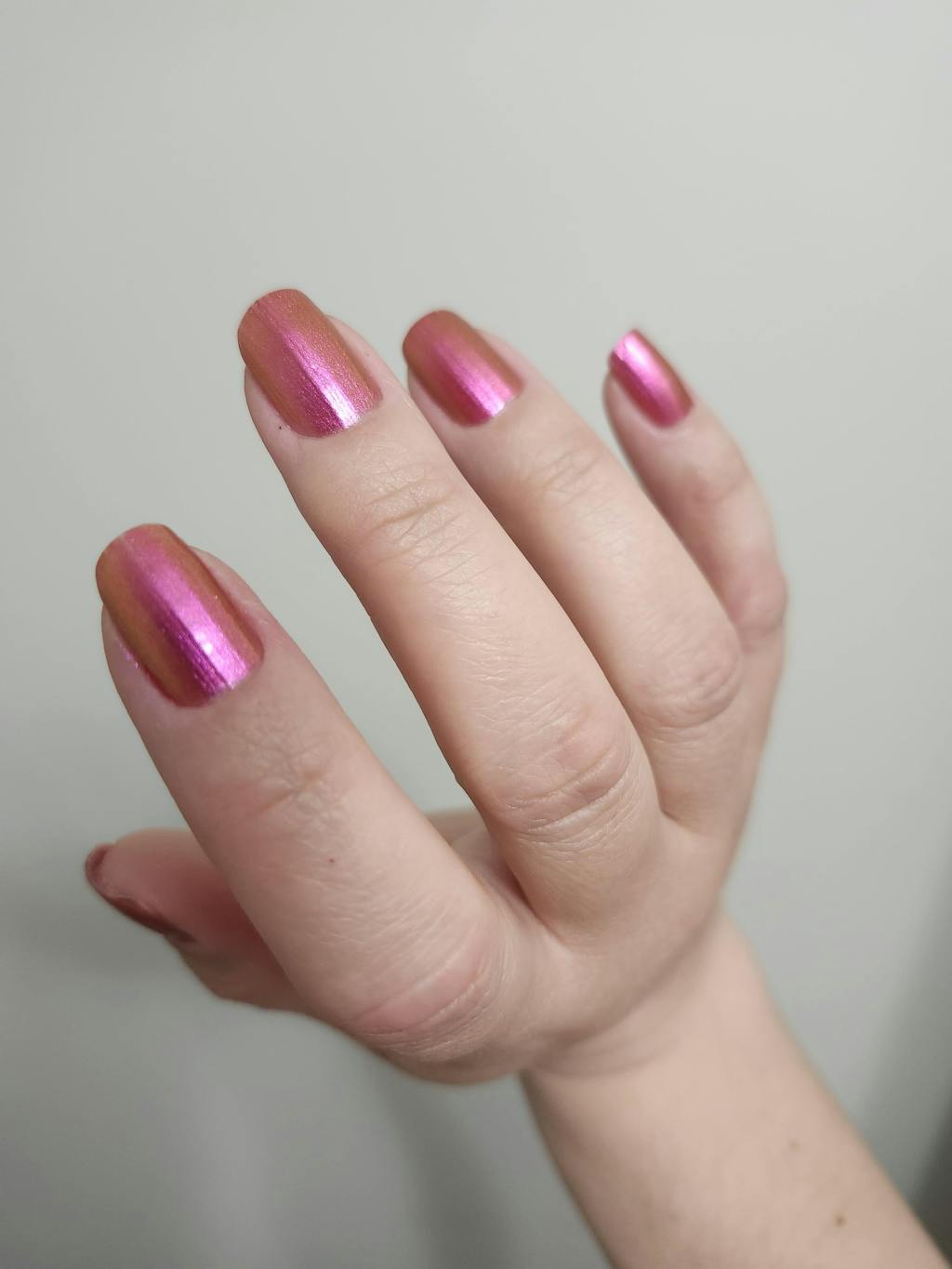 A multichrome nail polish that shifts through shades of pinks and oranges.