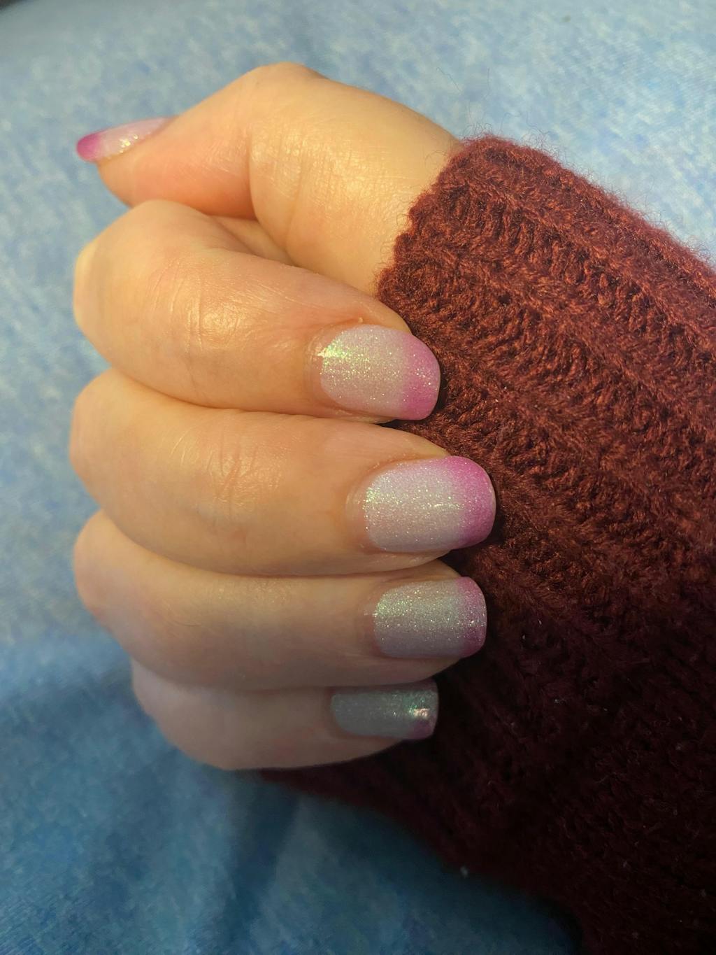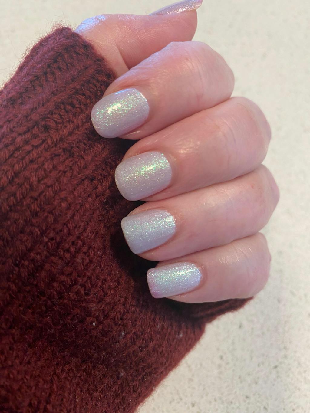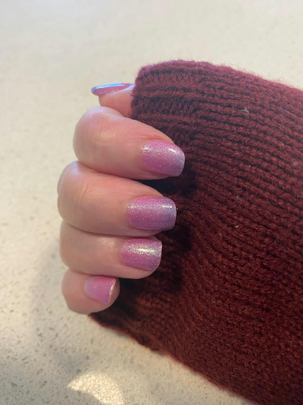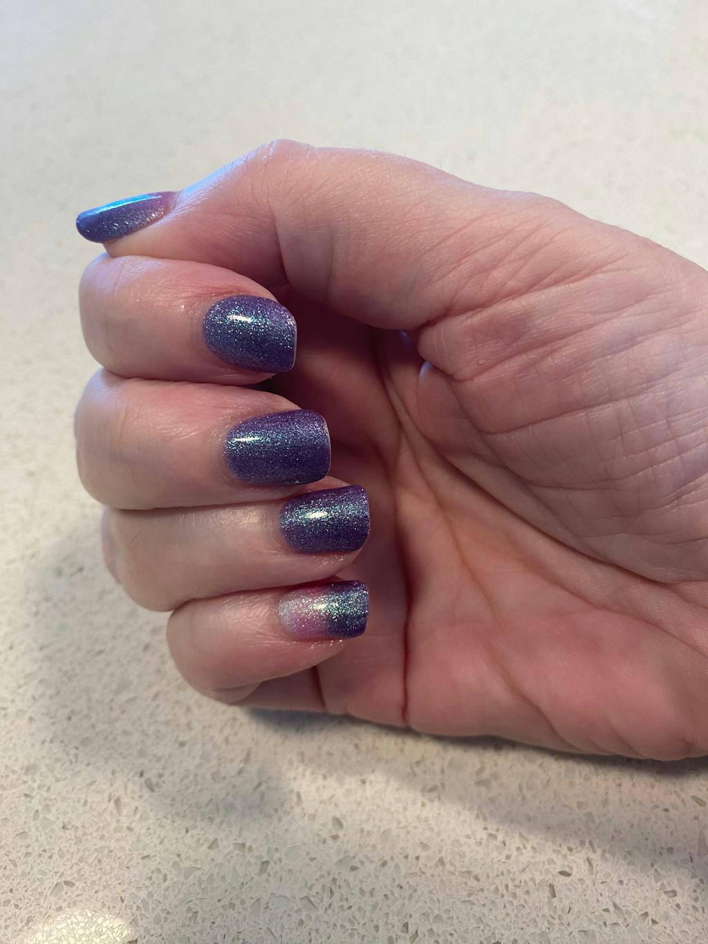 A thermal nail polish that shifts from a white ( warm ) to a pink and then to a darker purple ( cold ) with a green large particle shimmer.