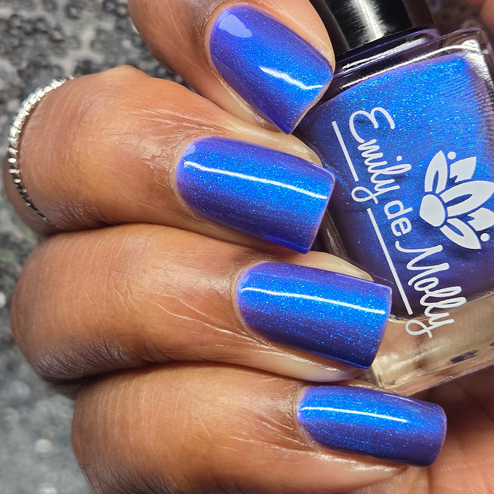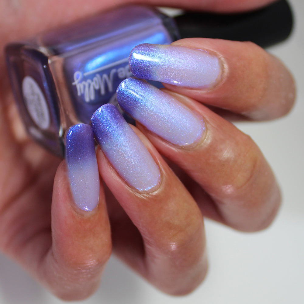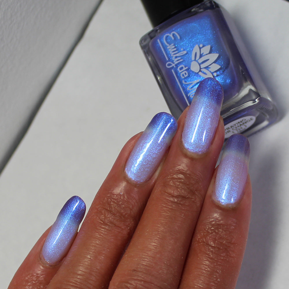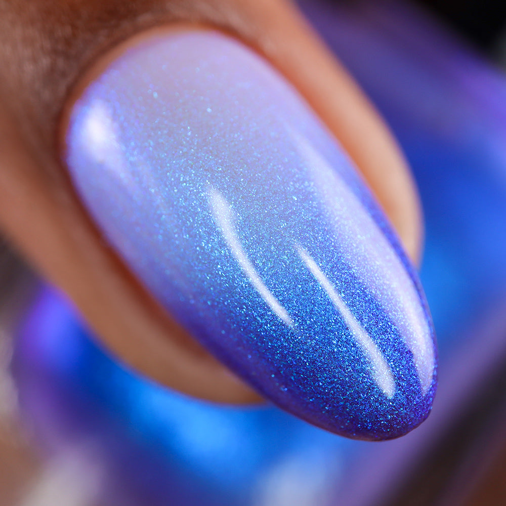 A thermal nail polish that shifts from a very light neutral ( warm ) to a deeper blue / purple ( cold ) with a blue aurora shimmer.