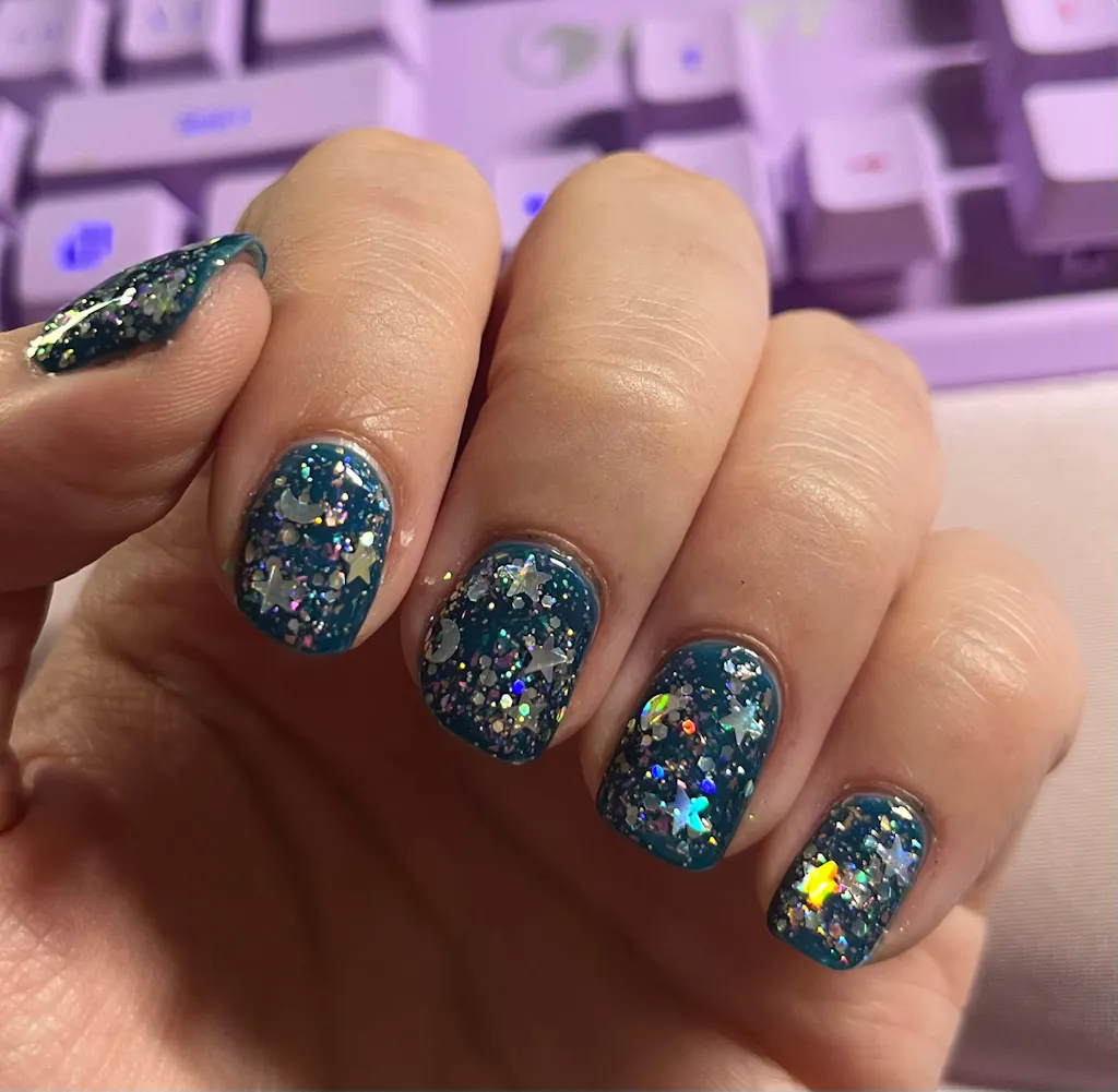 A clear glitter topper filled with silver holographic glitters including stars and moons and assorted iridescent flakes.