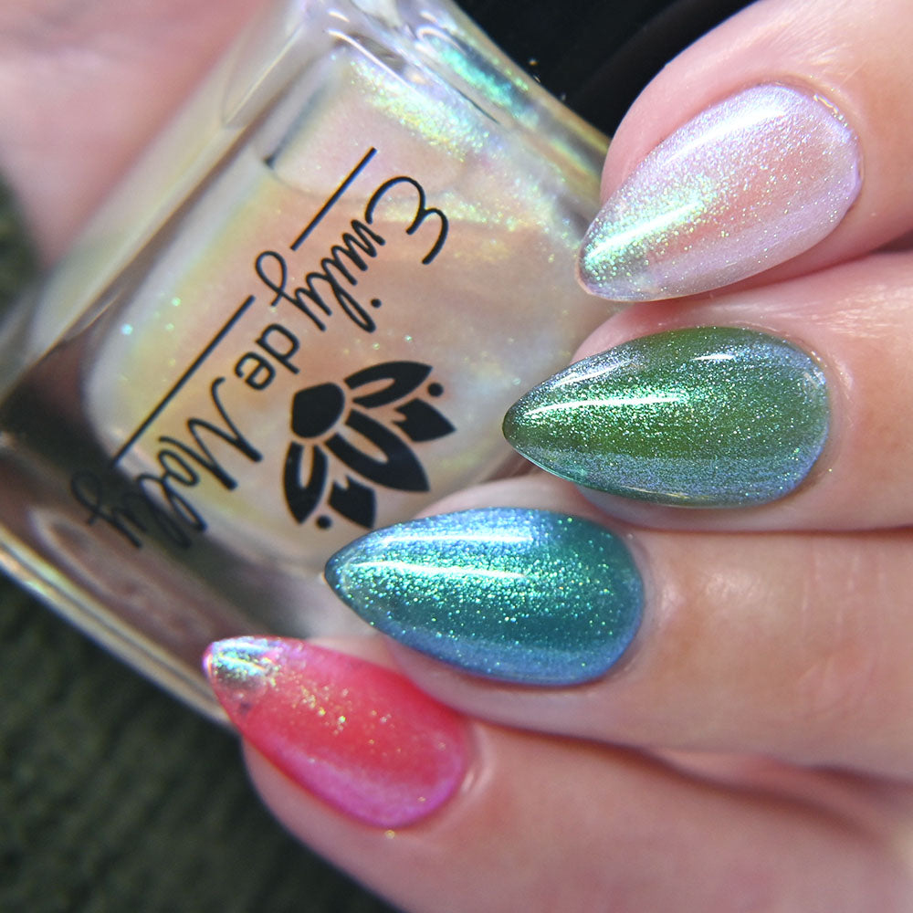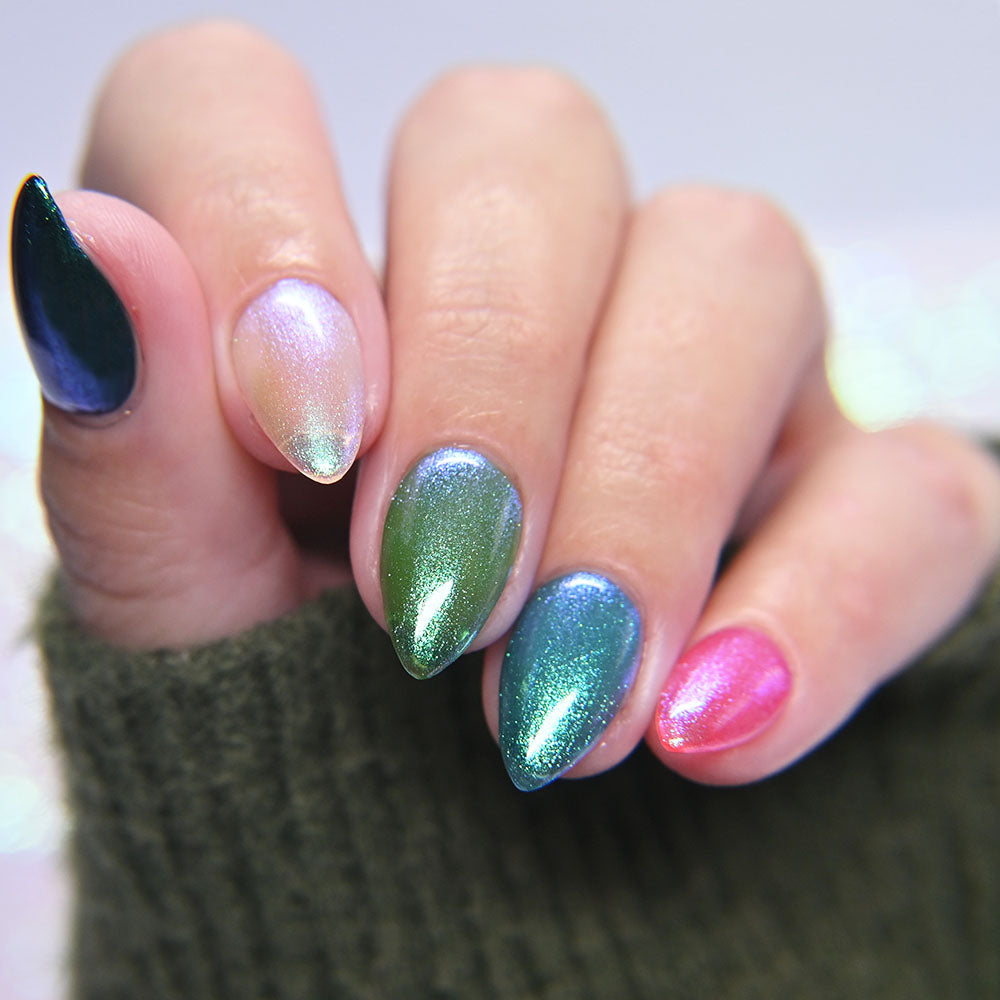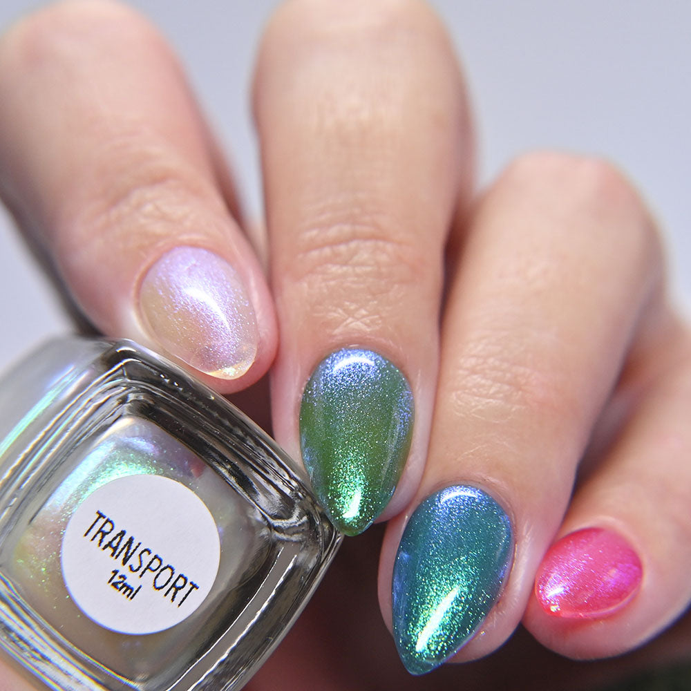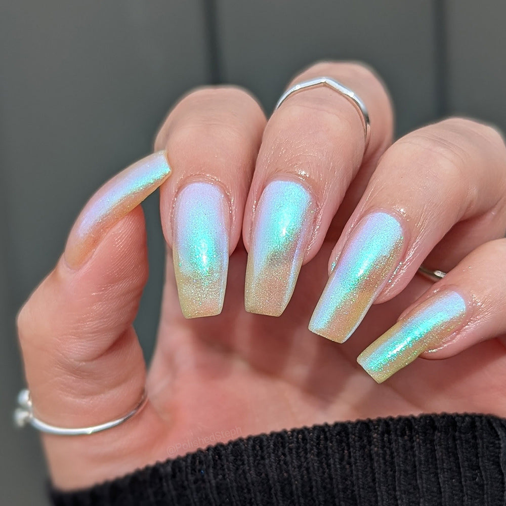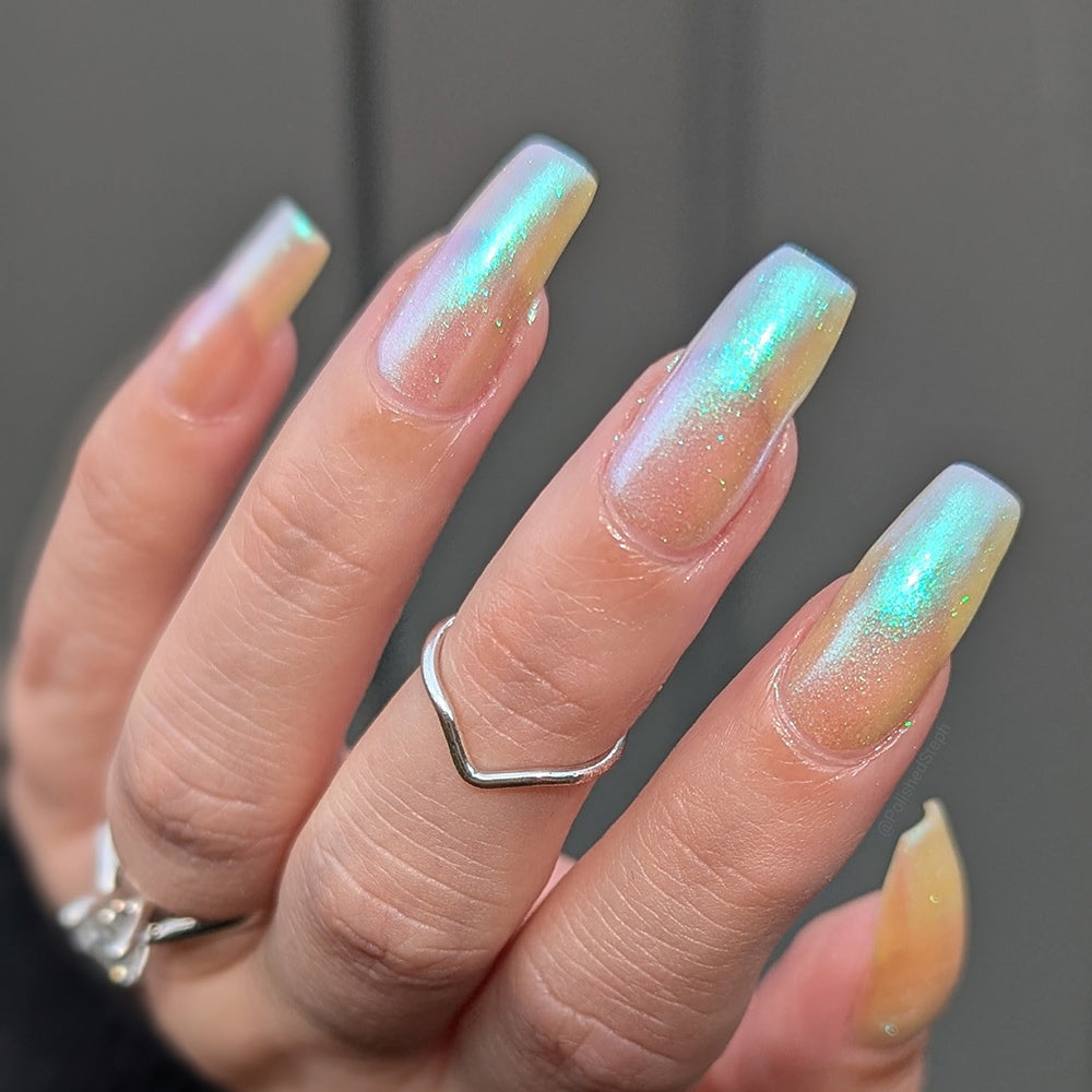 A clear nail polish with a strong green aurora shimmer.