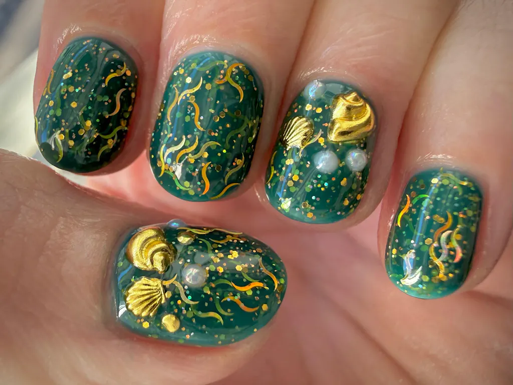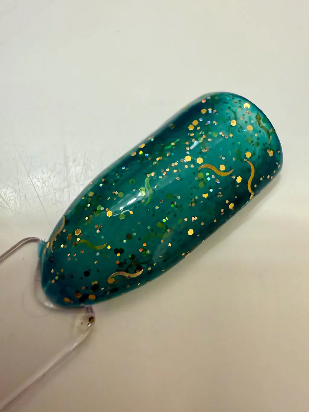 A clear glitter topper filled with gold holographic wave shaped glitters and gold hex glitters.